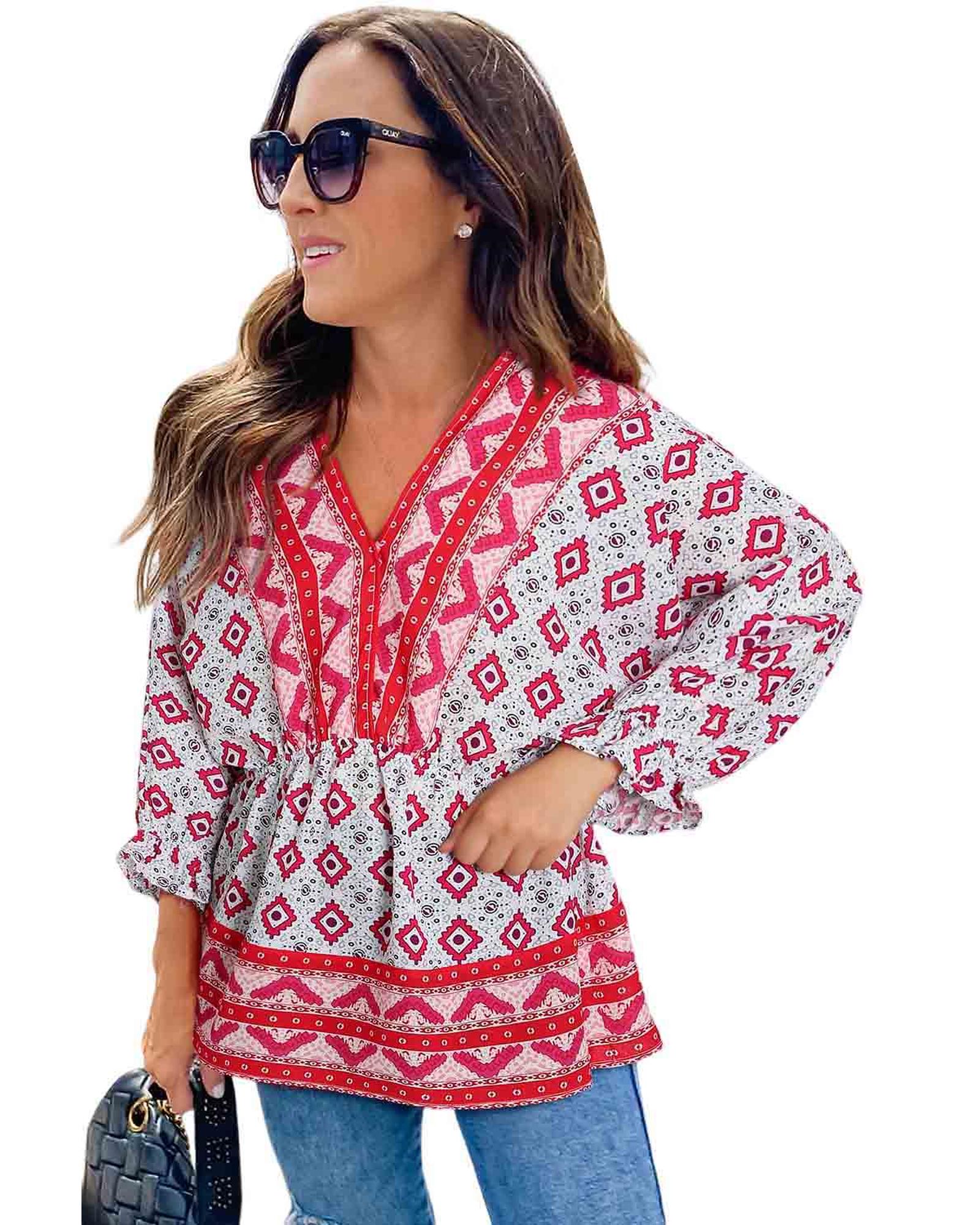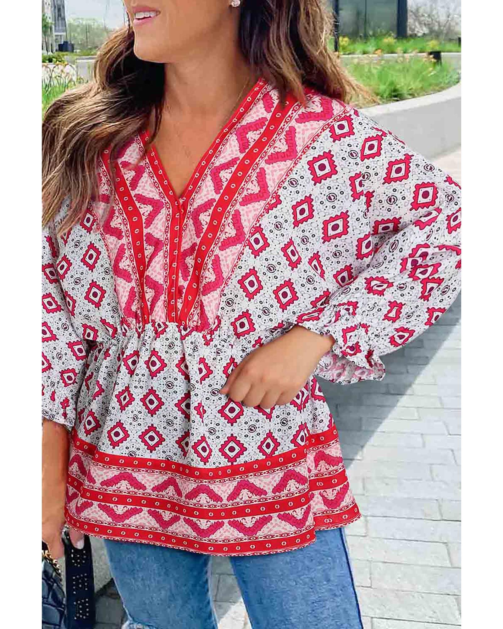 Red Geometric Print 3/4 Sleeve V-Neck Shirred Waist Flared Blouse – M