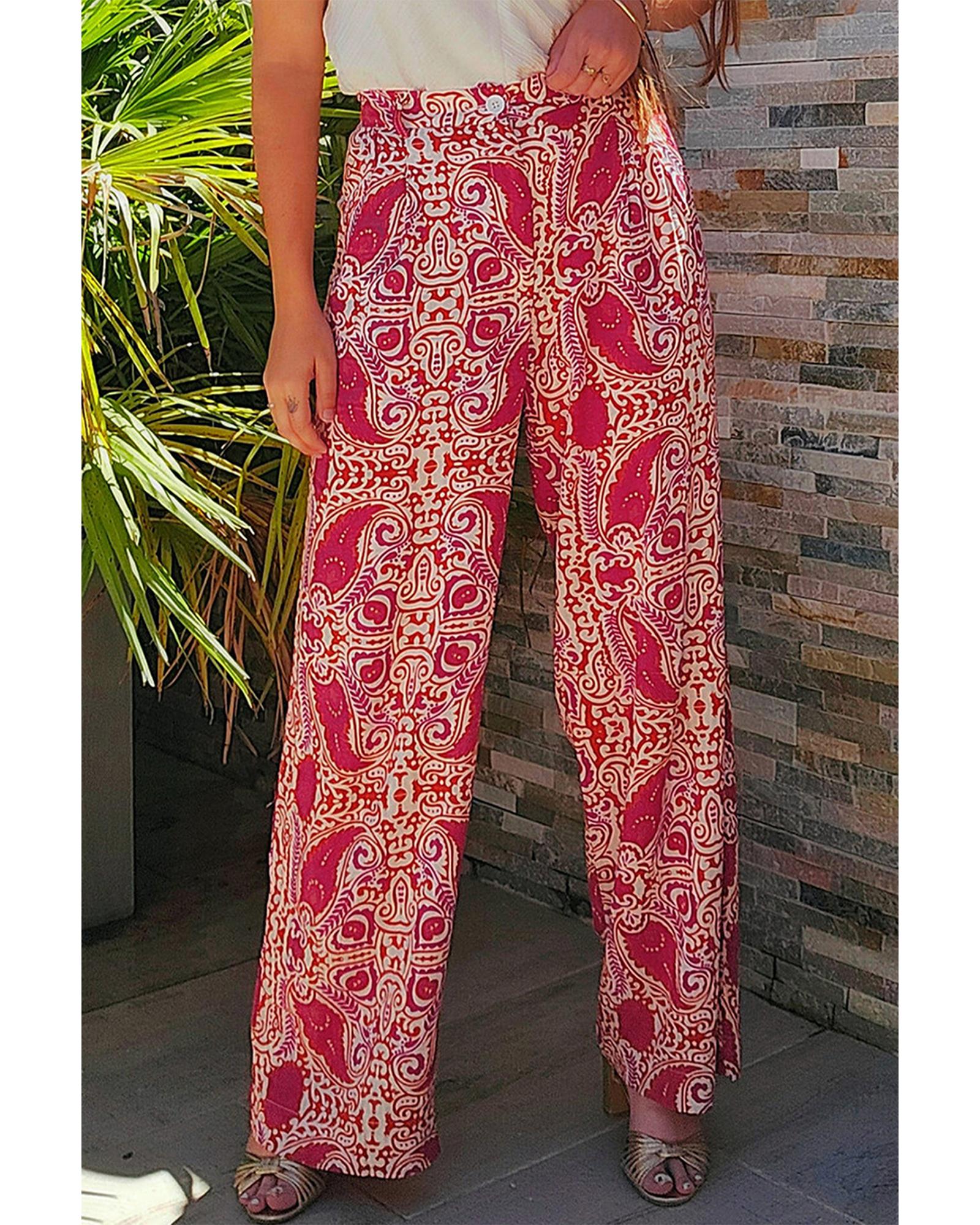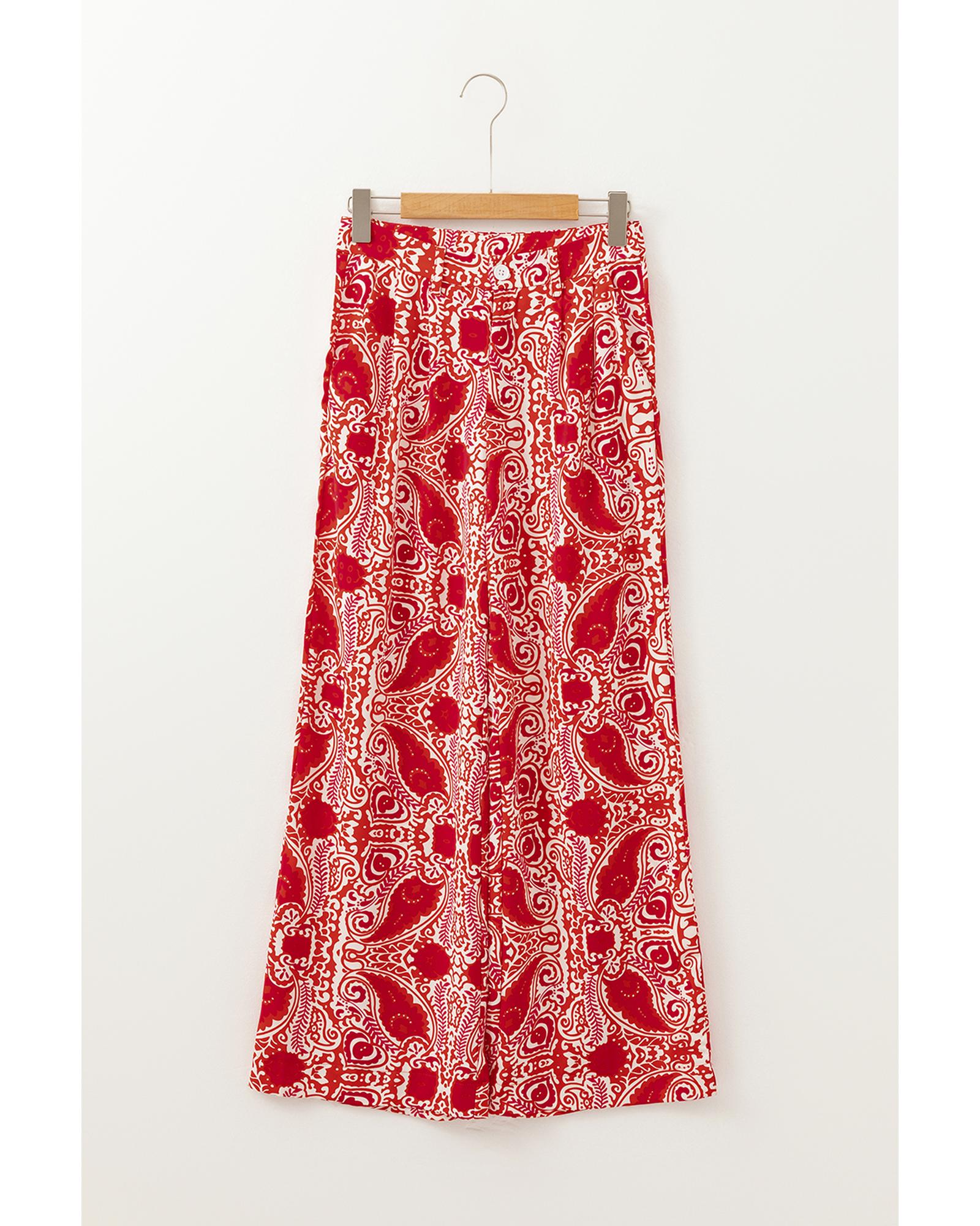 Red Paisley Printed Buttoned High Waist Straight Leg Pants – L