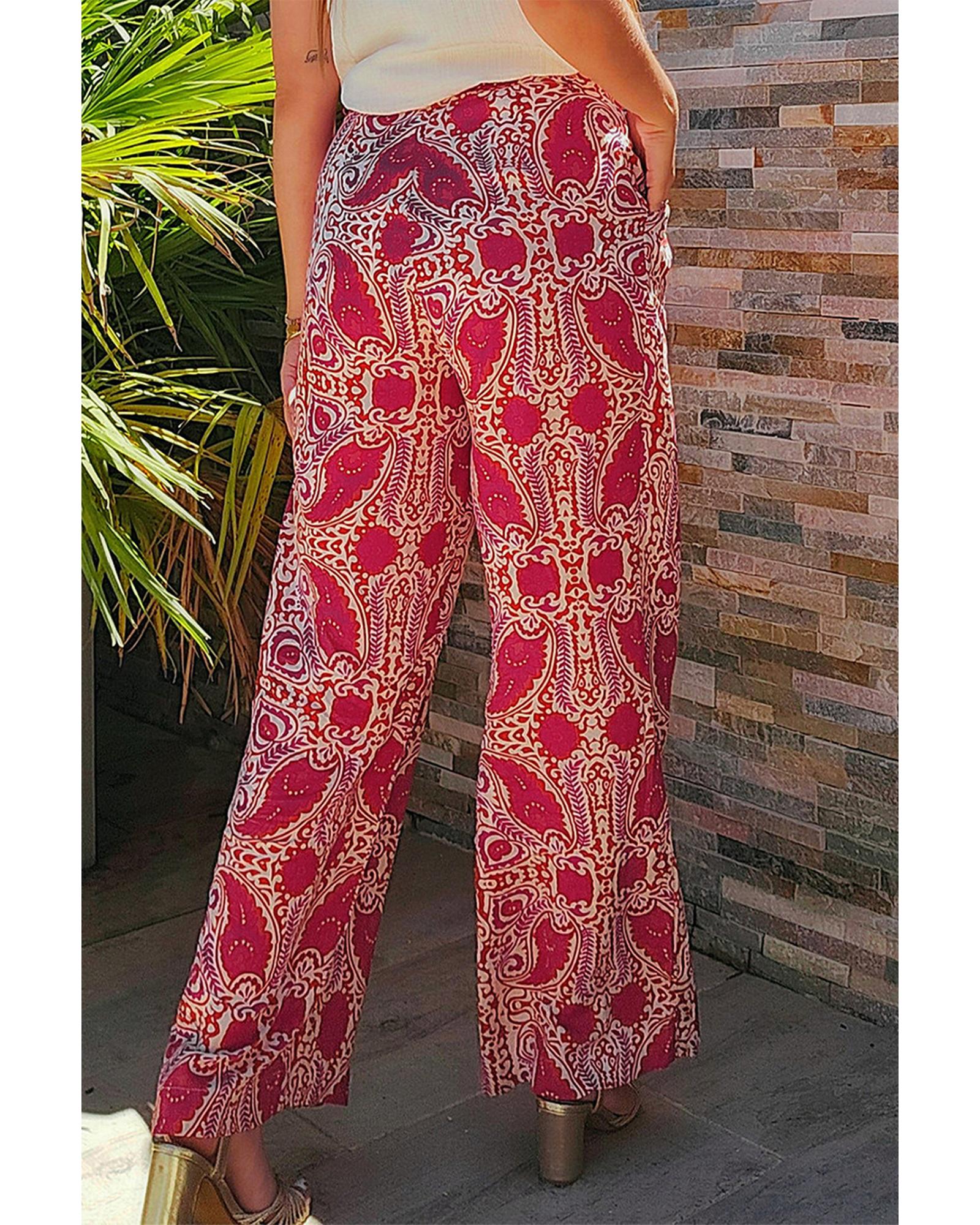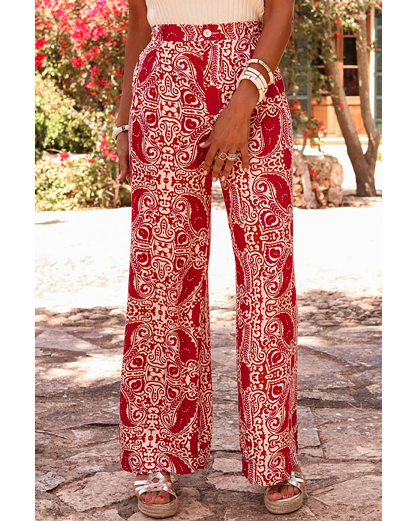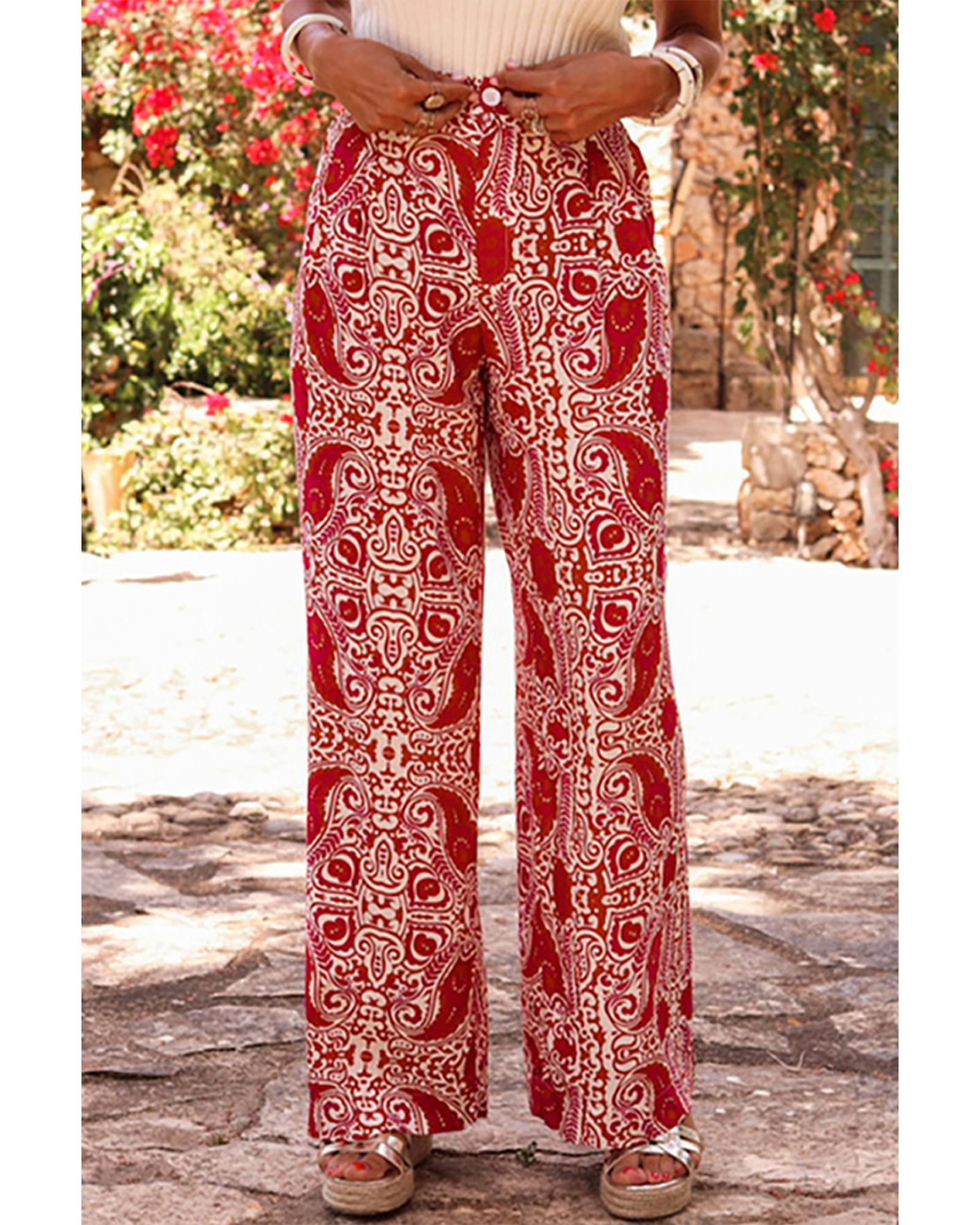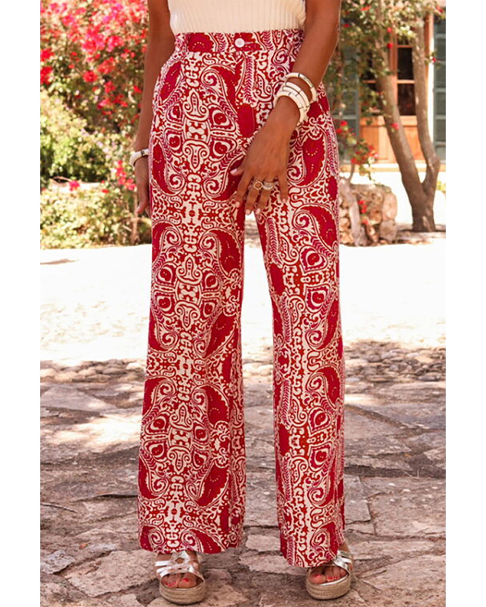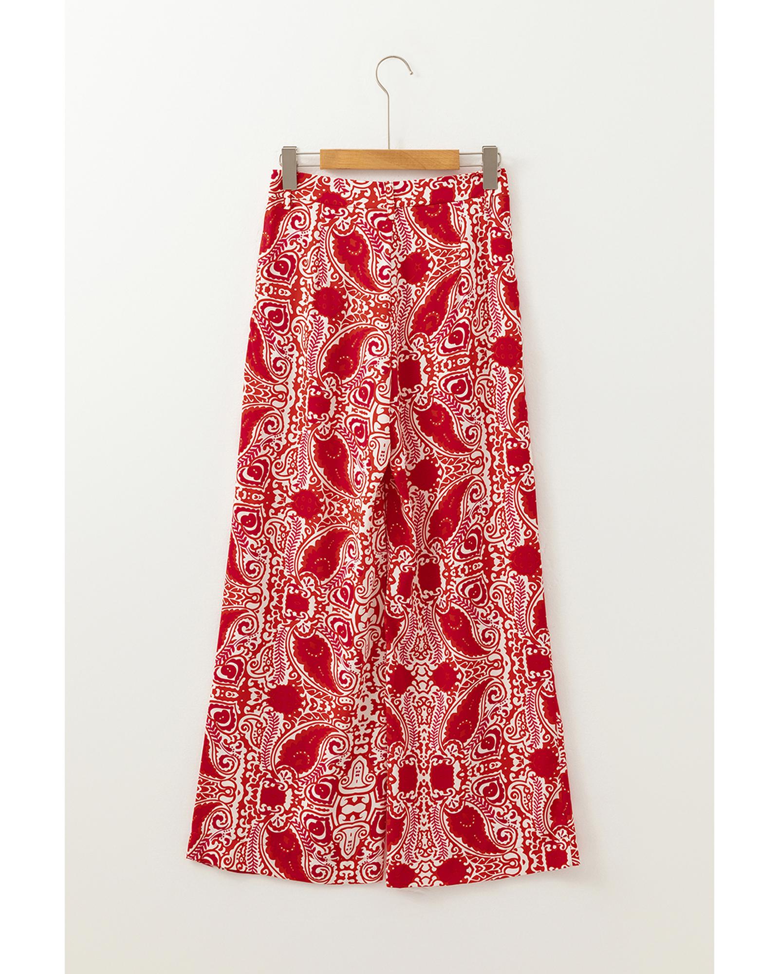 Red Paisley Printed Buttoned High Waist Straight Leg Pants – XL