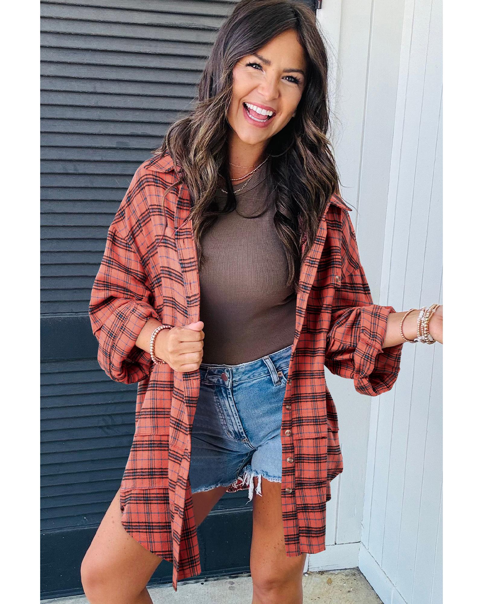 Red Plaid Long Sleeeve Side Split Distressed Hem Shirt – S