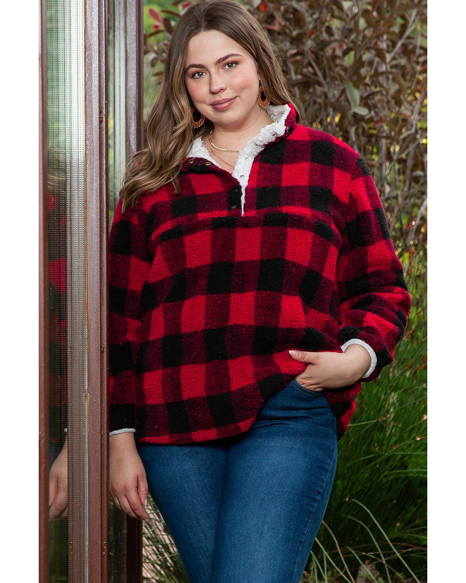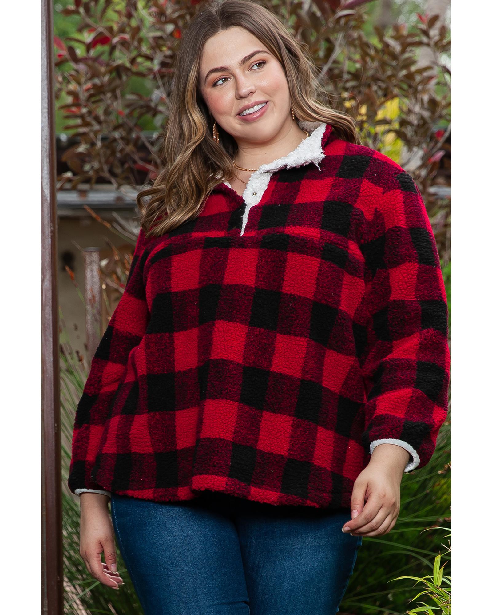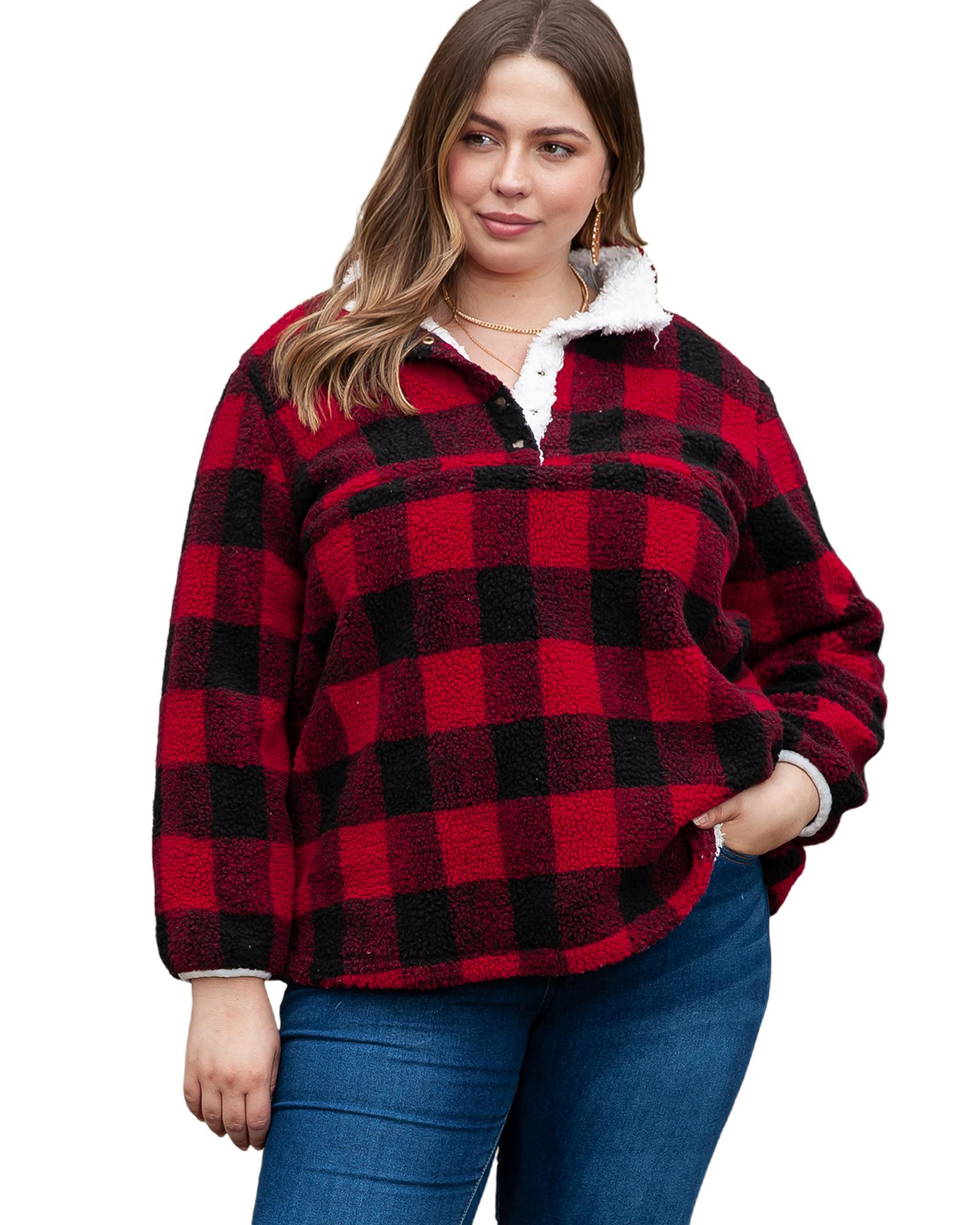 Red Plus Size Buffalo Plaid Sherpa Henley Sweatshirt – 3X
