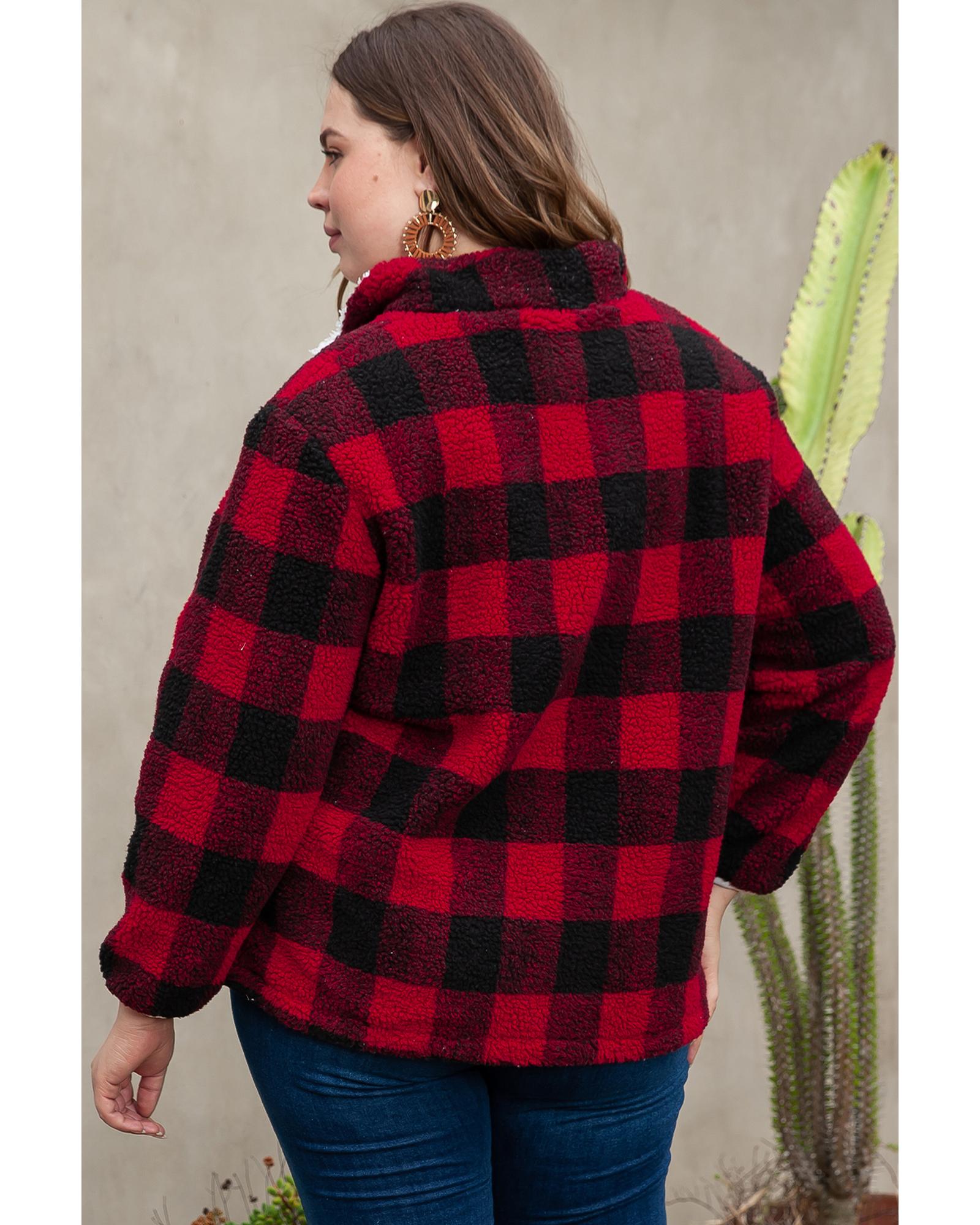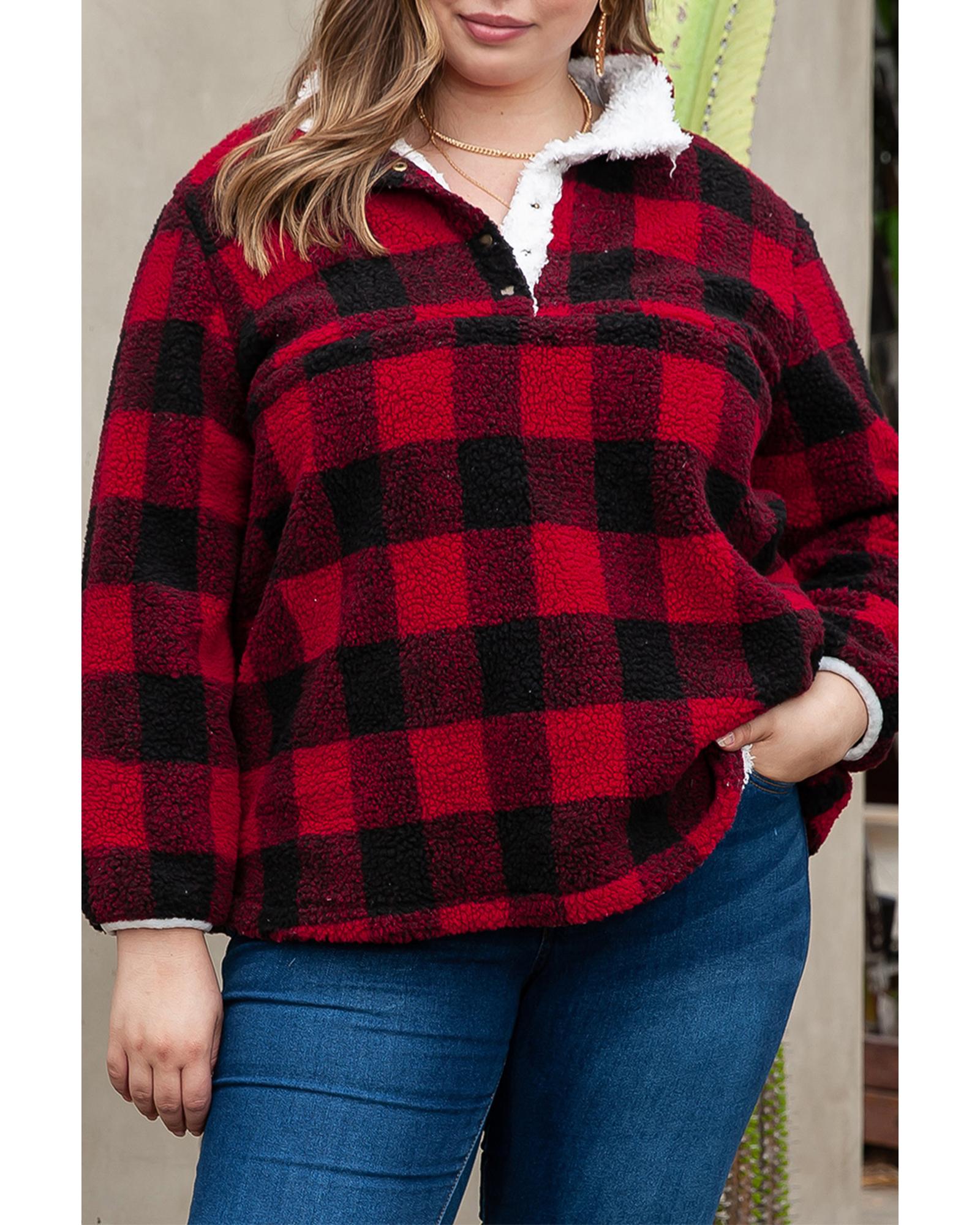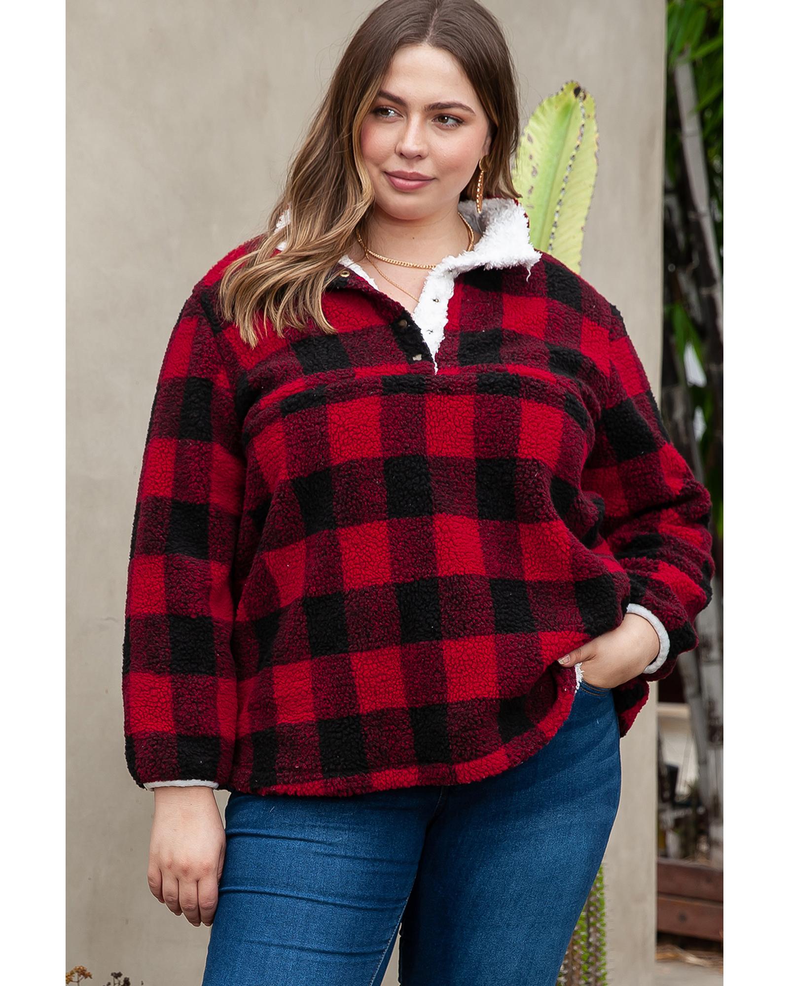 Red Plus Size Buffalo Plaid Sherpa Henley Sweatshirt – 3X