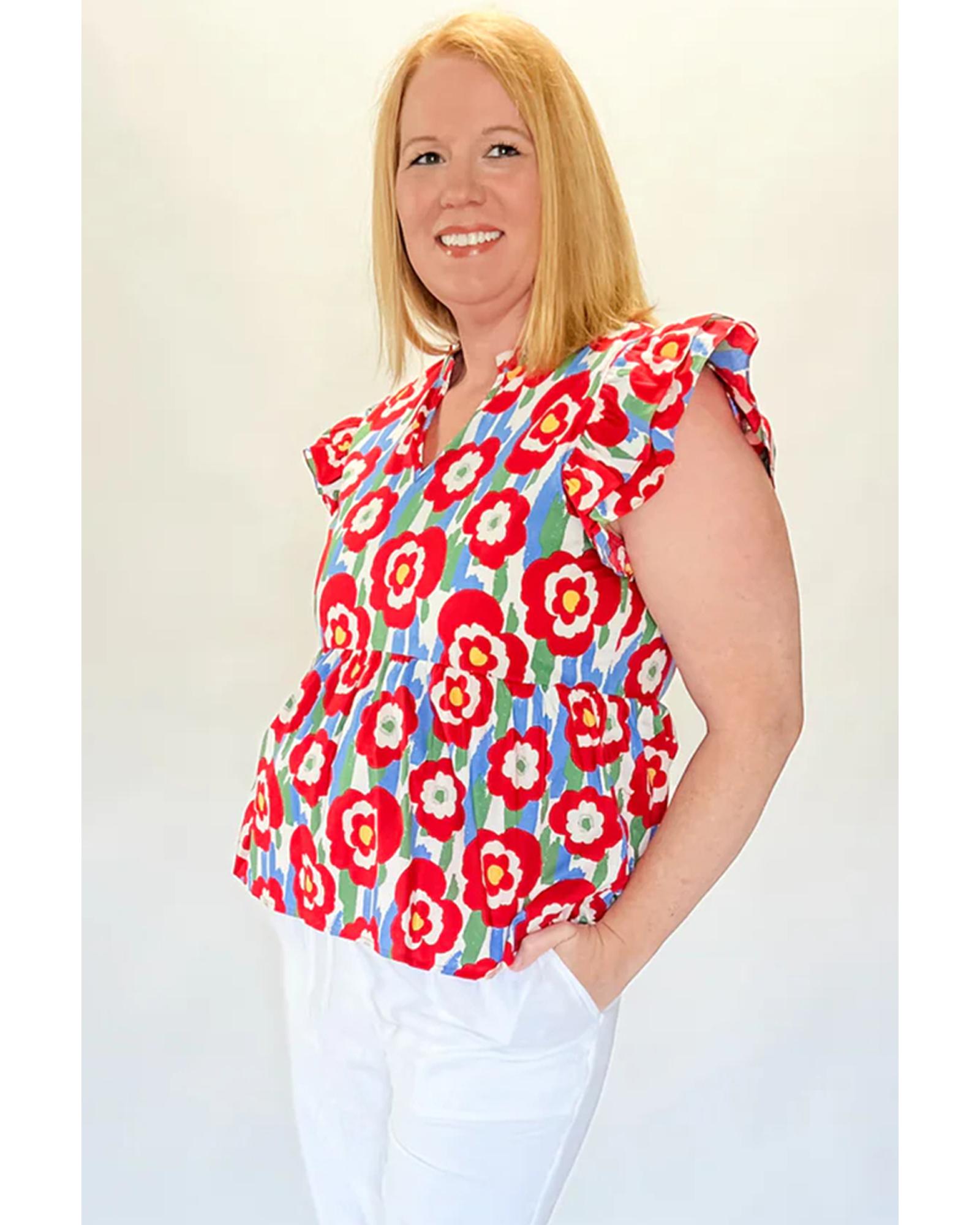 Red Plus Size Floral Print Ruffle Trim Split Neck Peplum Top – 3X