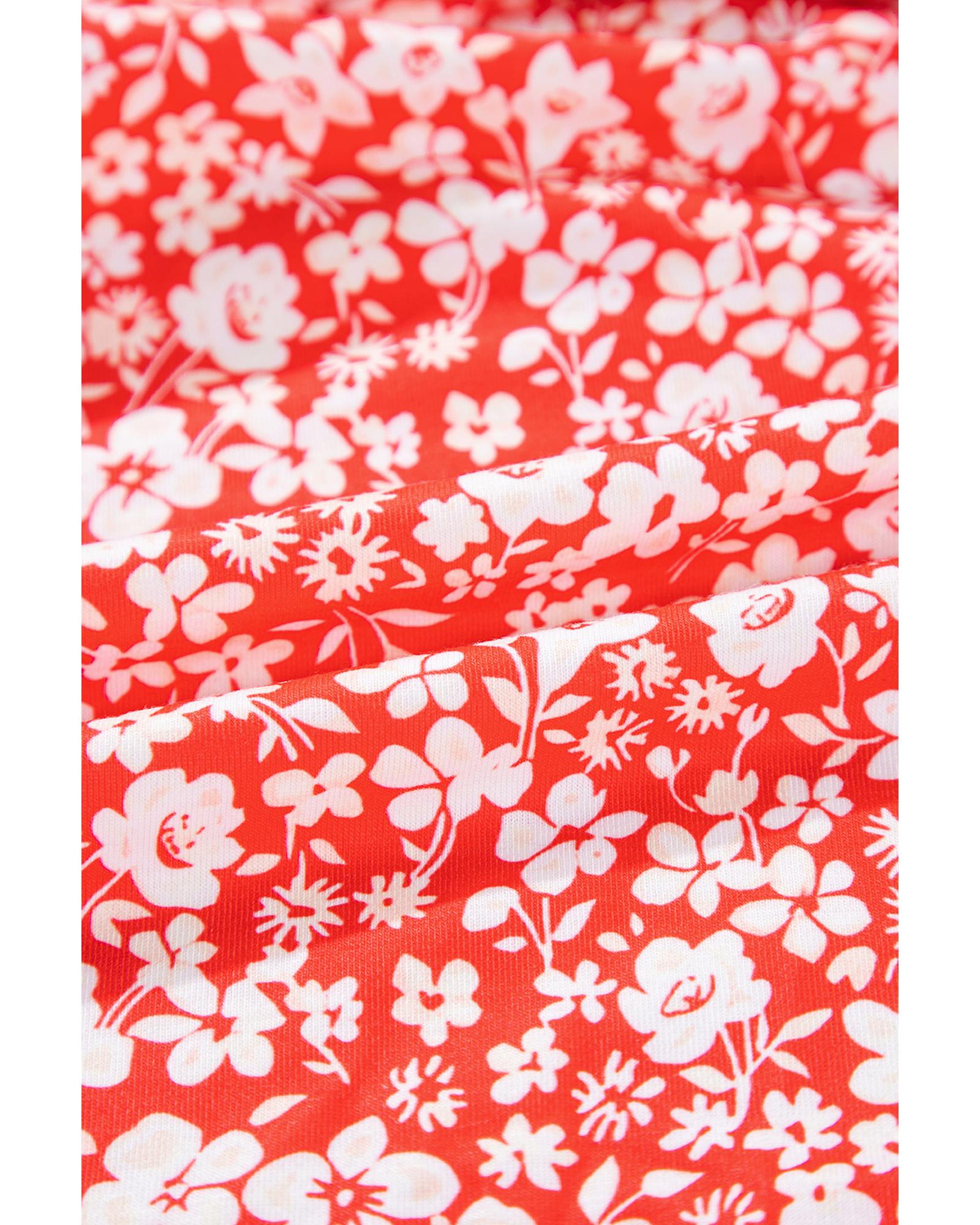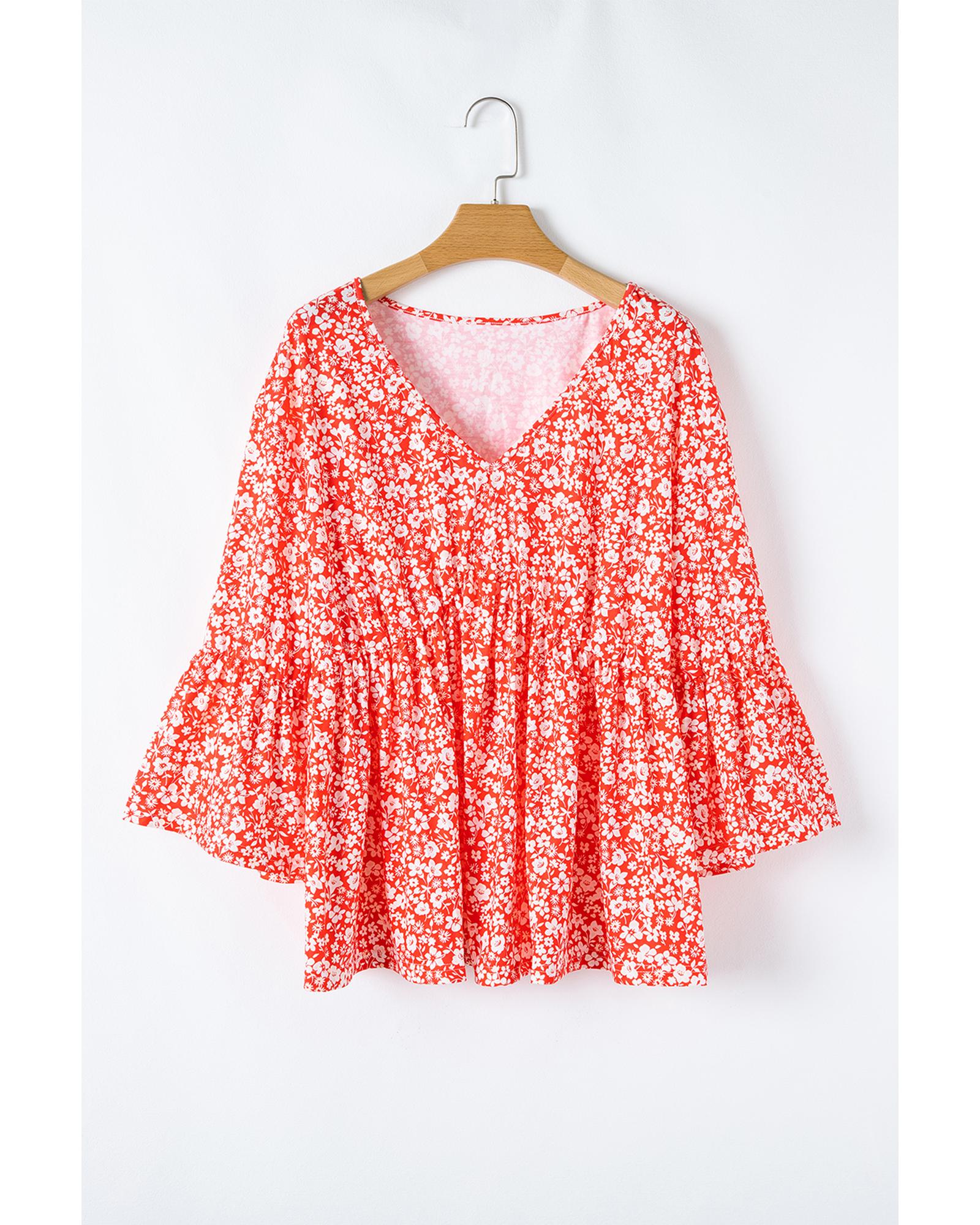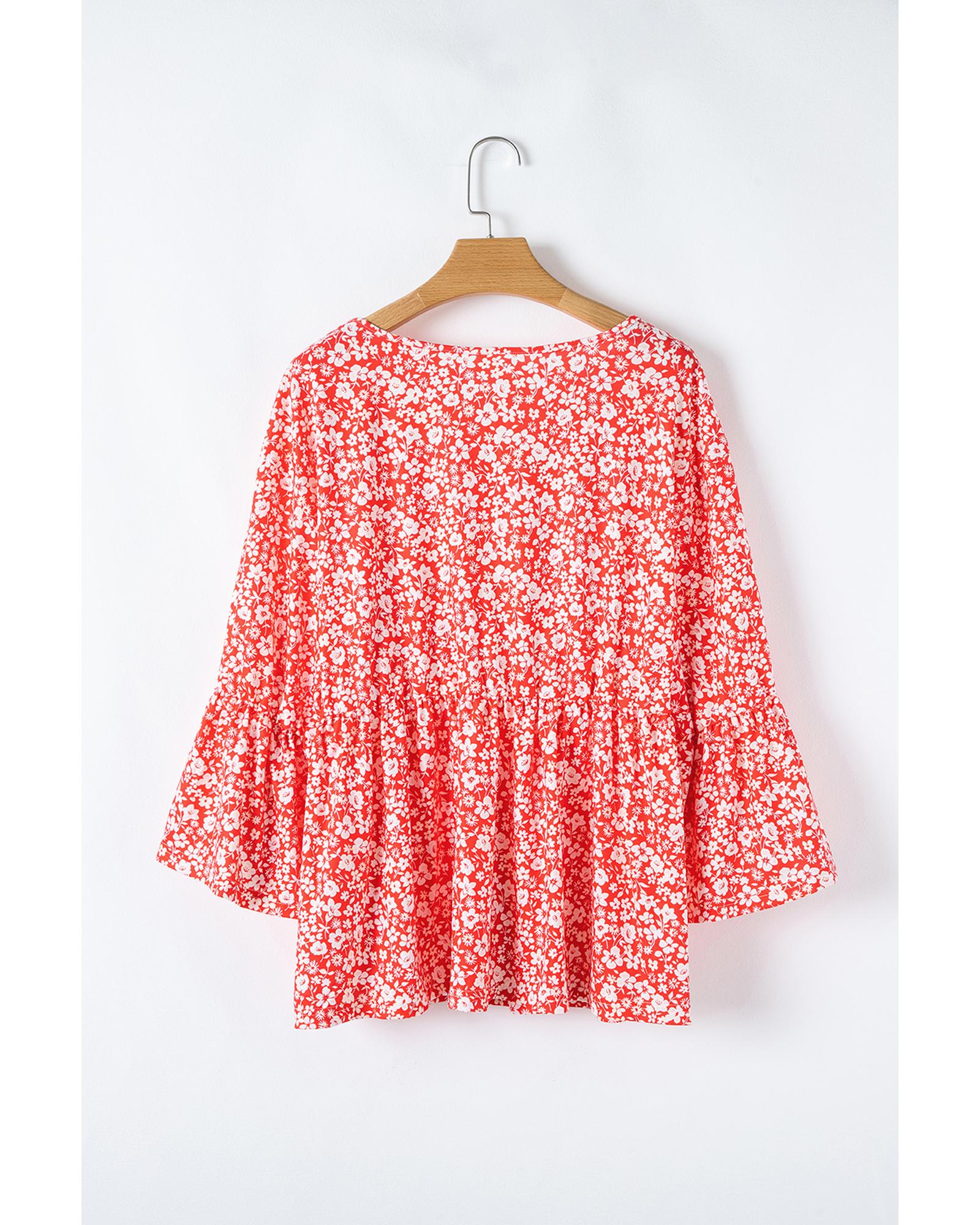 Red Plus Size Floral V Neck Flared Bracelet Sleeve Blouse – 1X