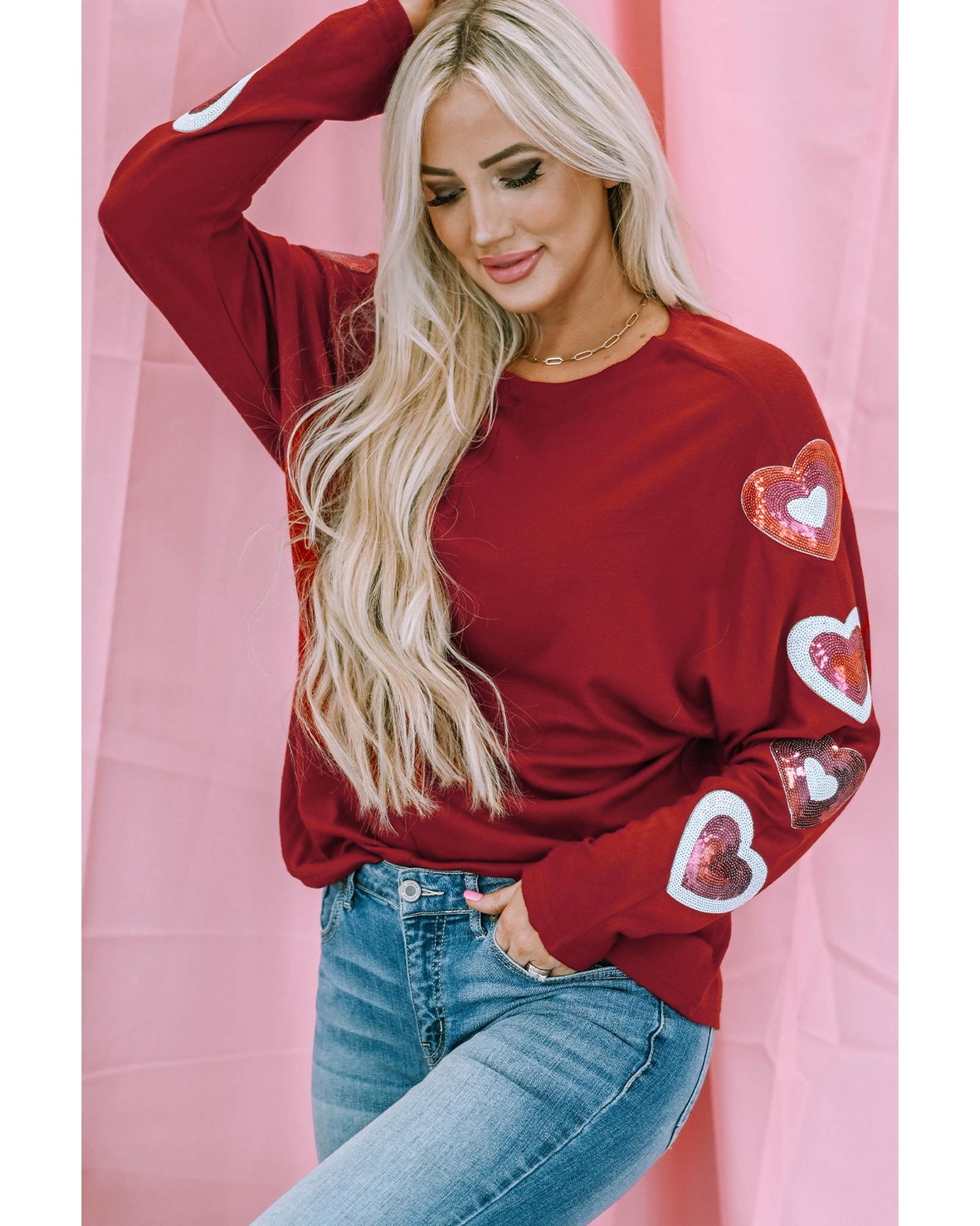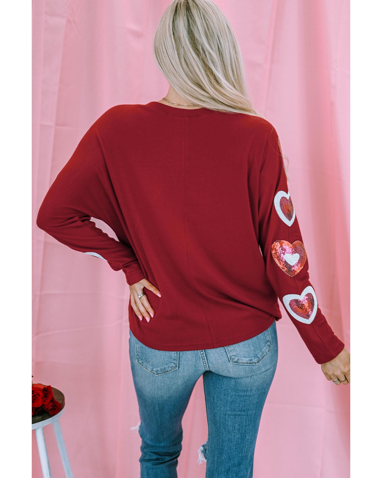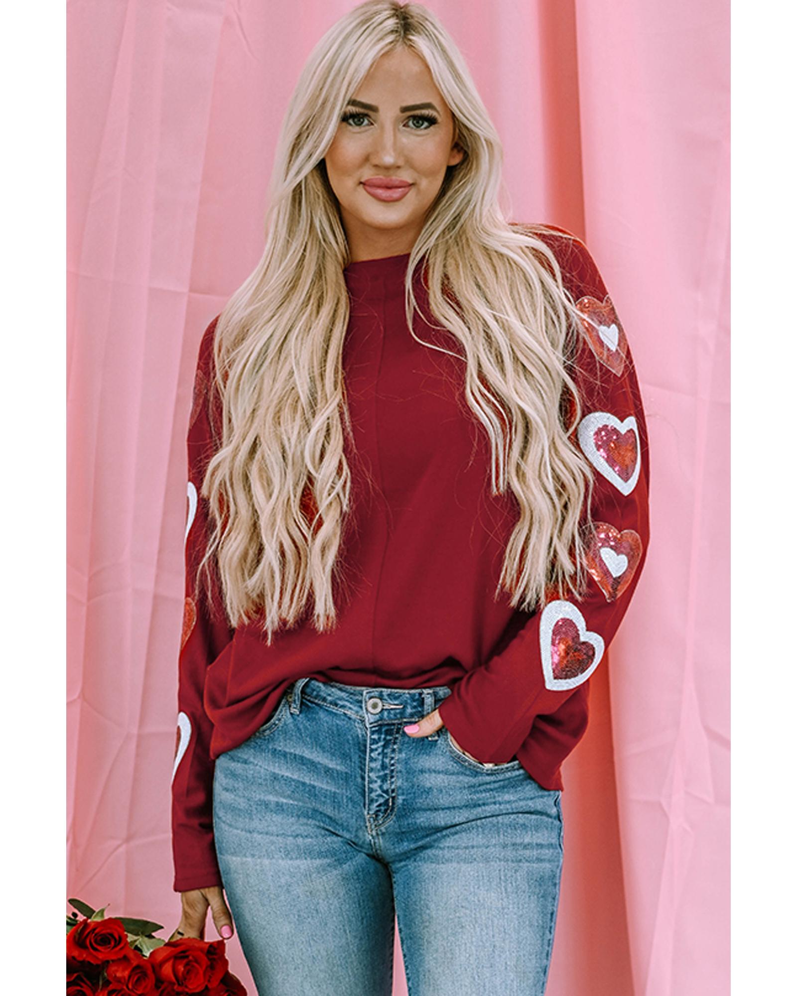 Red Sequined Heart Printed Sleeves Valentine Fashion Top – L