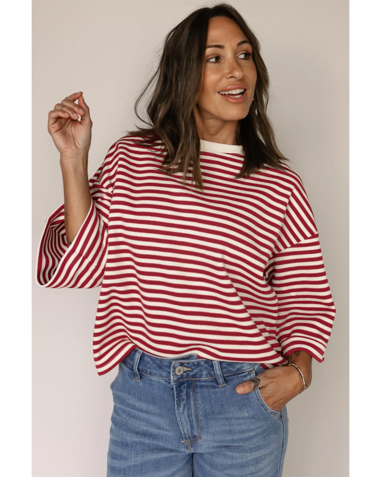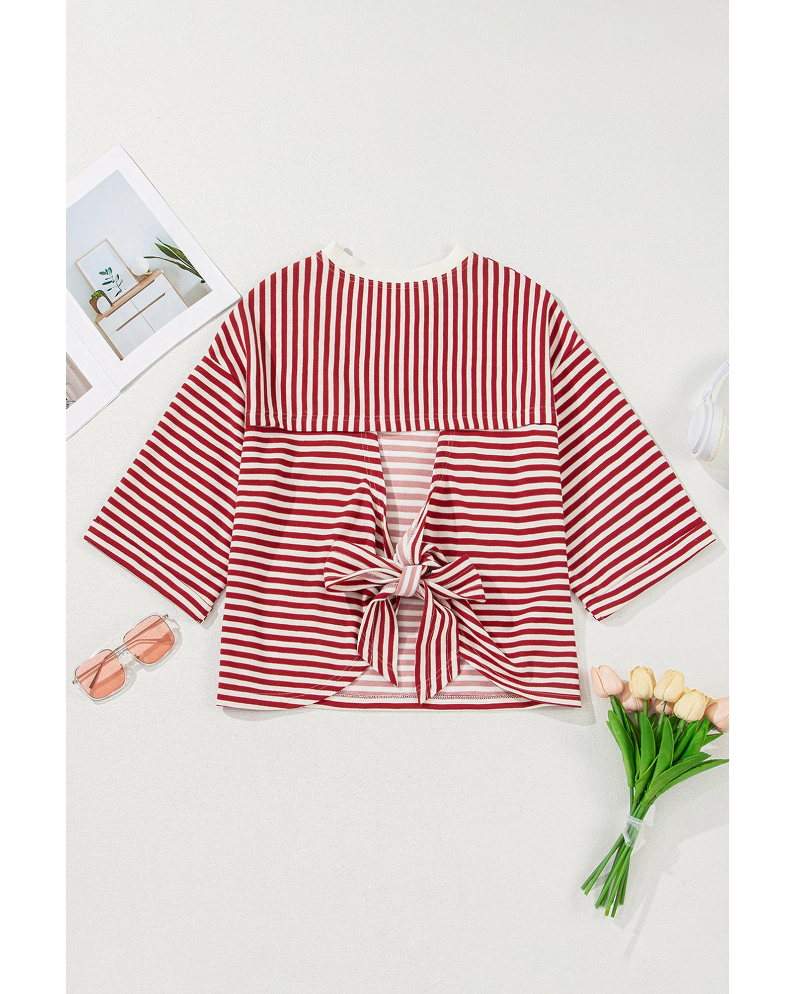 Red Stripe Bowknot Cutout Back Drop Shoulder Wide Bracelet Sleeve Loose Tee – XL