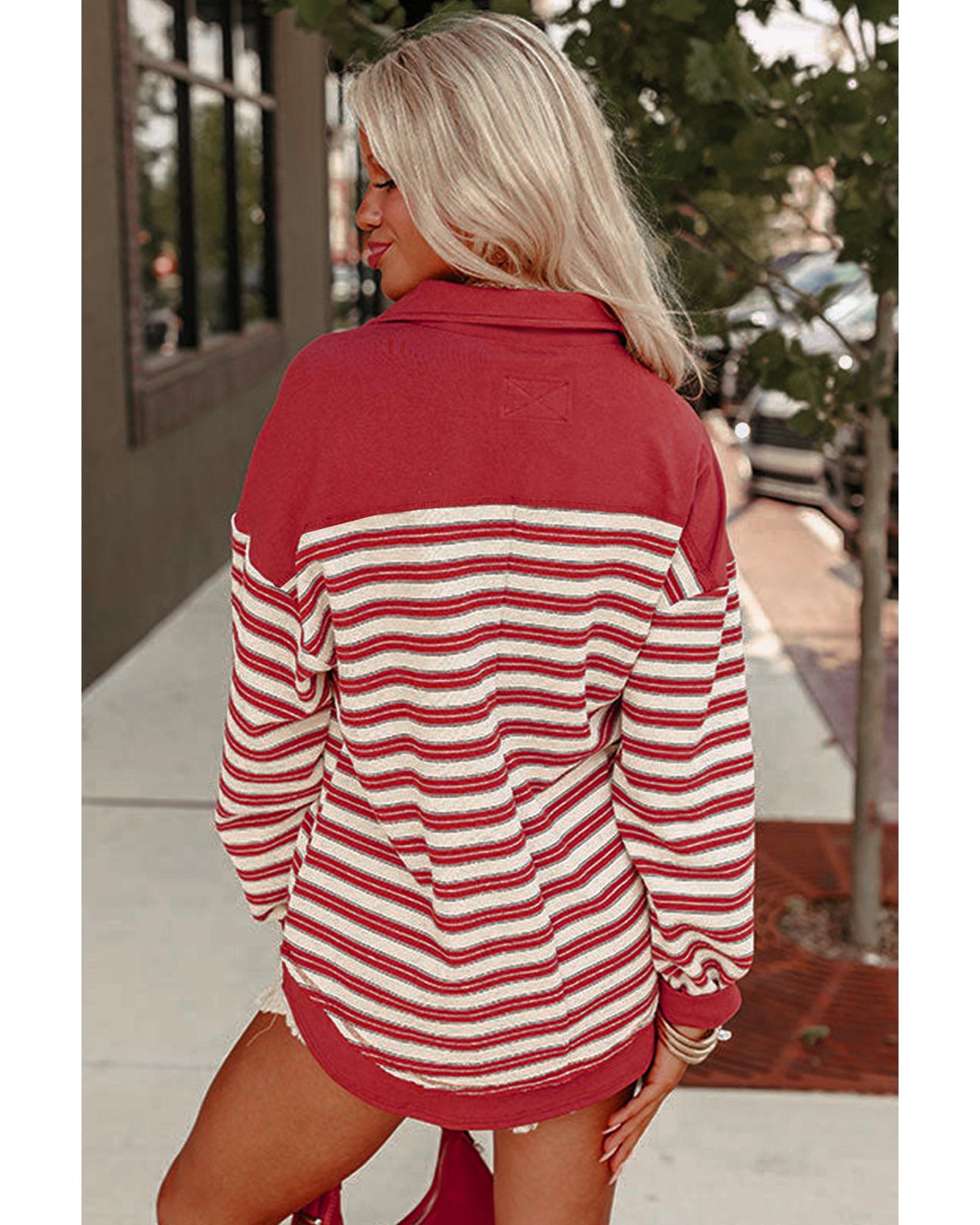 Red Stripe Buttoned V Neck Collared Drop Shoulder Top – L