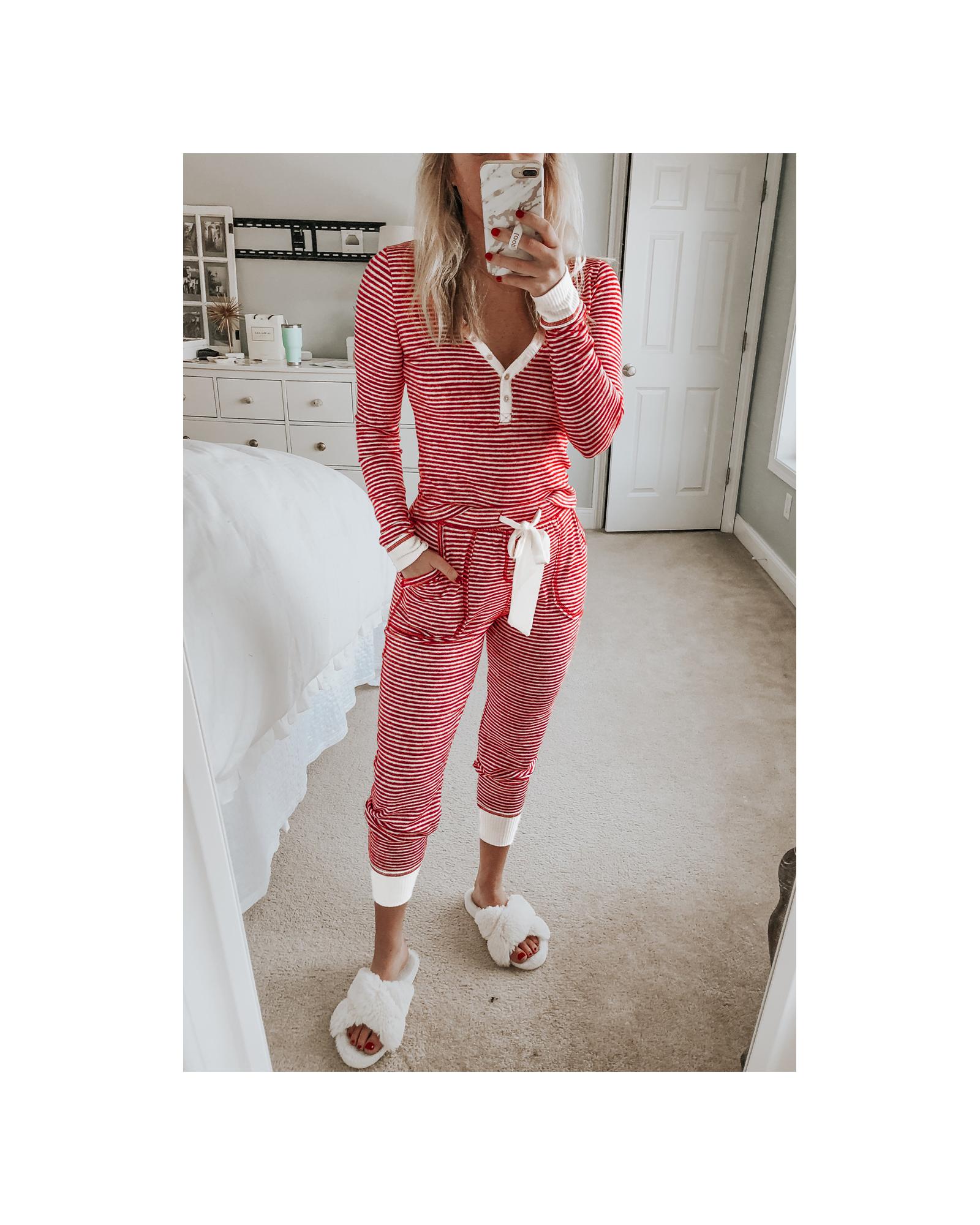 Red Stripe Buttoned V Neck Top and Knotted Waist Pants Lounge Set – M