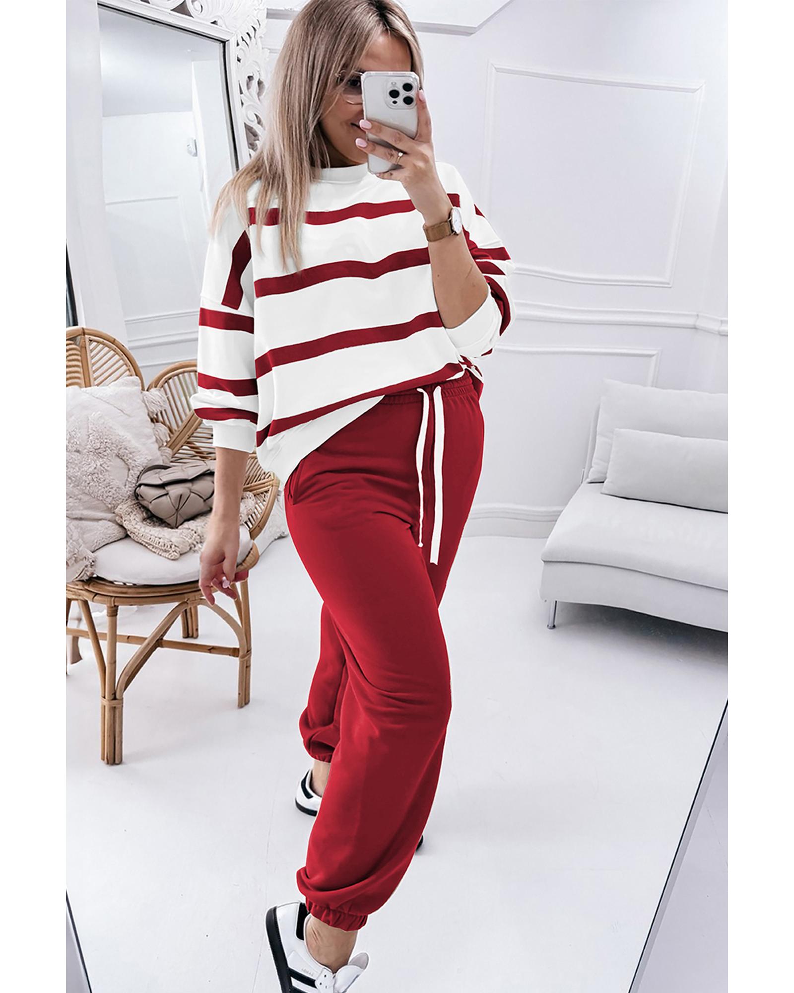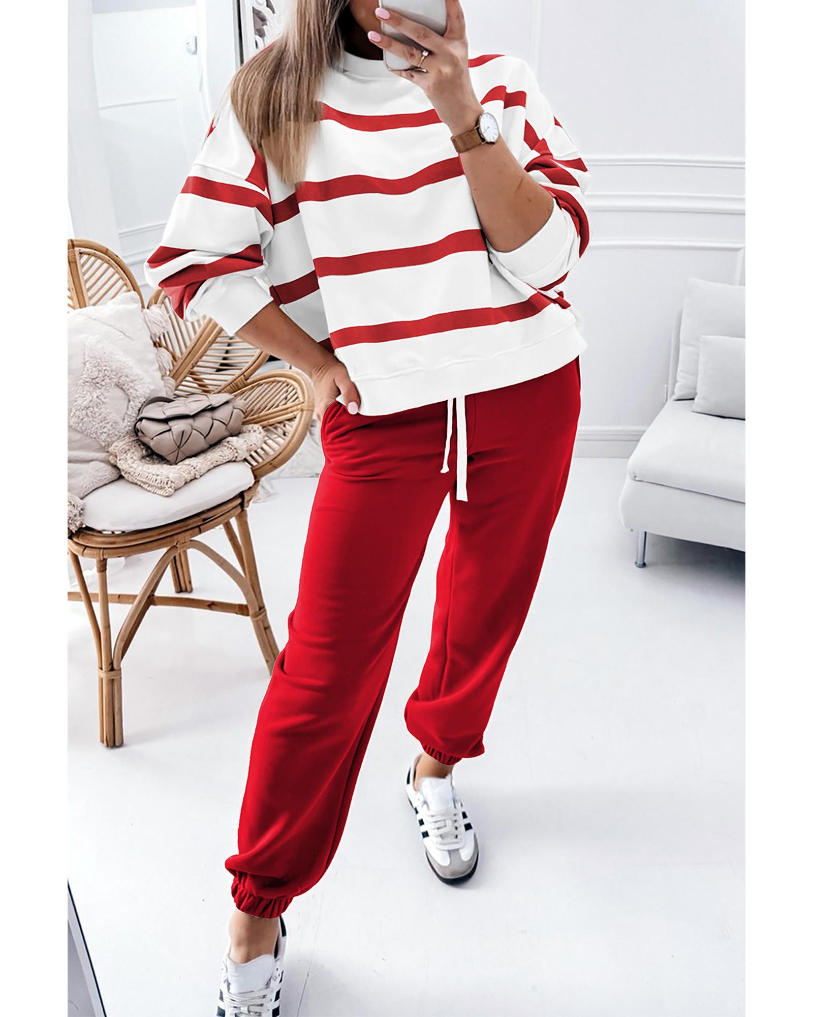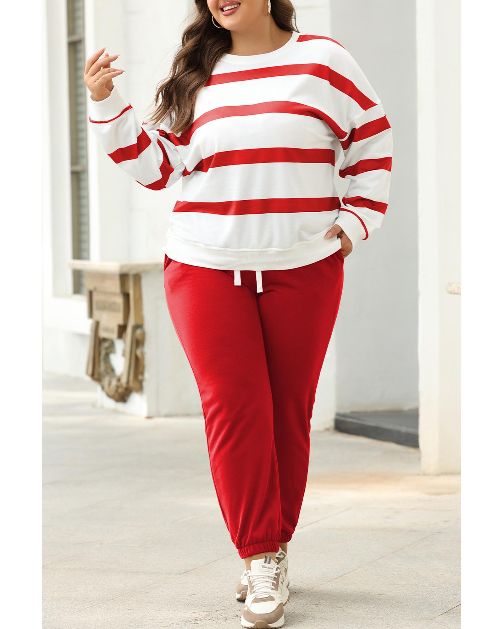 Red Stripe Drop Shoulder Pullover and Jogger Pants Set – L