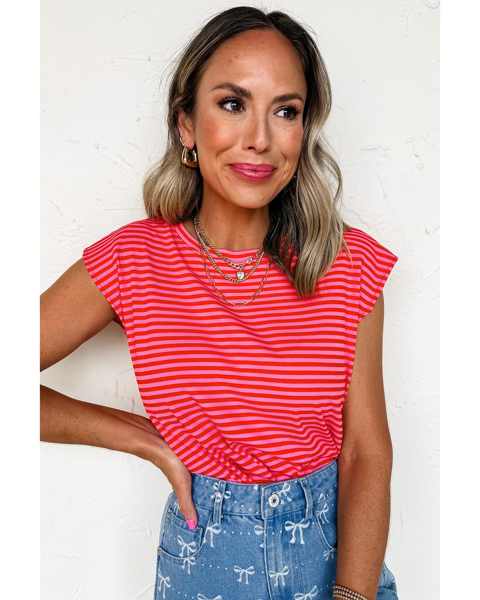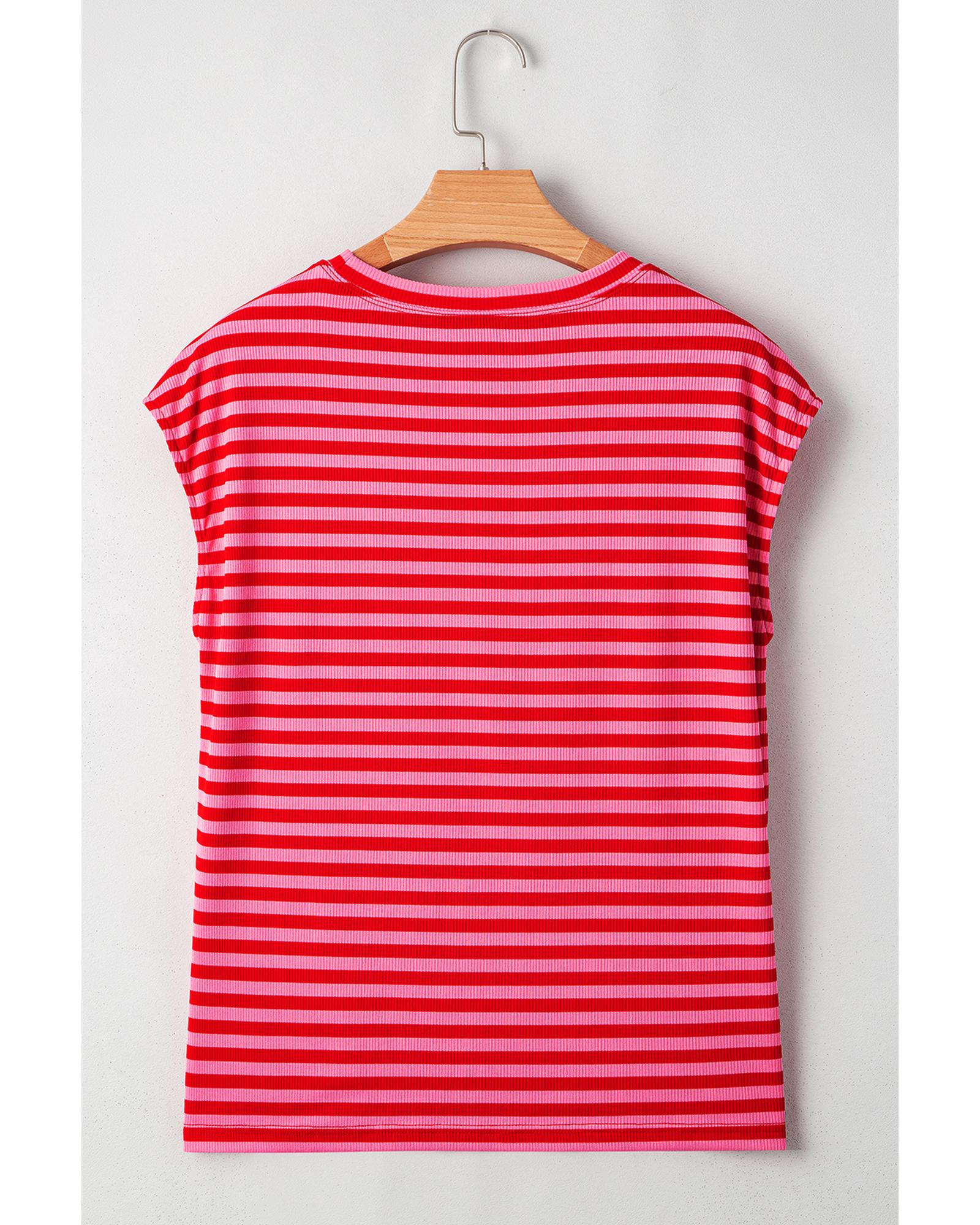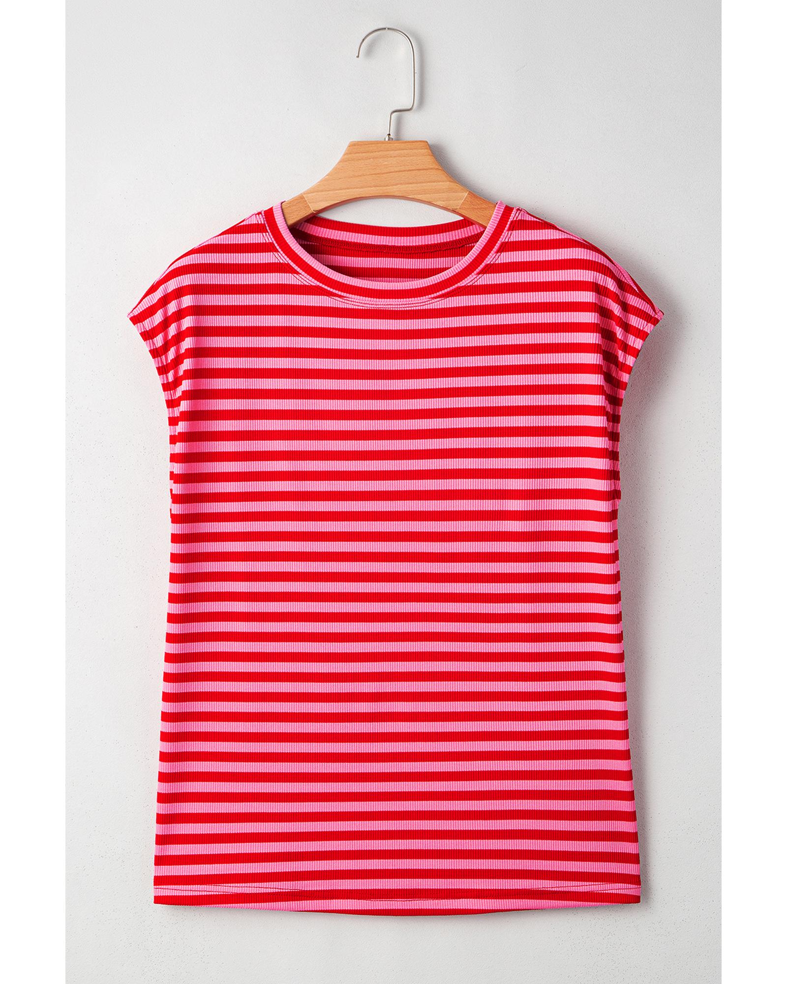 Red Stripe Ribbed Cap Sleeve Round Neck T Shirt – L
