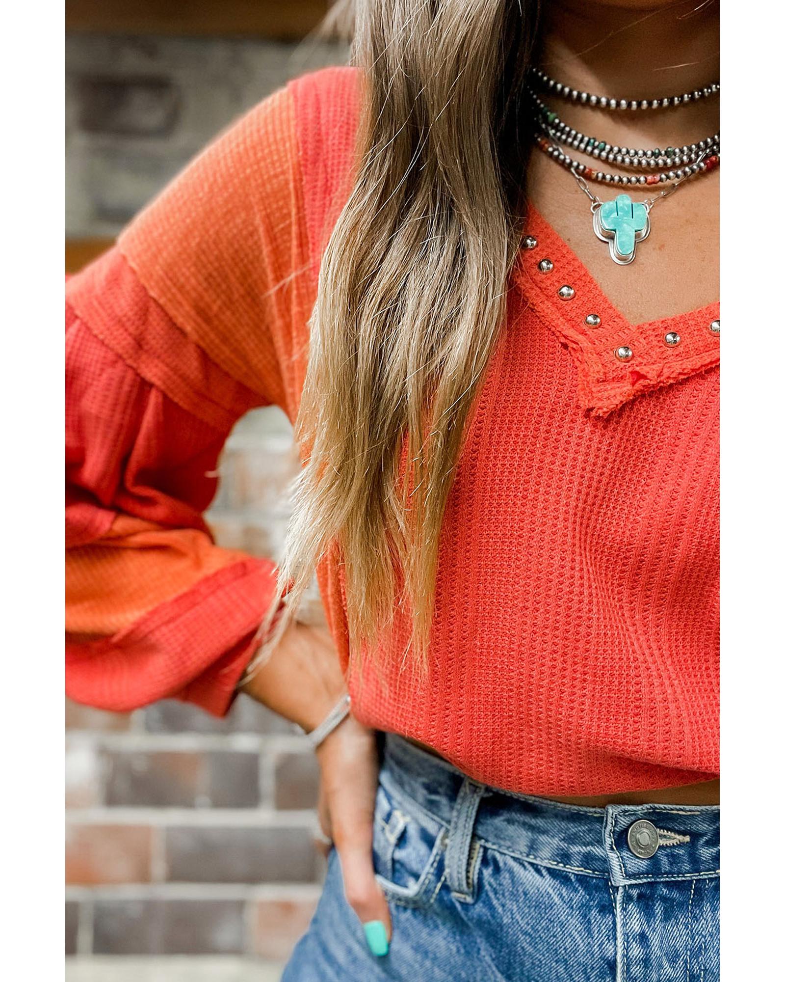 Red Studded V Neckline Exposed Seam Textured Knit Top – XL