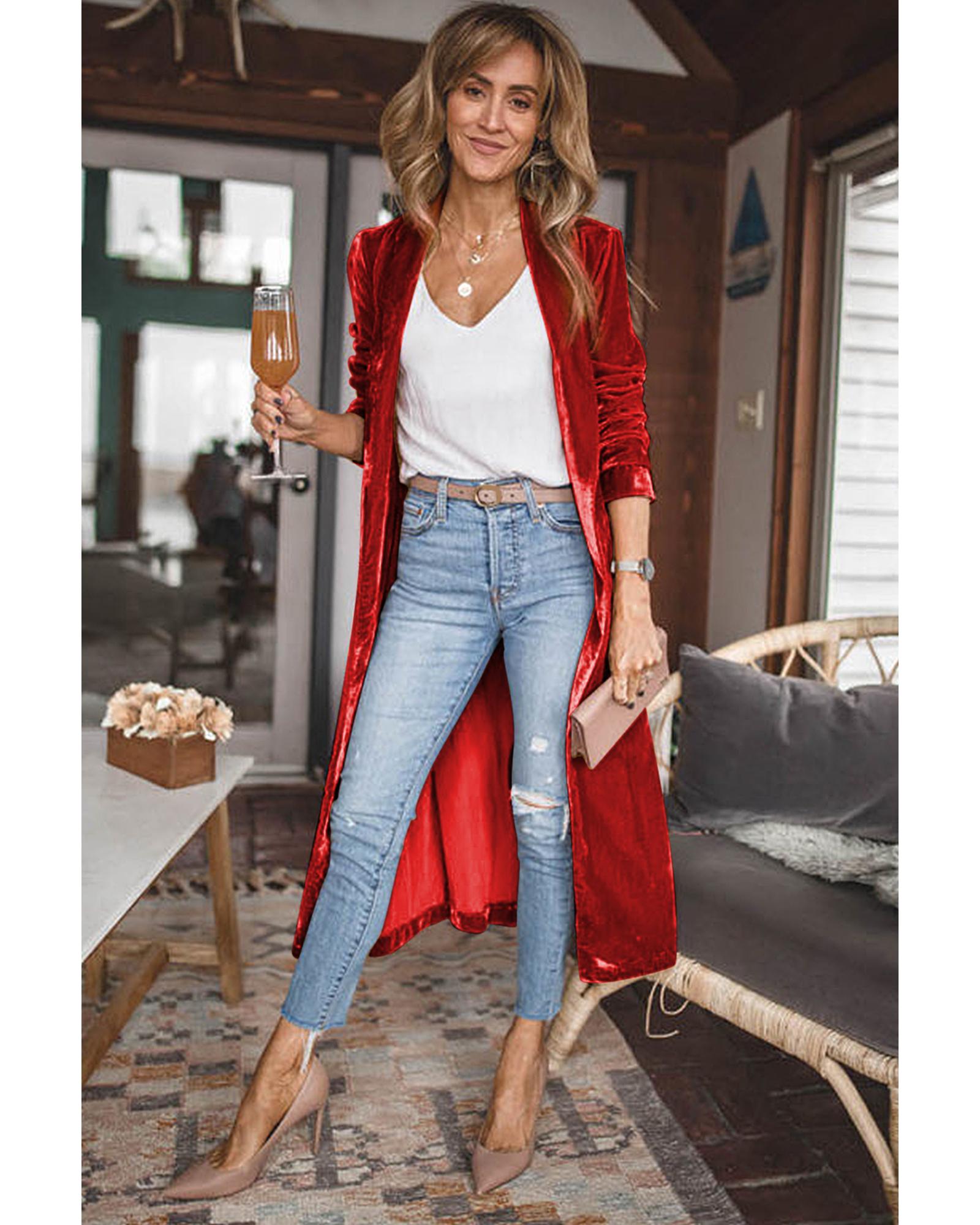 Long cardigan with open front and long sleeves Side pockets for convenience Made of soft lightweight and skin - friendly velvet fabric Perfect for cold days in spring and autumn Versatile and easy to style Available in various sizes
