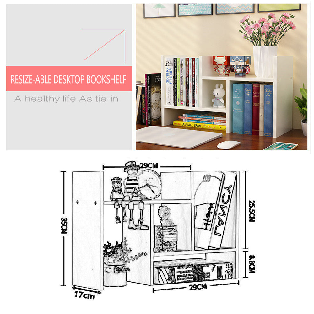 Resize-able Thick Wood Desktop Bookshelf Display Rack Unit(White)