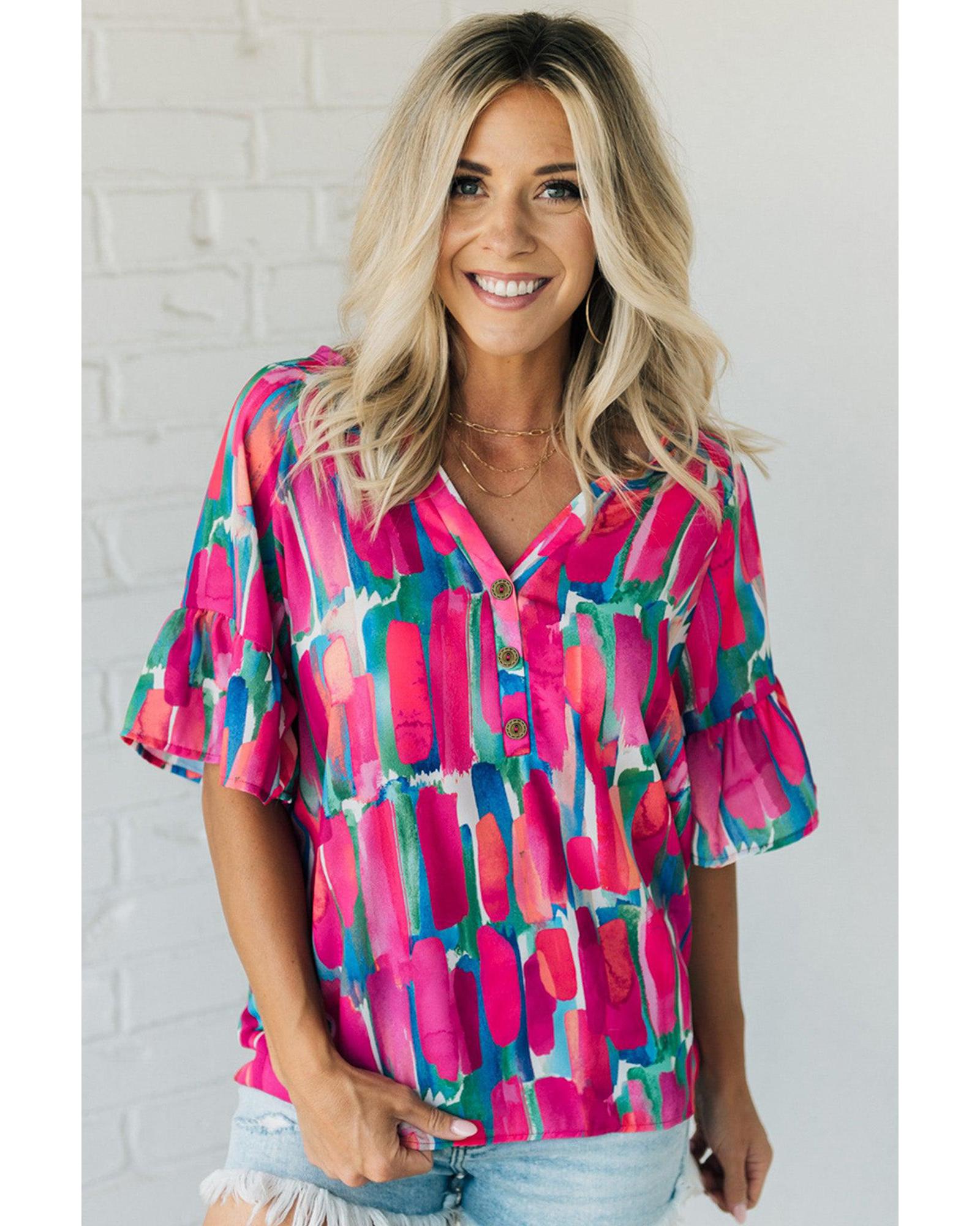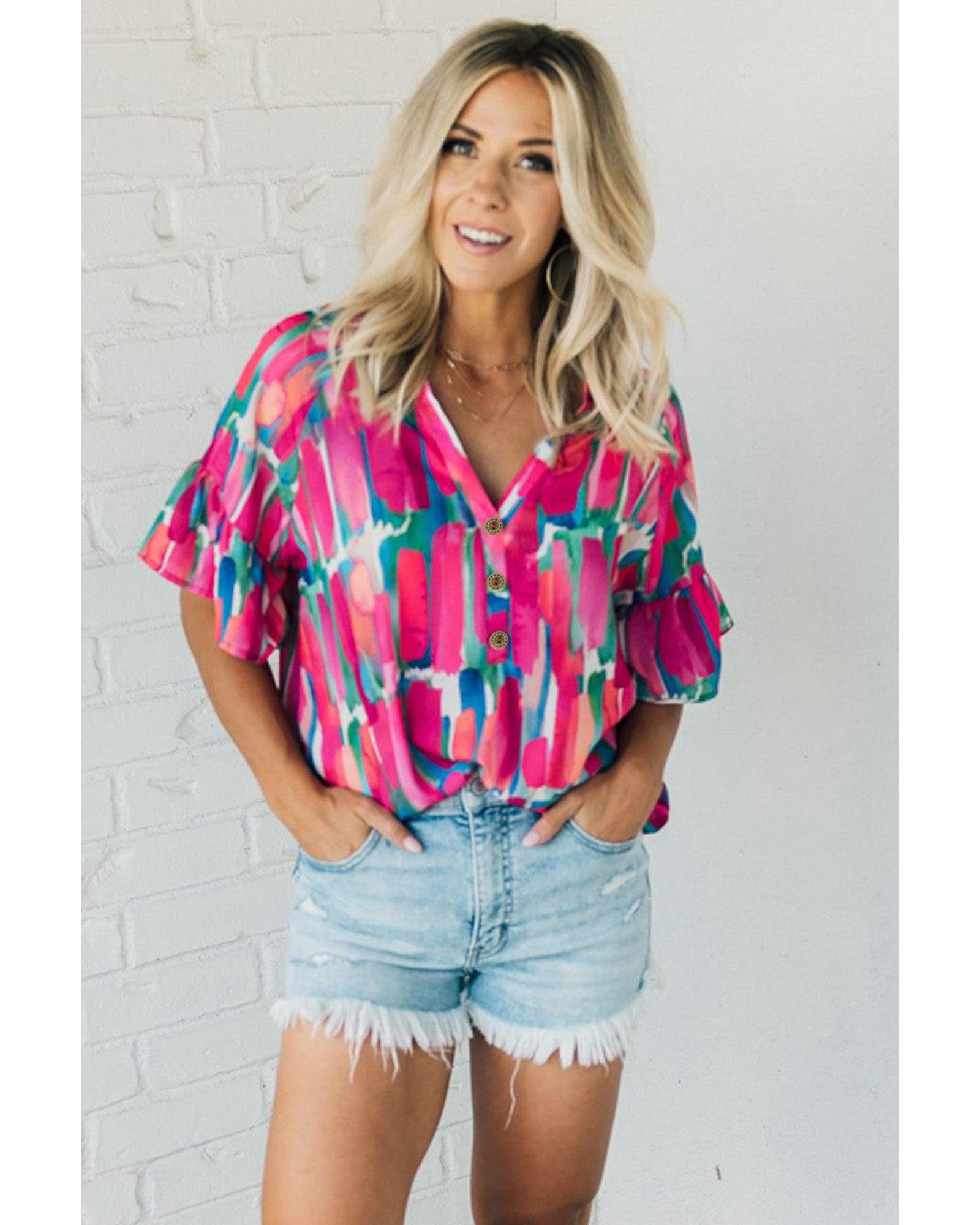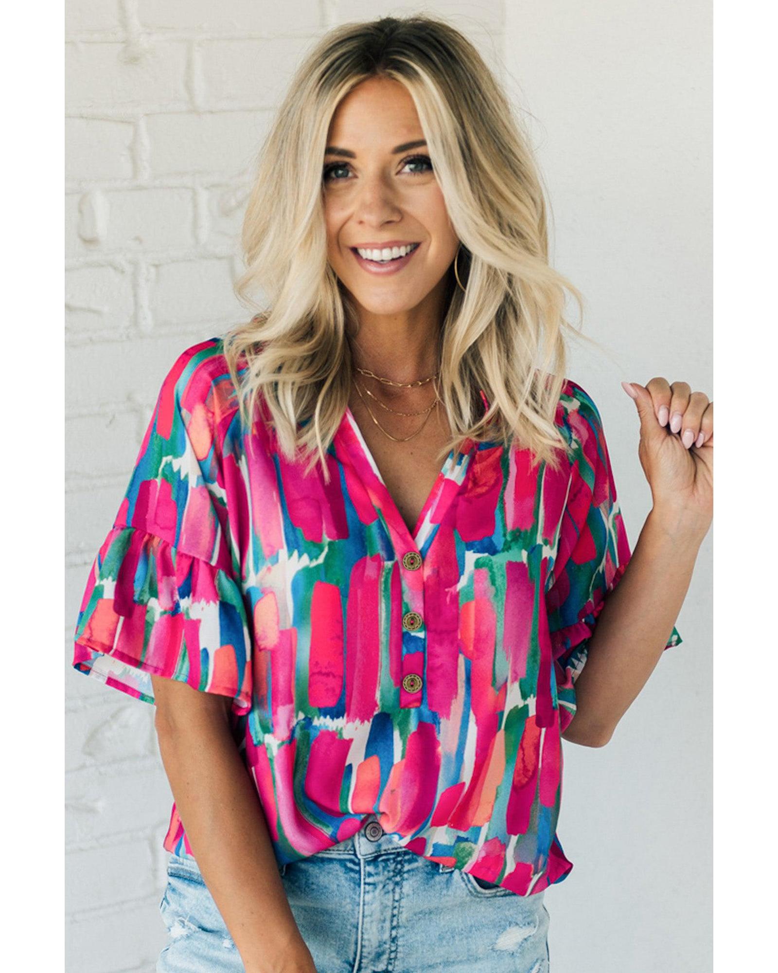 Rose Abstract Brushwork Print Buttoned V Neck Blouse – S