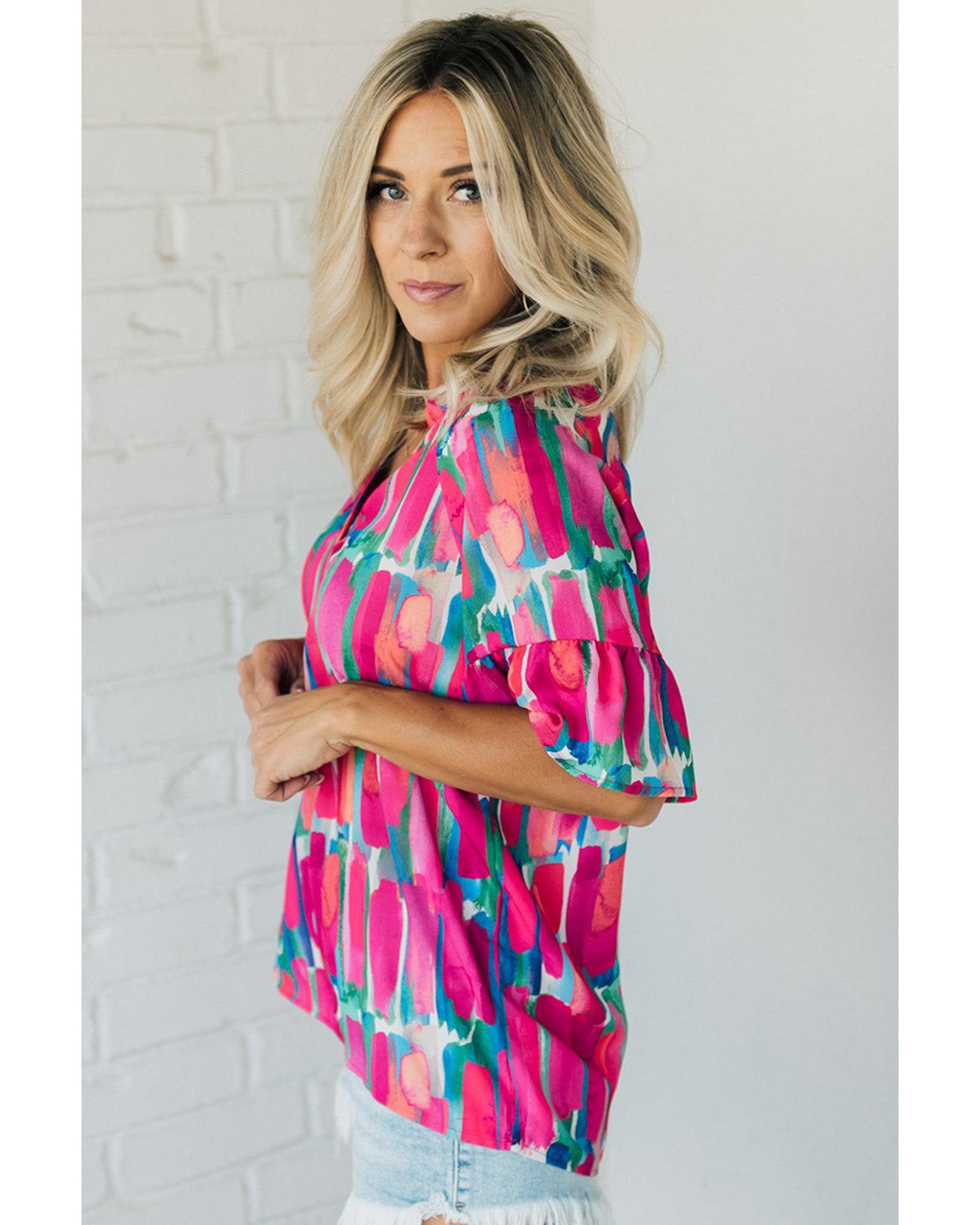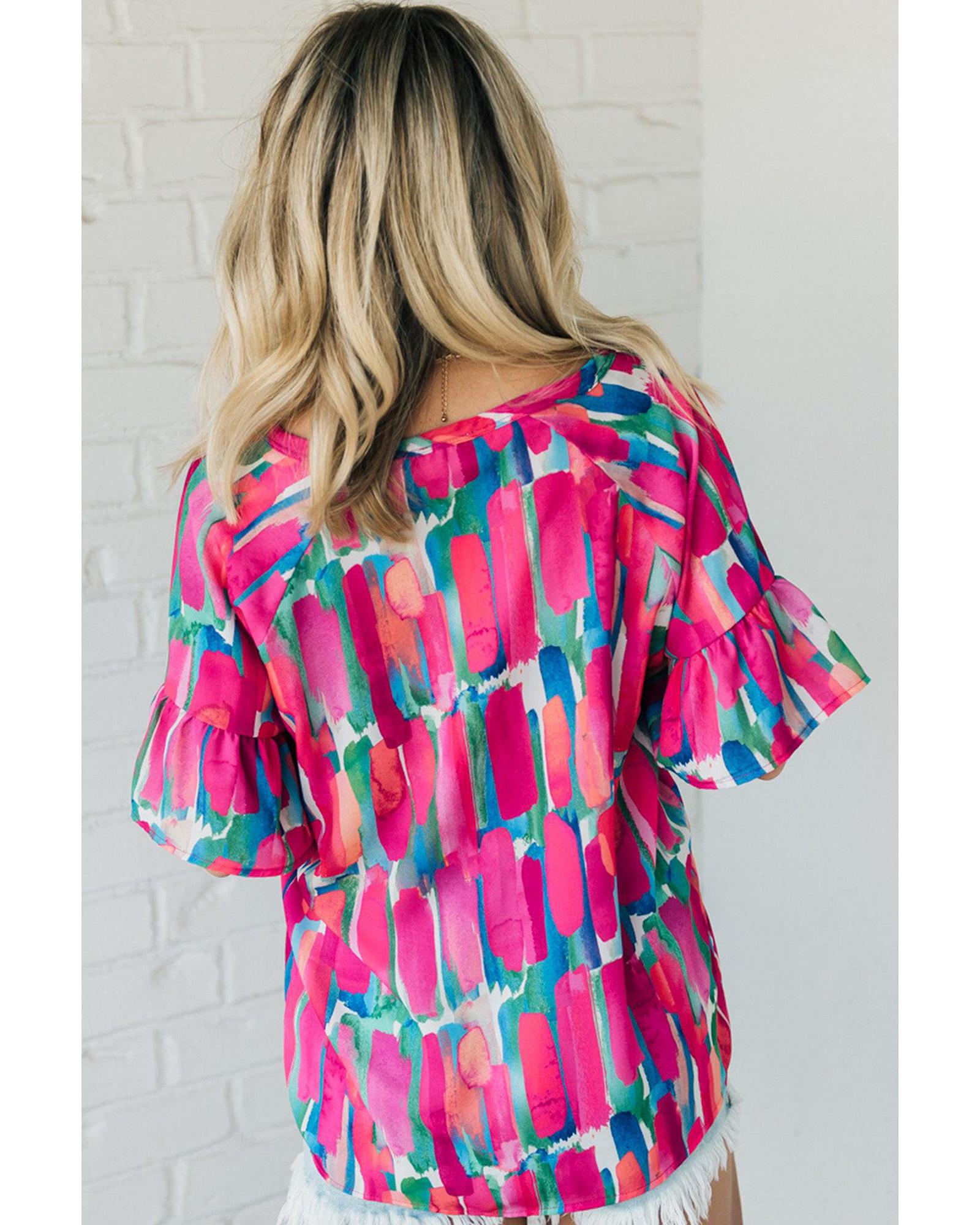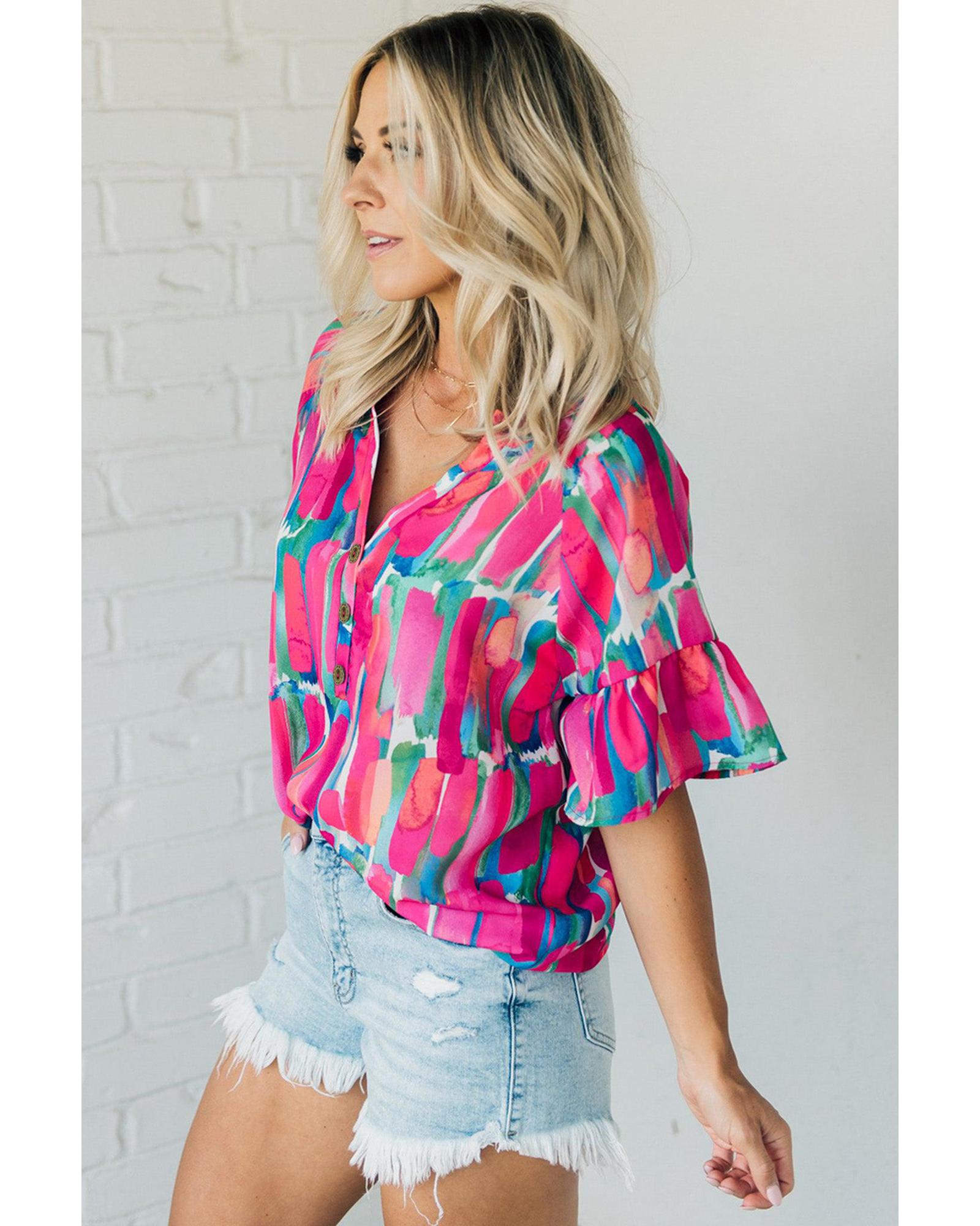 Rose Abstract Brushwork Print Buttoned V Neck Blouse – S