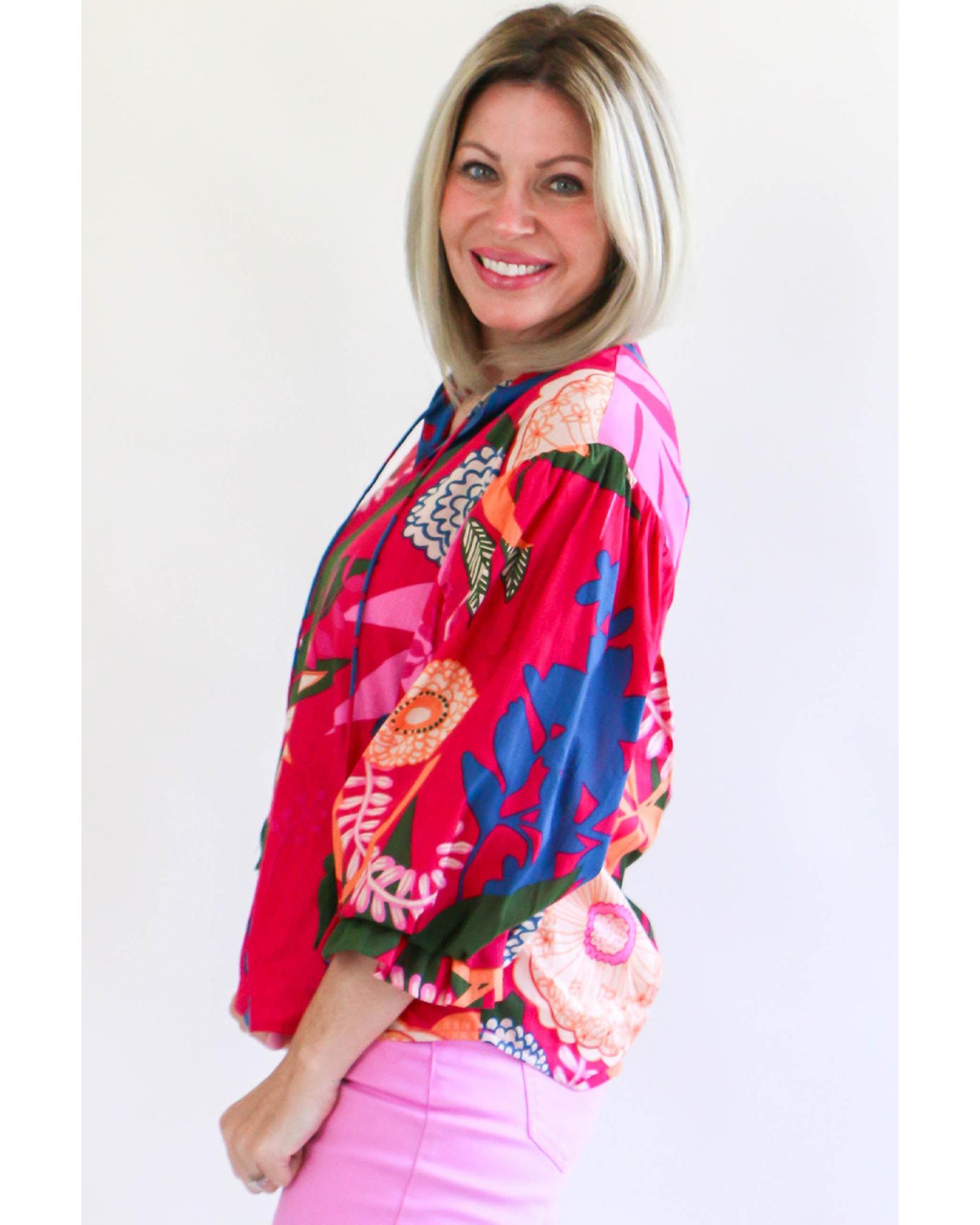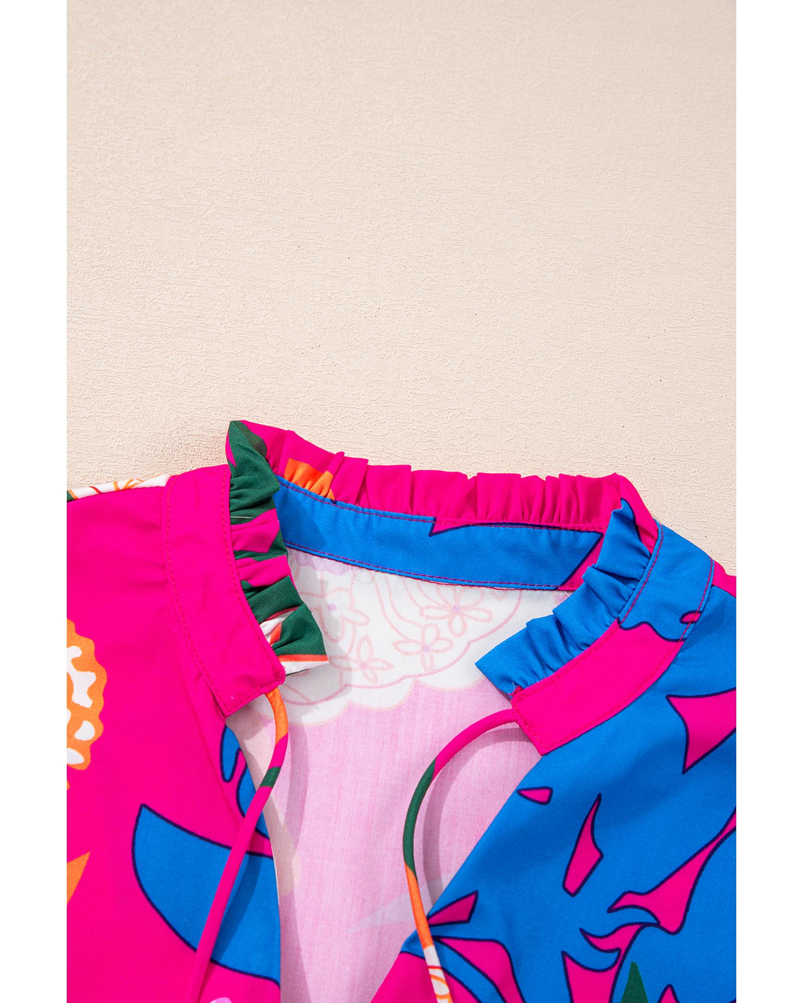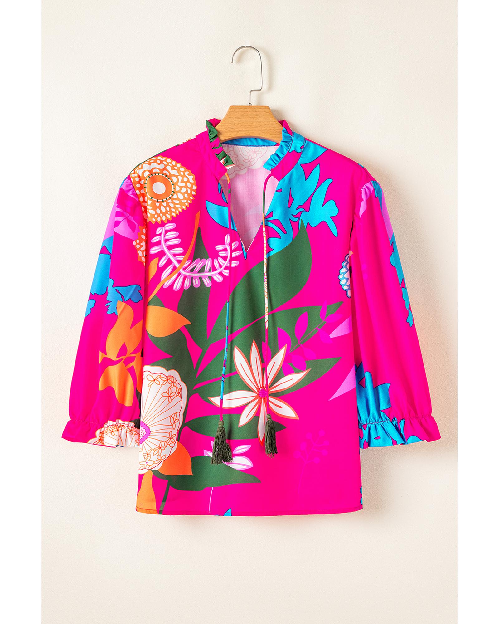 Rose Blooming Flower Print Ruffled Puff Sleeve Blouse – M