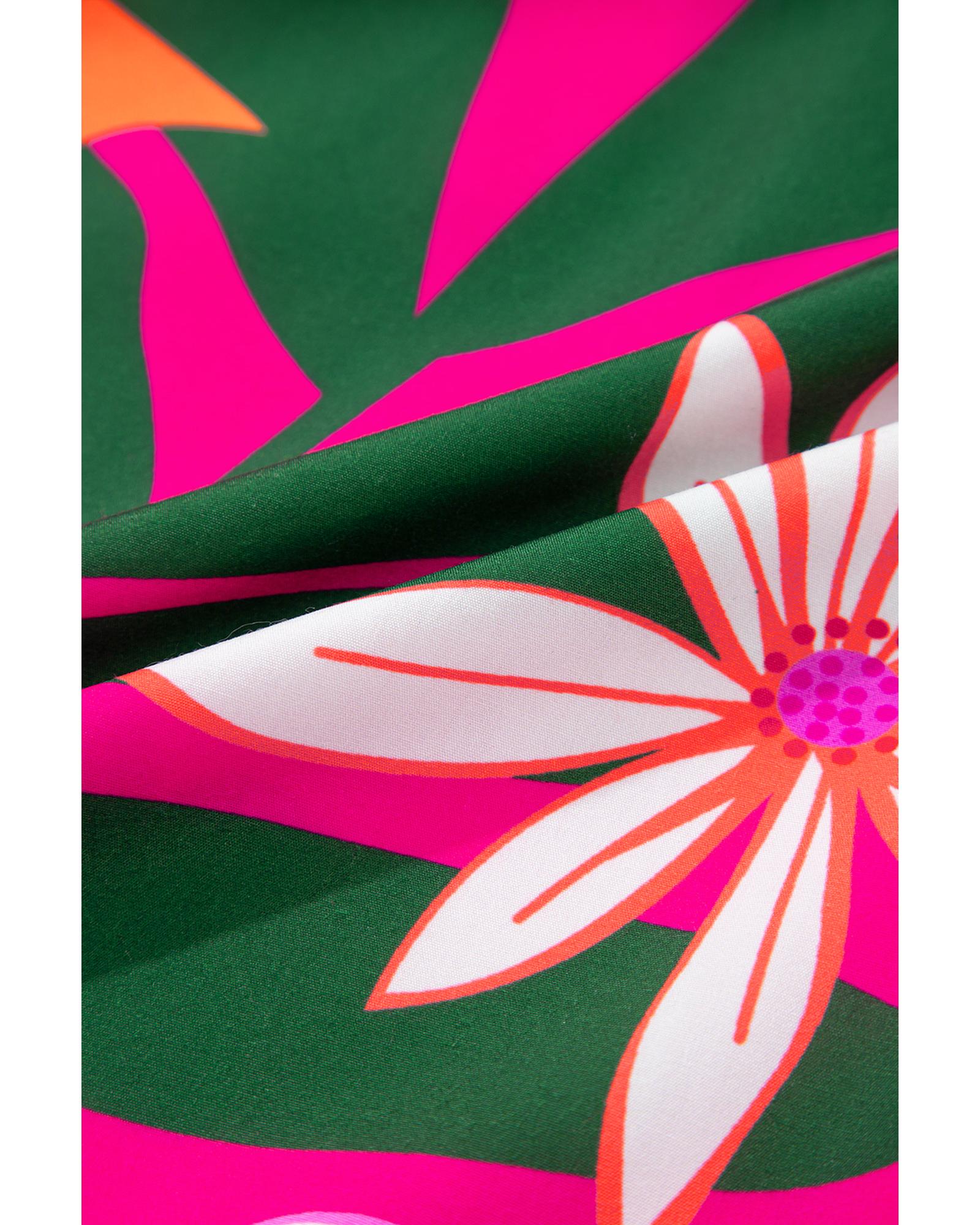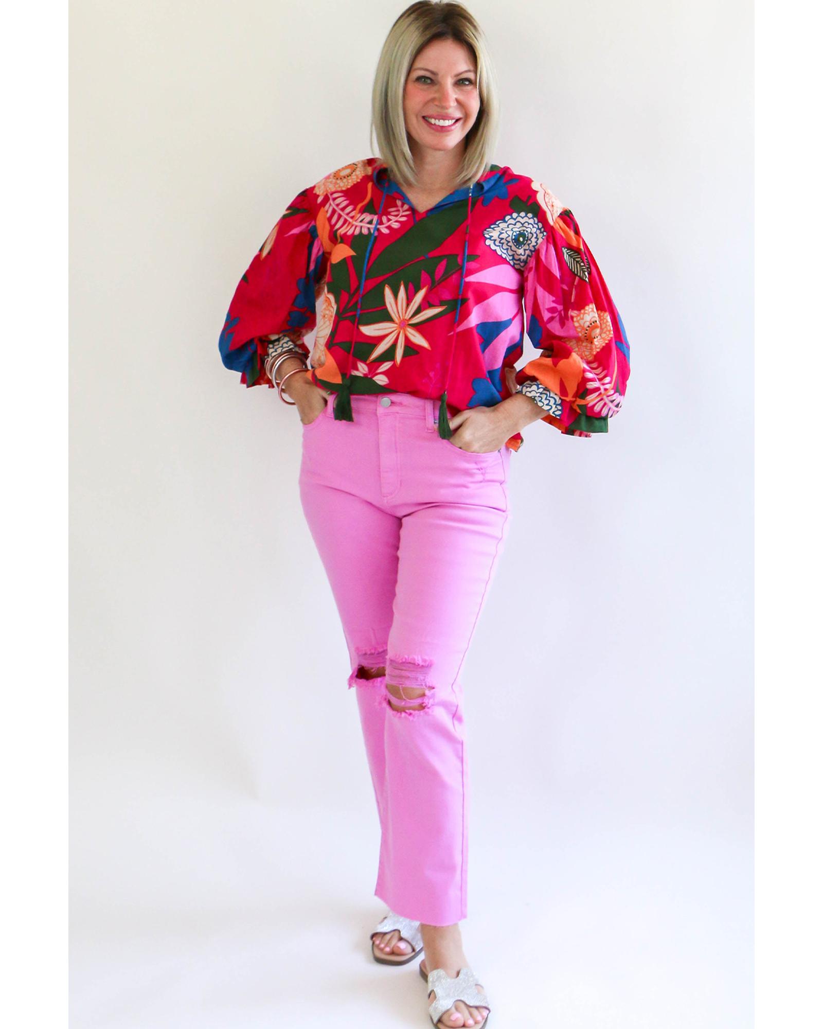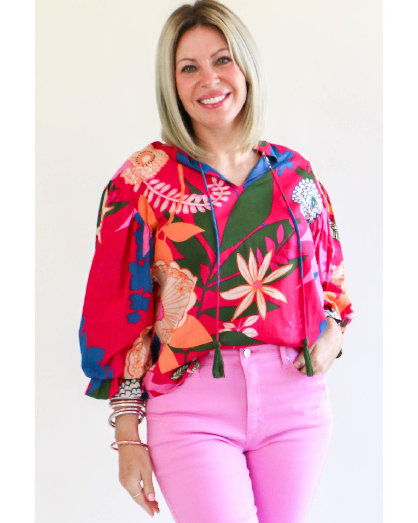 Rose Blooming Flower Print Ruffled Puff Sleeve Blouse – M
