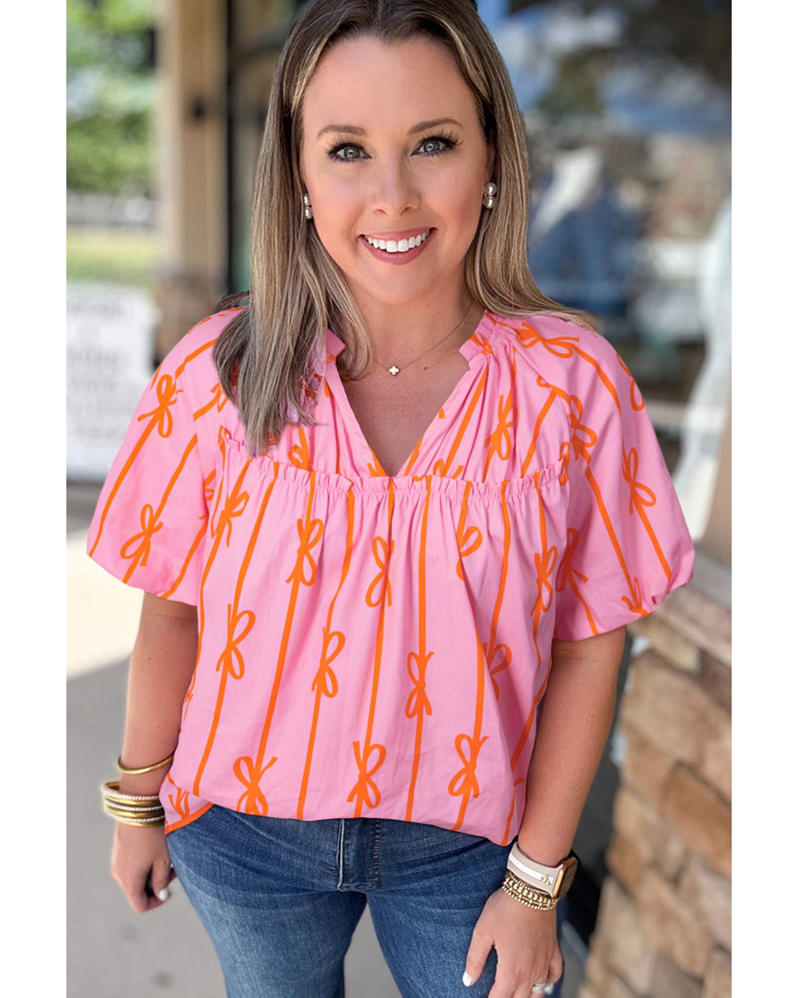 Rose Bowknot Print Shirred V Neck Puff Sleeve Plus Size Blouse – 3X