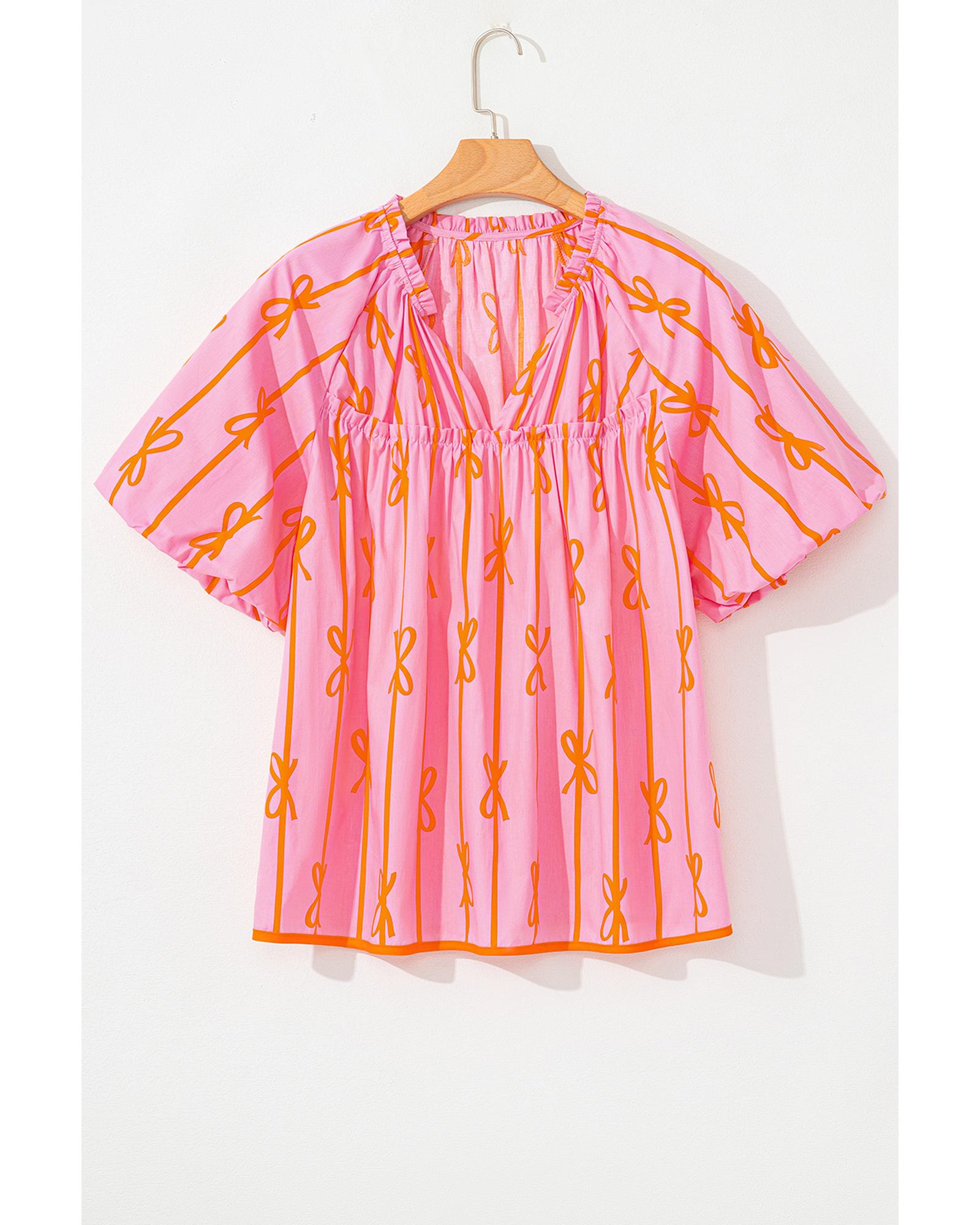 Rose Bowknot Print Shirred V Neck Puff Sleeve Plus Size Blouse – 4X