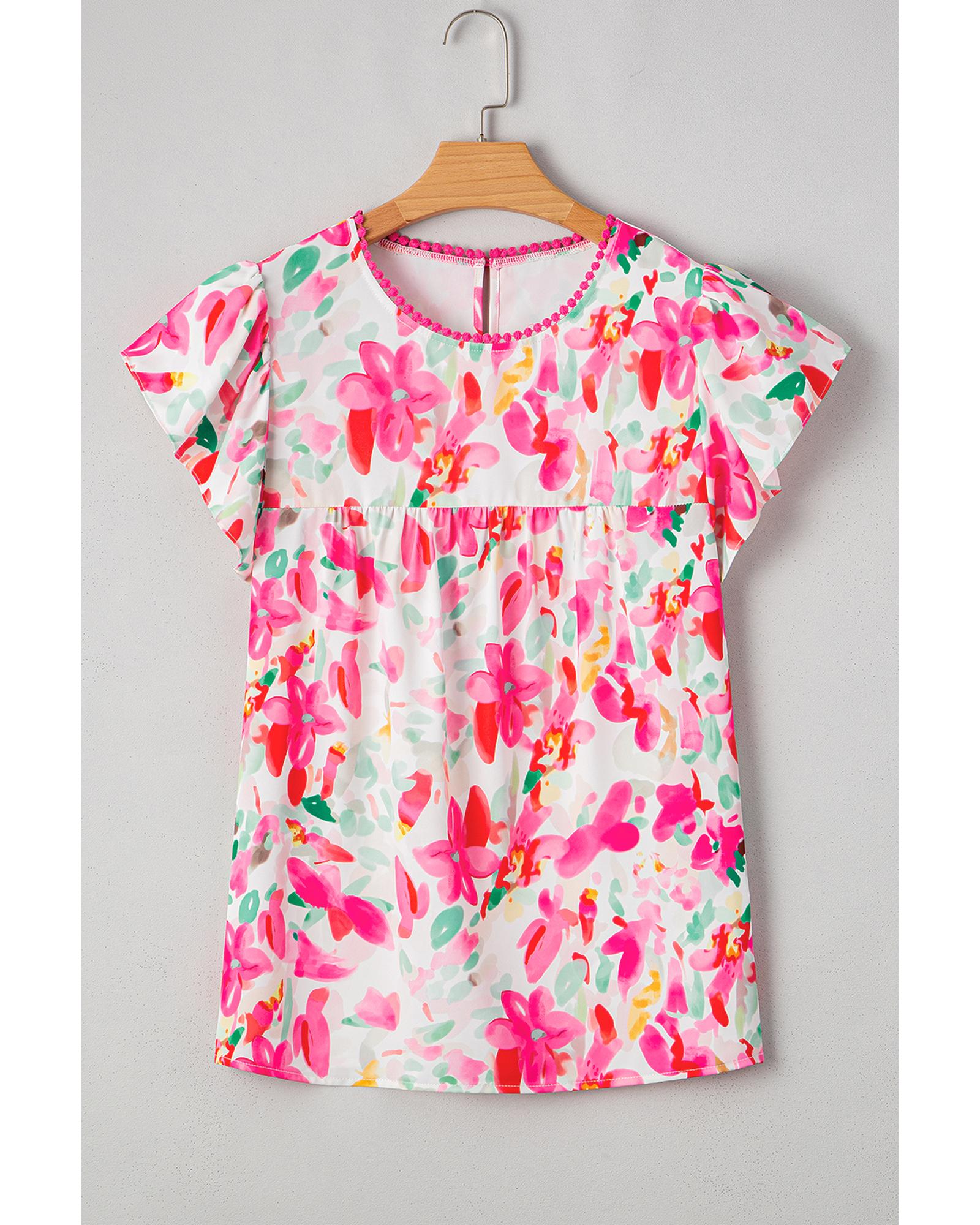 - Rose Floral Print Flutter Sleeve Round Neck Casual Blouse