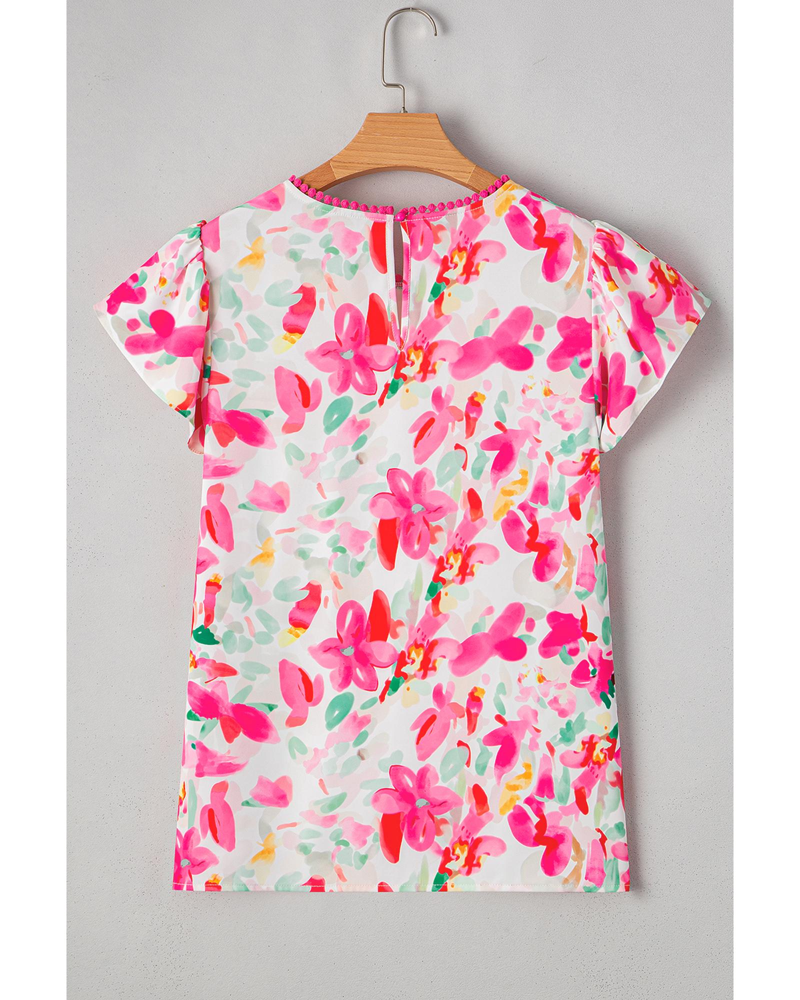- Rose Floral Print Flutter Sleeve Round Neck Casual Blouse