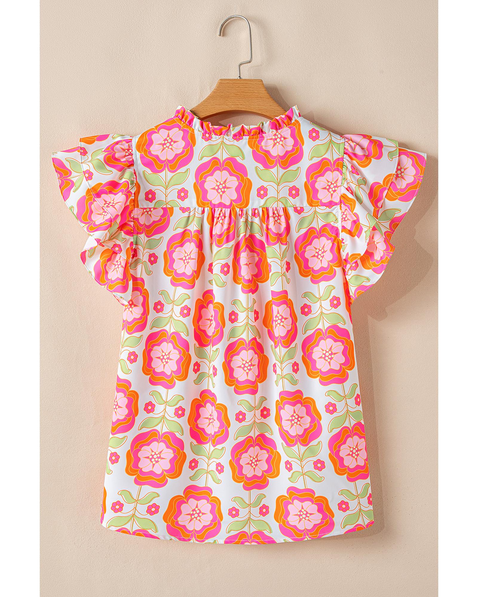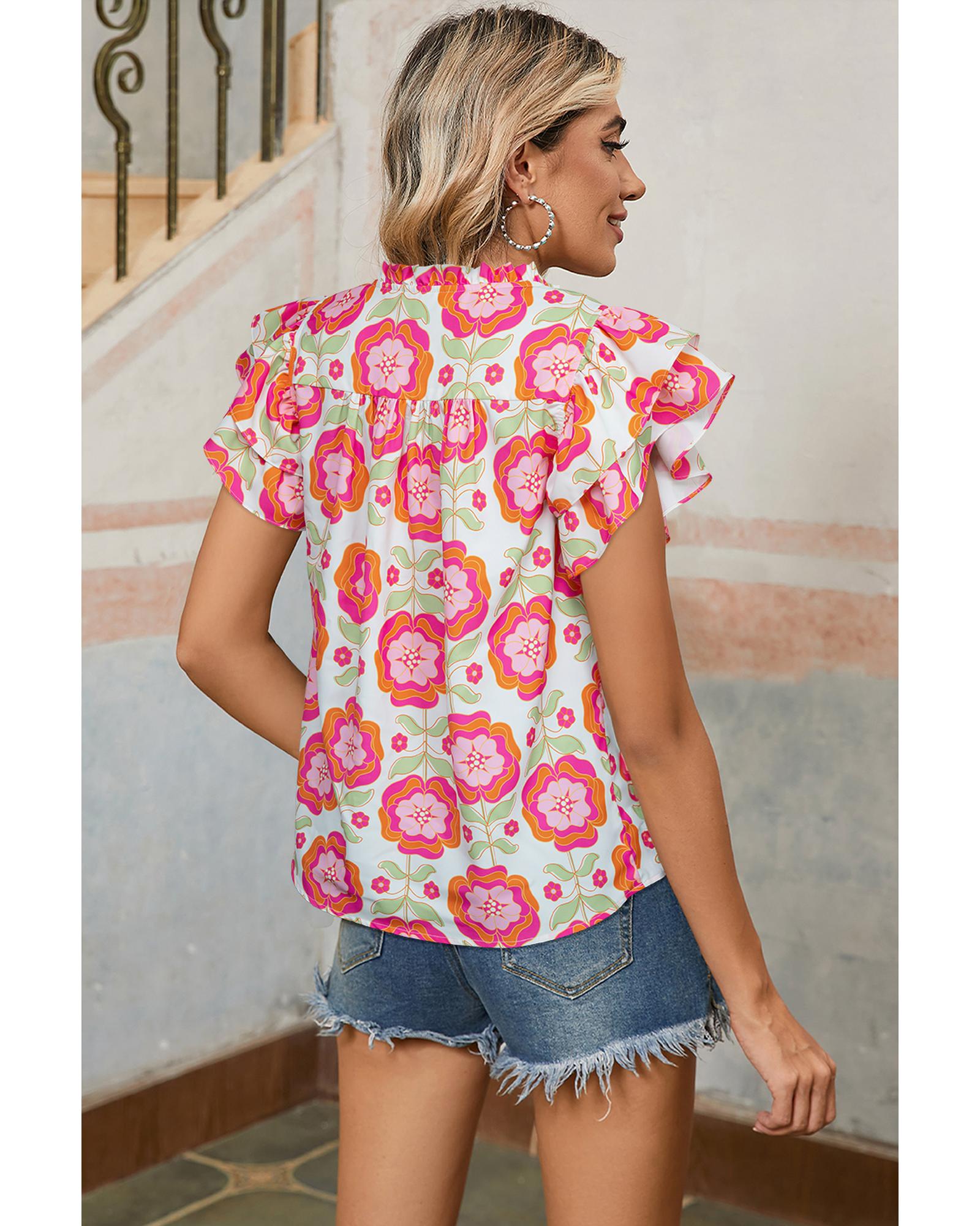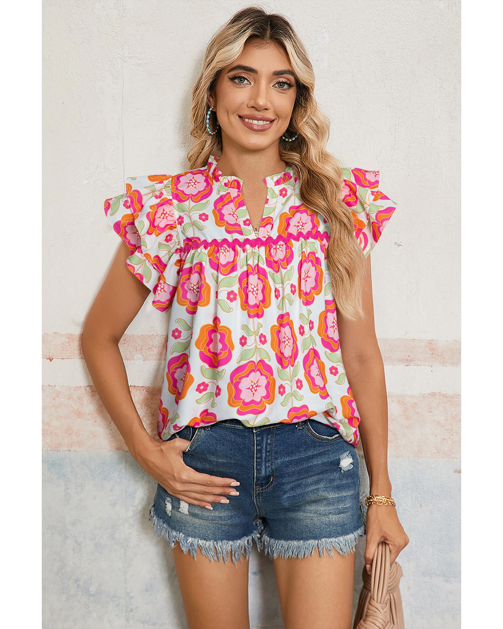 Rose Floral Ruffled Sleeve Ric-rac Trim Split Neck Loose Blouse – M