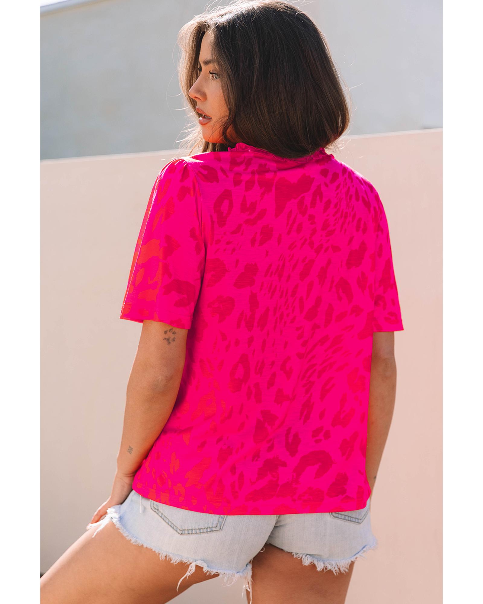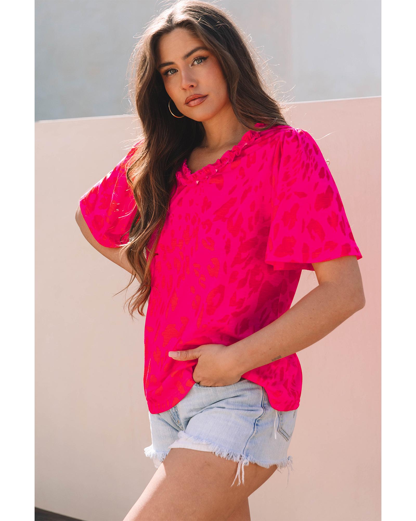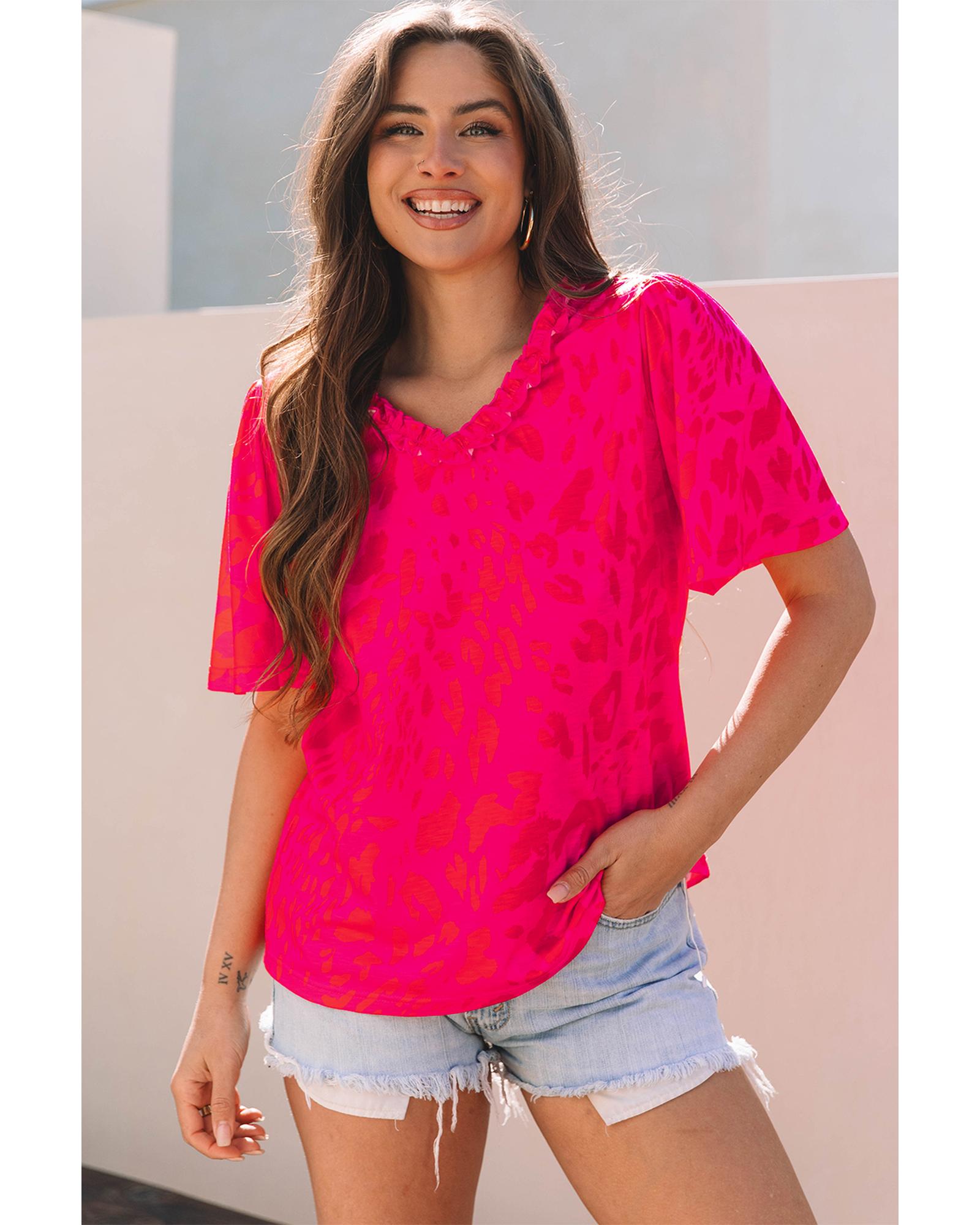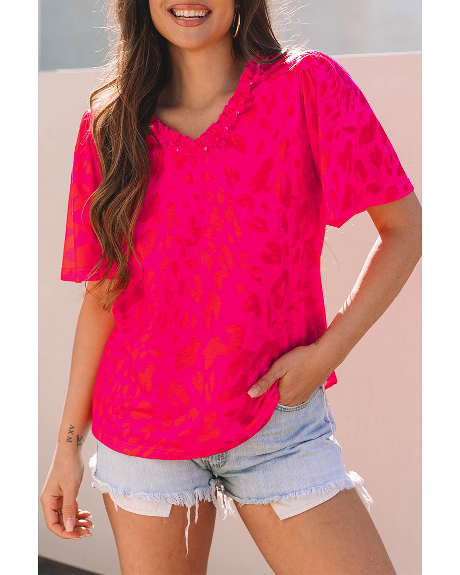 Rose Leopard Frilly V Neck Short Sleeve Blouse – S