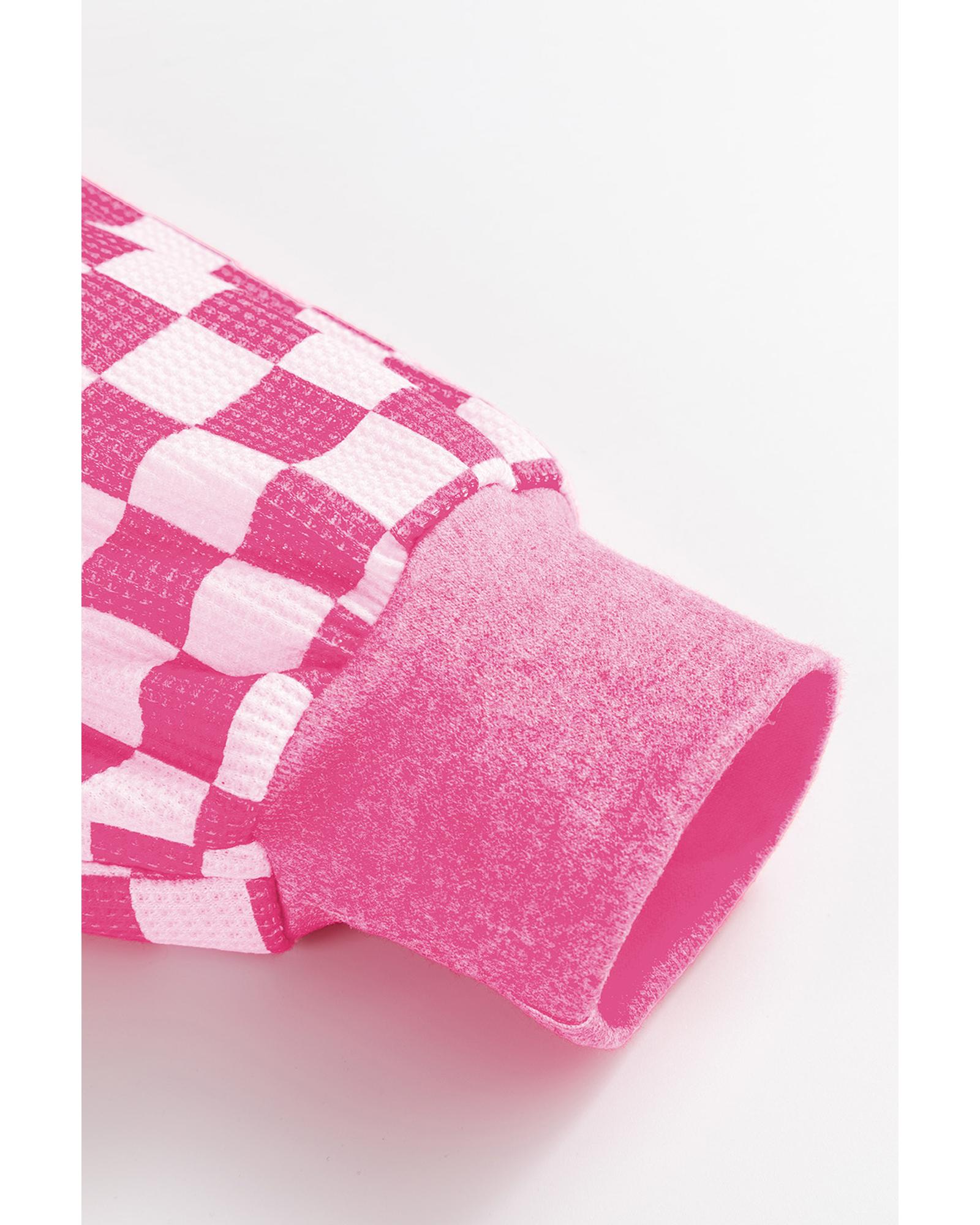 Rose Red Checkerboard Striped Patchwork Lantern Sleeve Pocketed Blouse – S