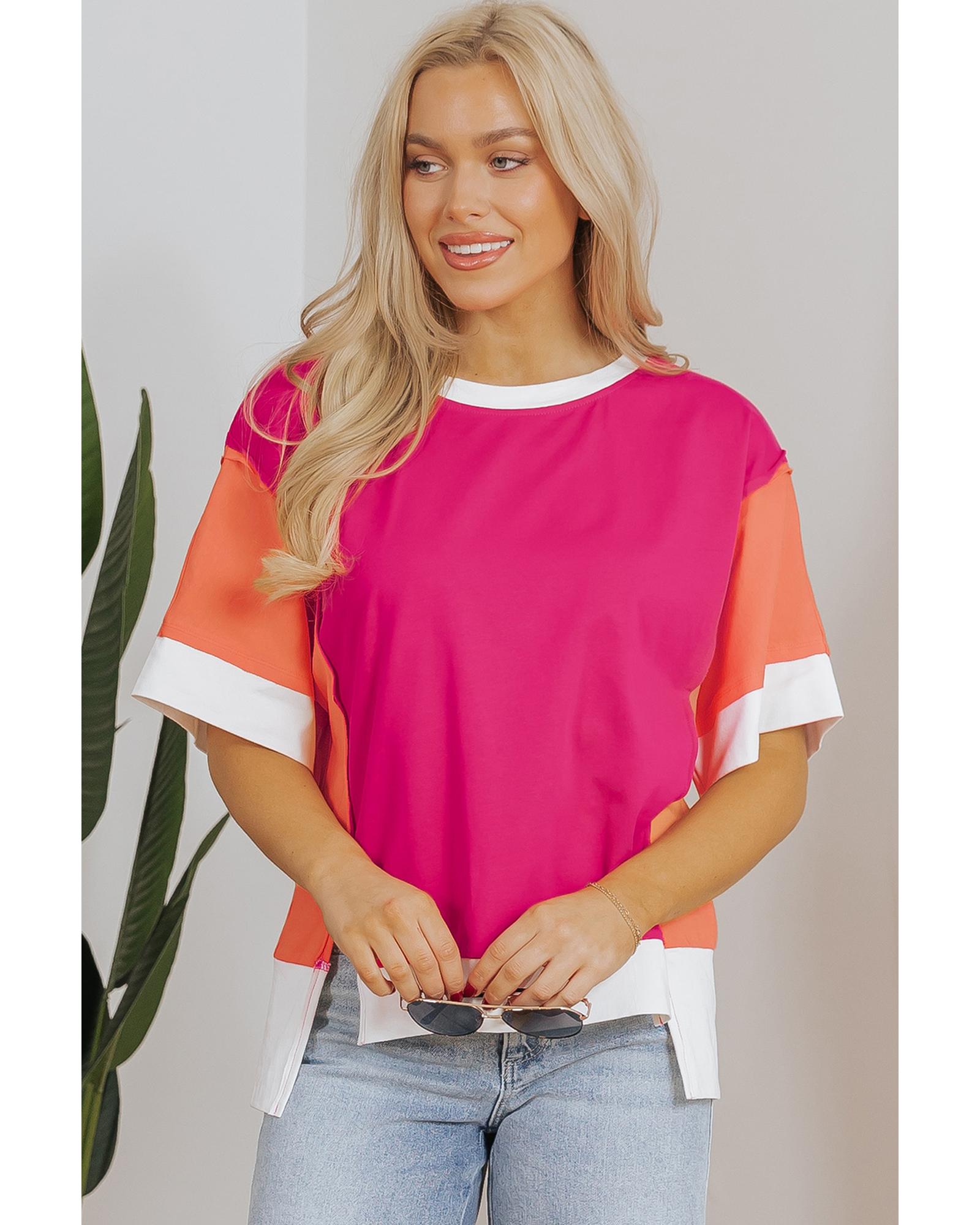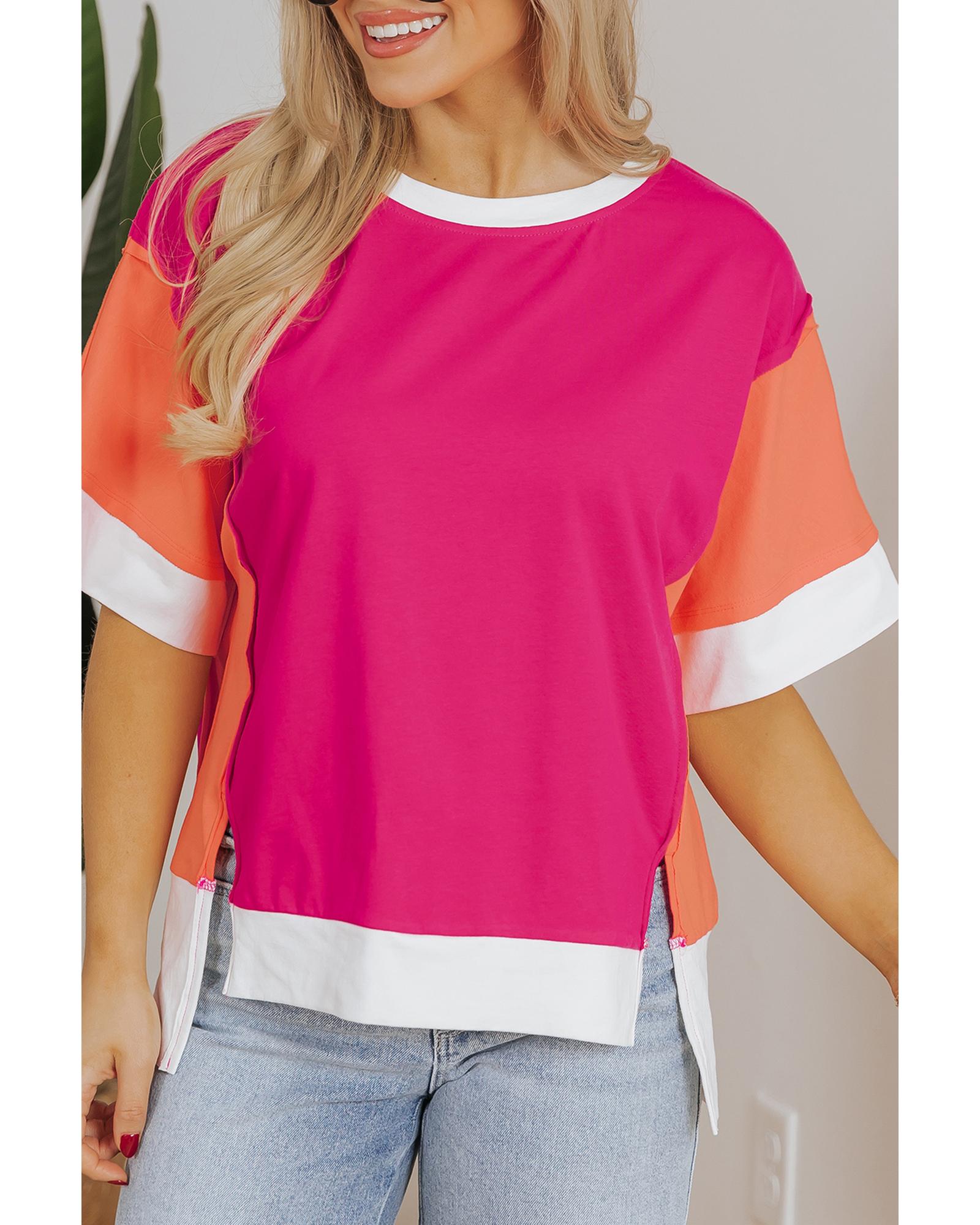 Rose Red Color Block Patchwork Side Slits Loose Fit T Shirt – M