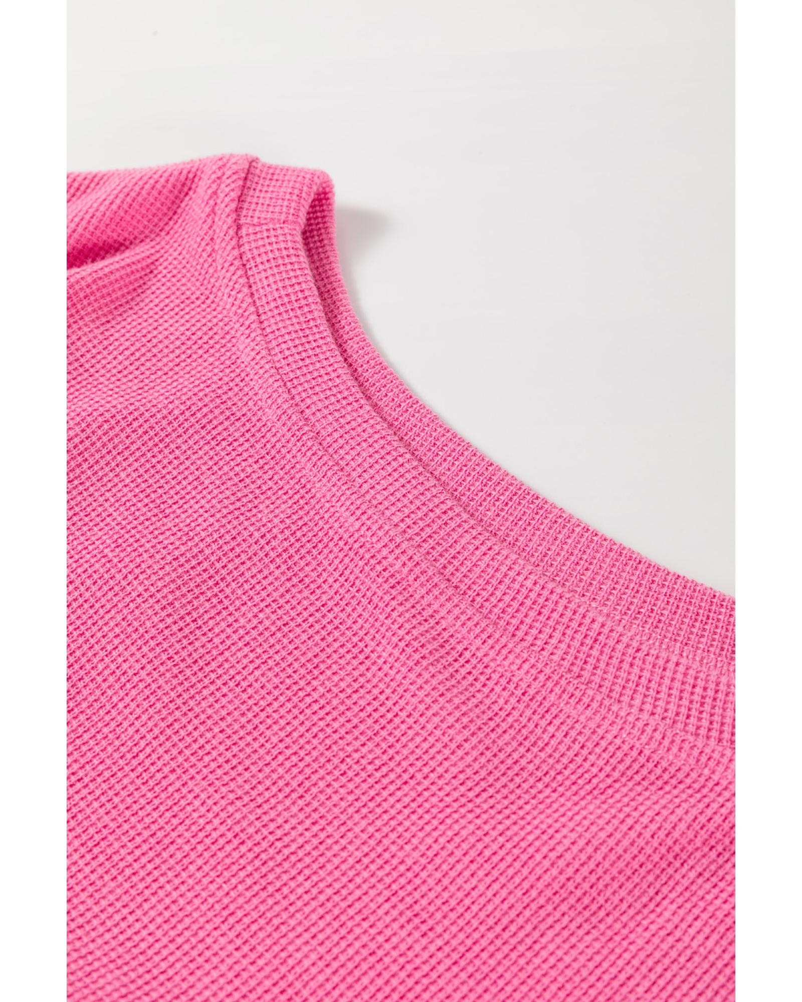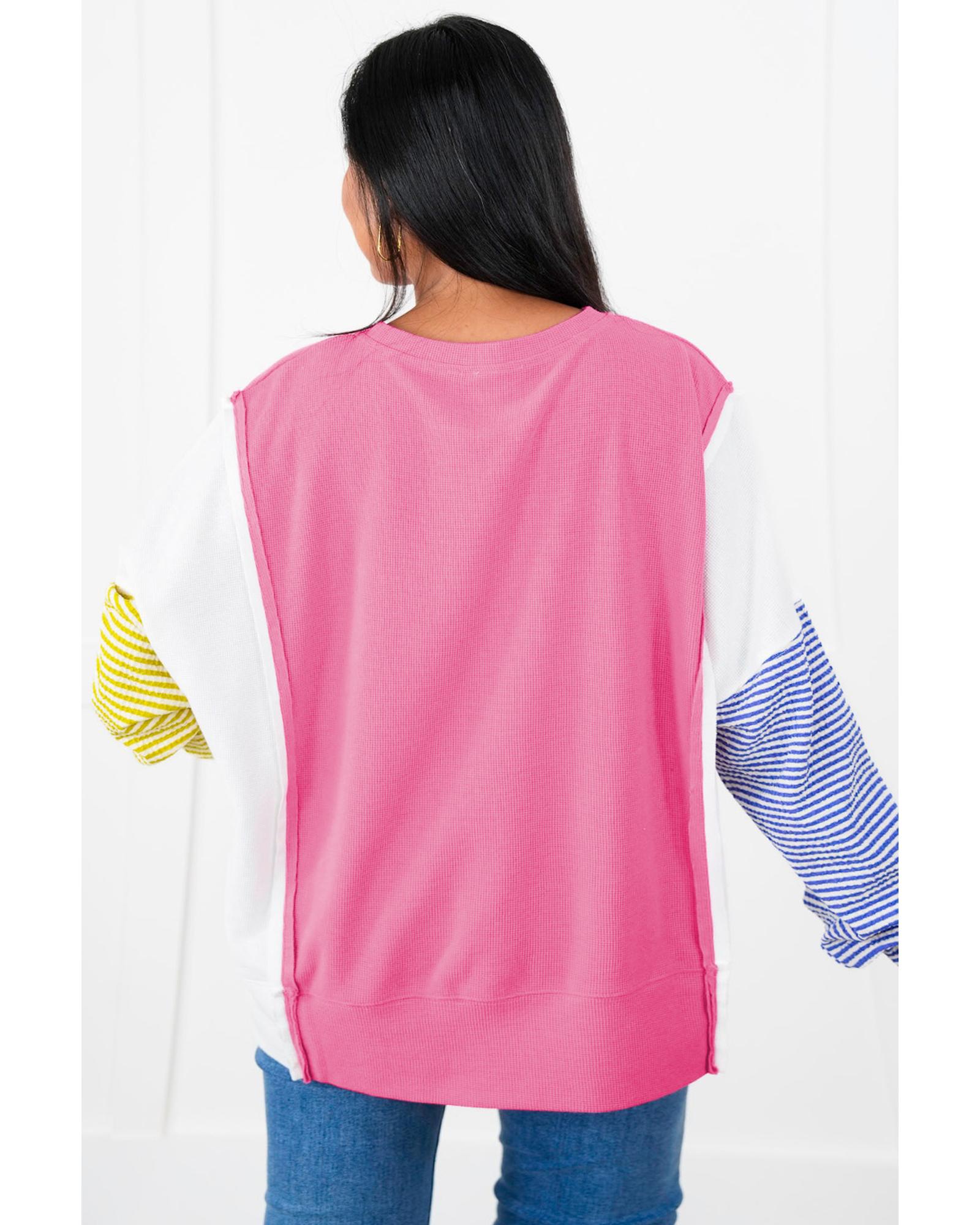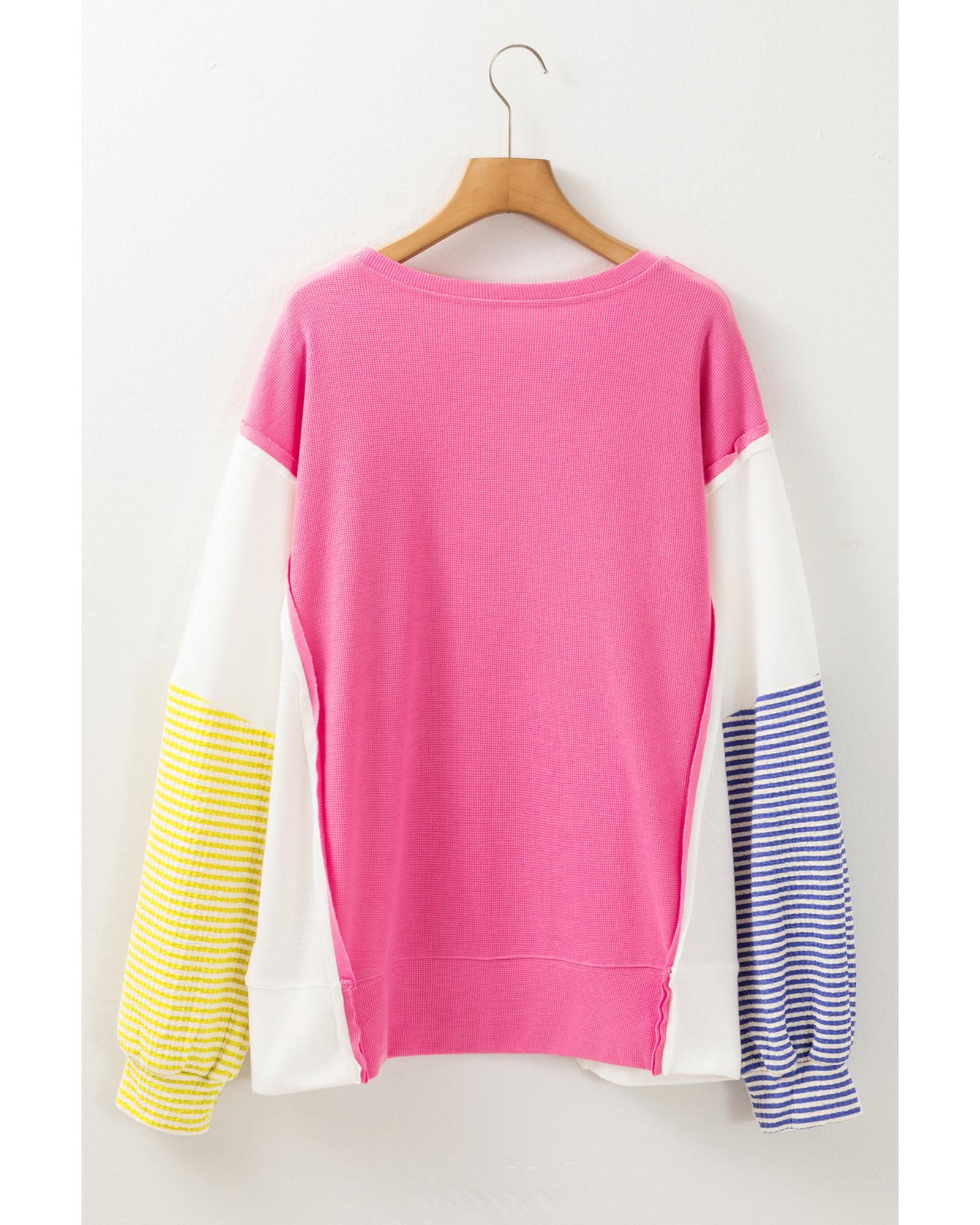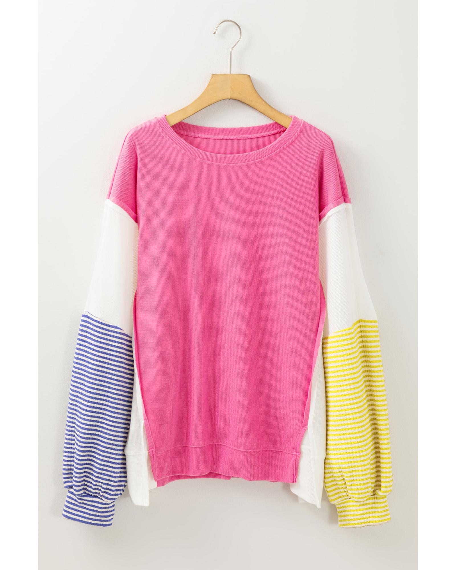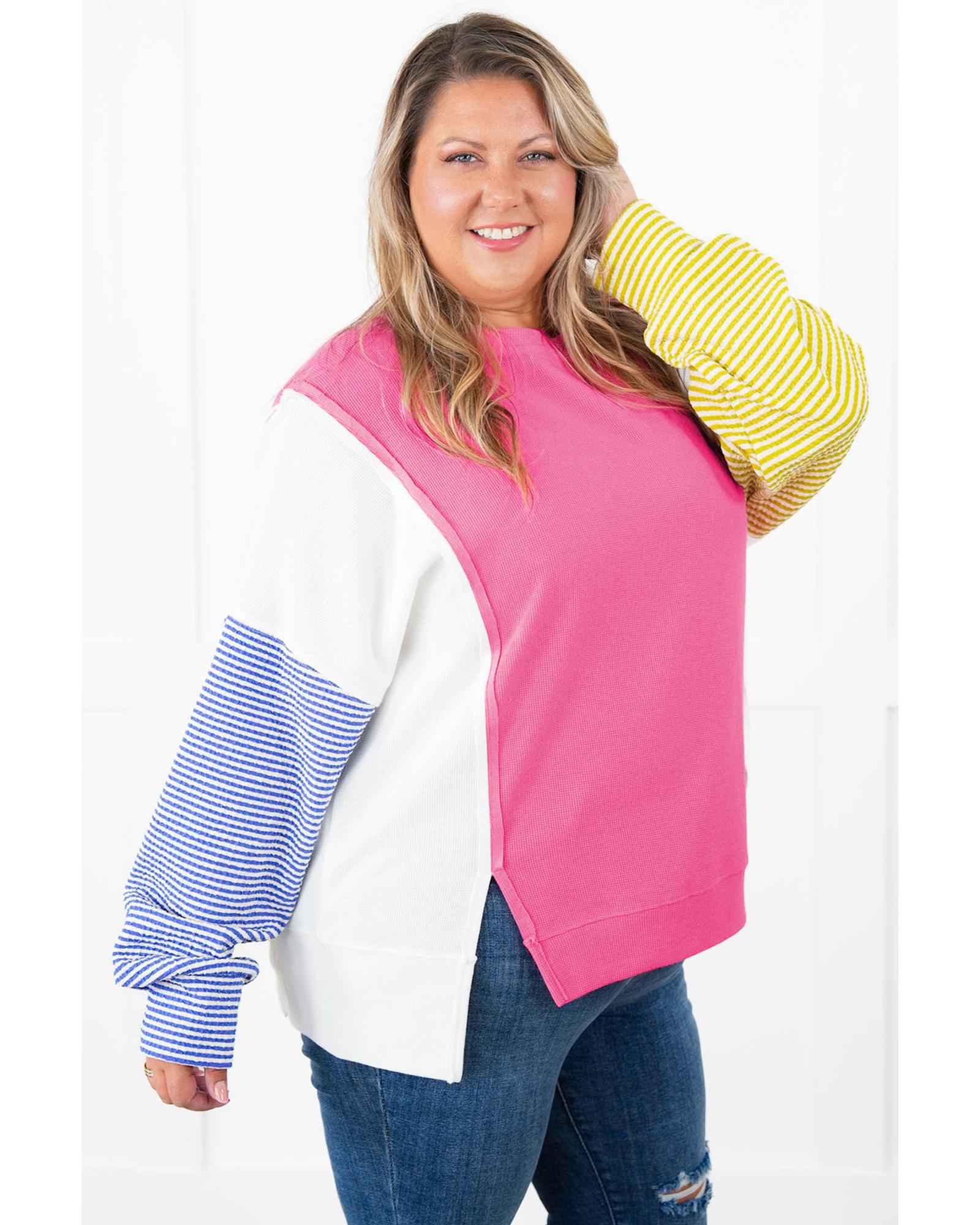 Rose Red Colorblock Patchwork Striped Puff Sleeve Plus Size Top with Slits – 1X