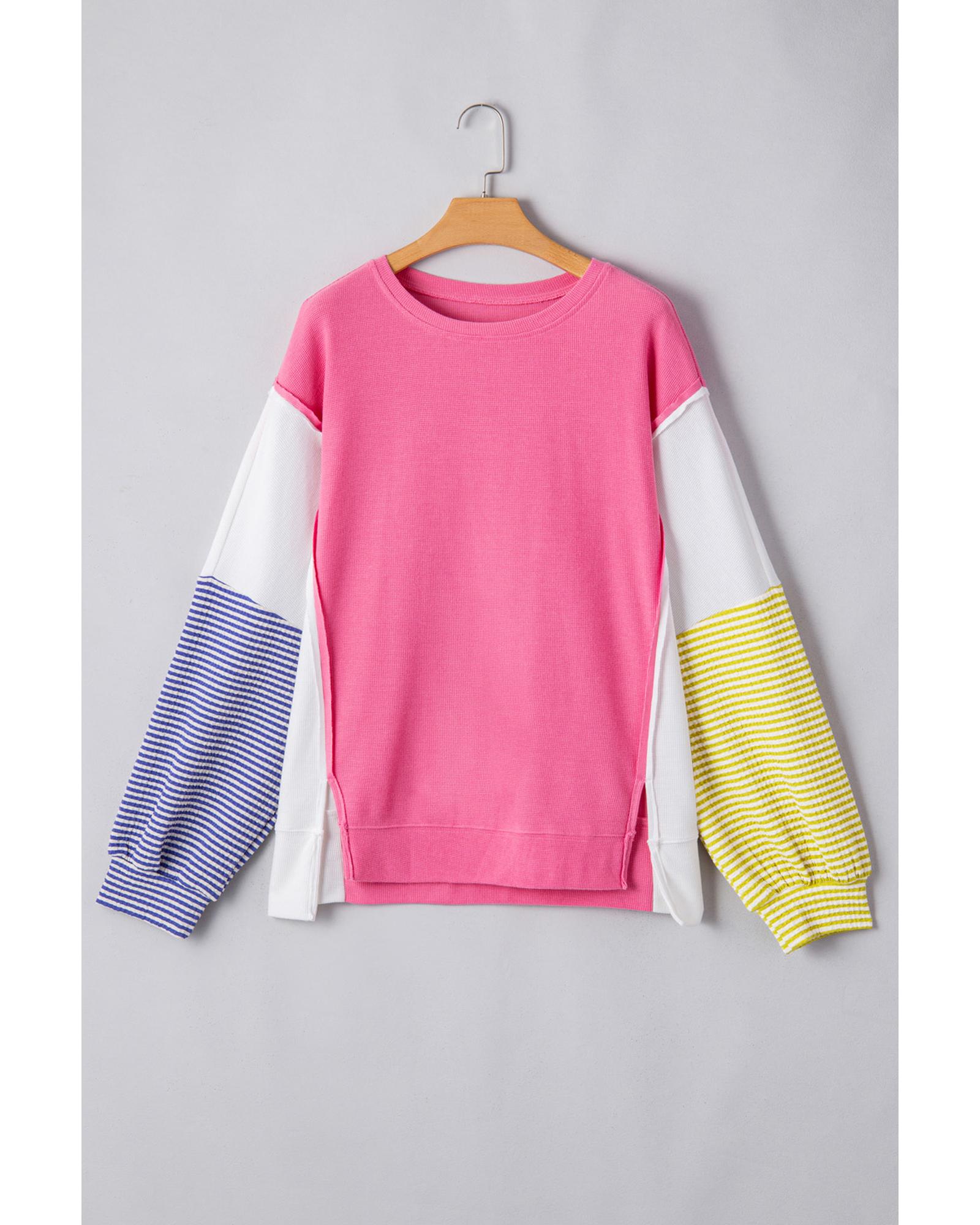 Rose Red Colorblock Patchwork Striped Puff Sleeve Plus Size Top with Slits – 2X