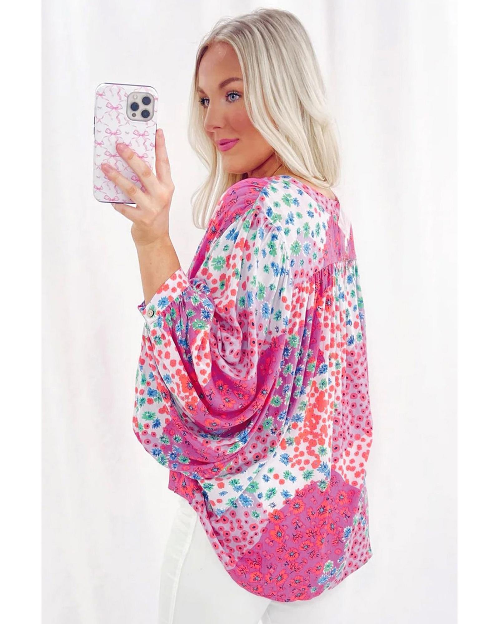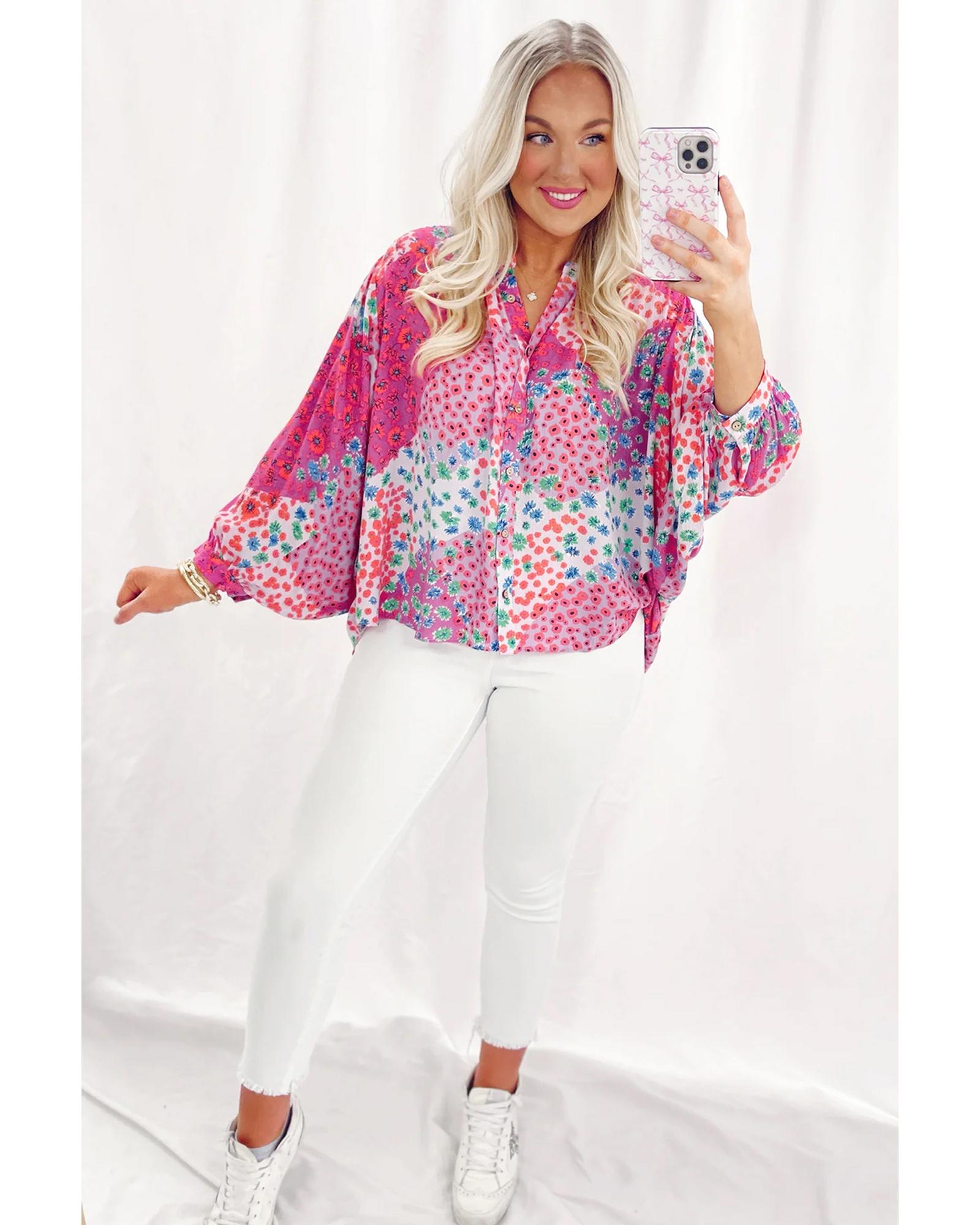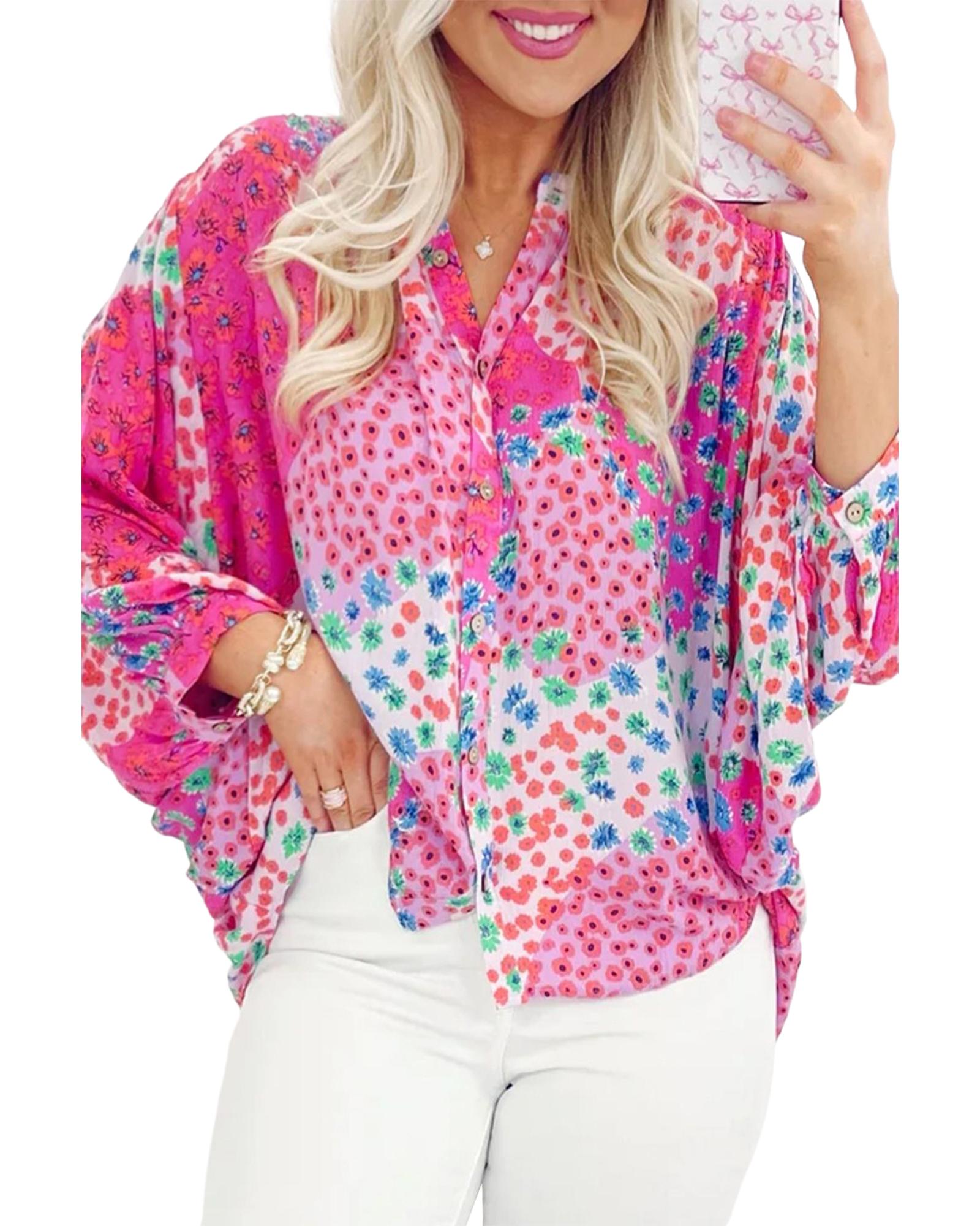 Rose Red Floral Allover Print Buttoned V Neck Oversized Shirt – S