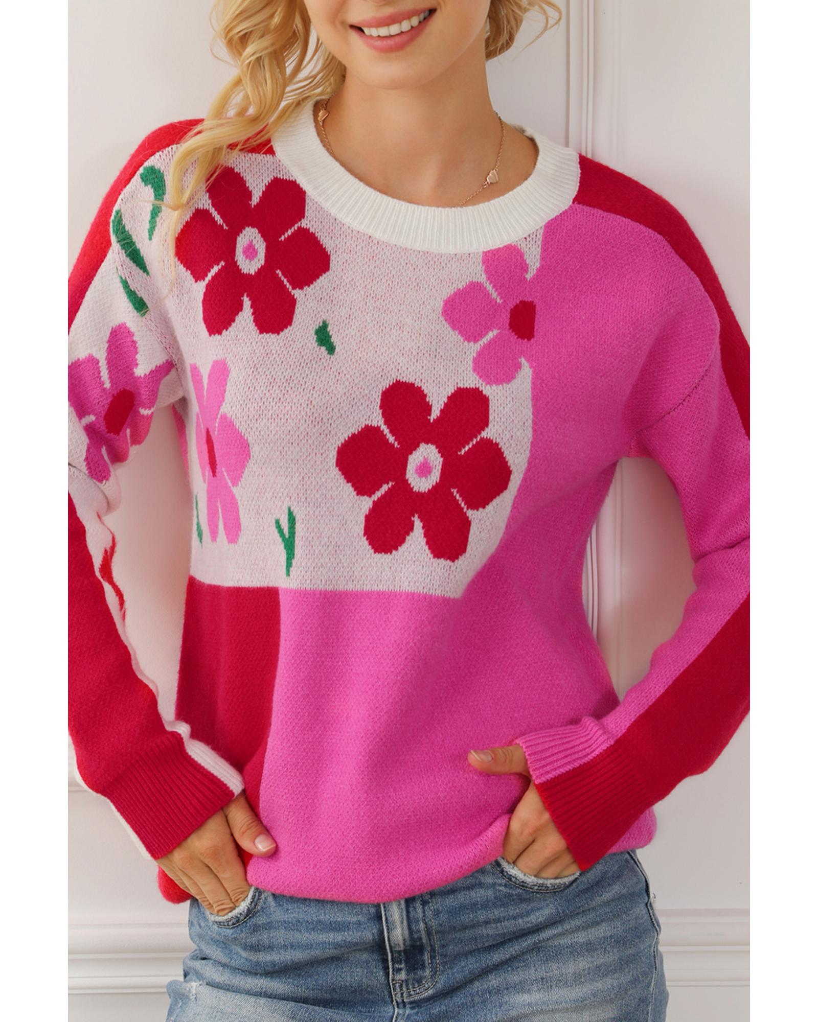 Rose Red Floral Mixed Color Block Sweater – L