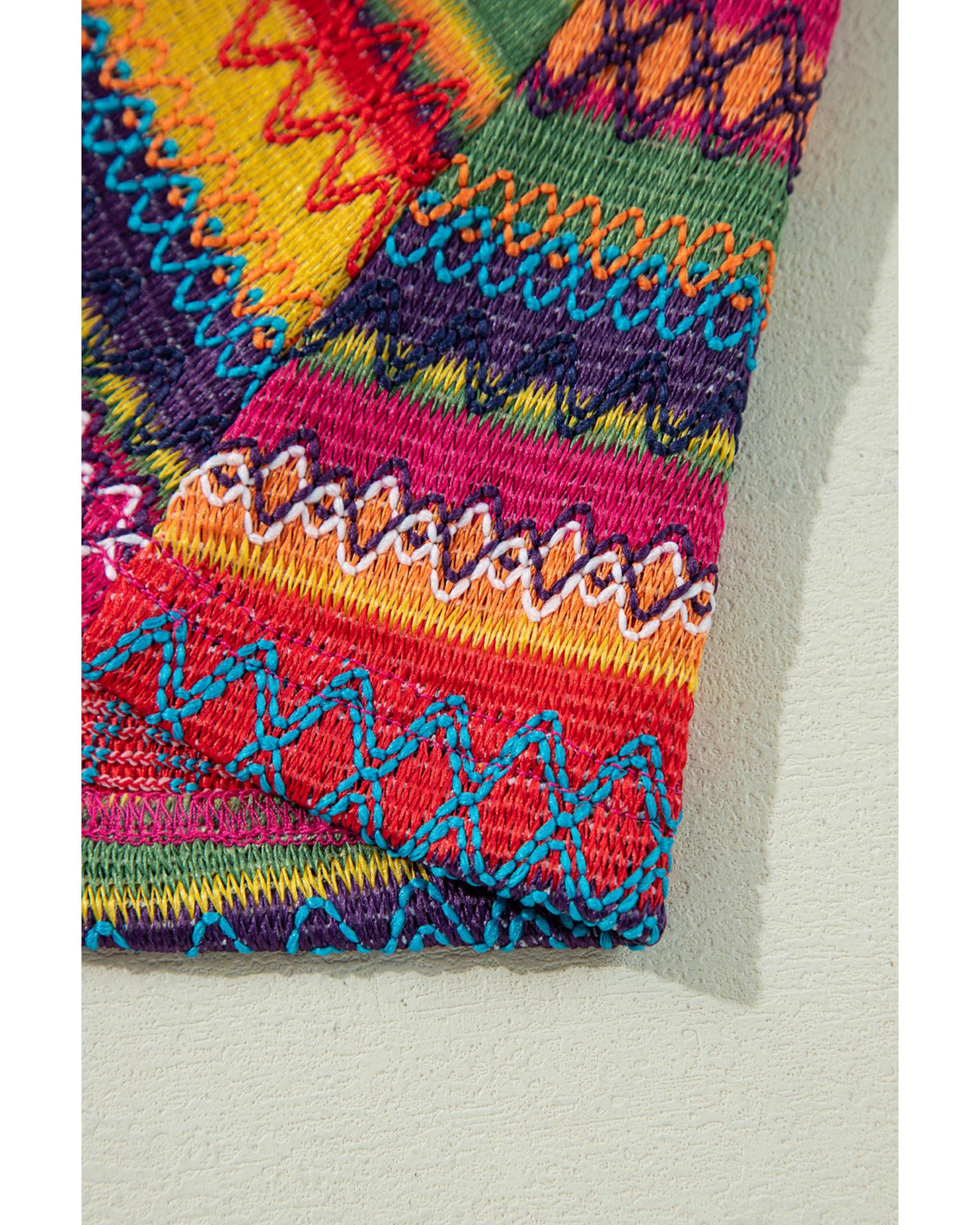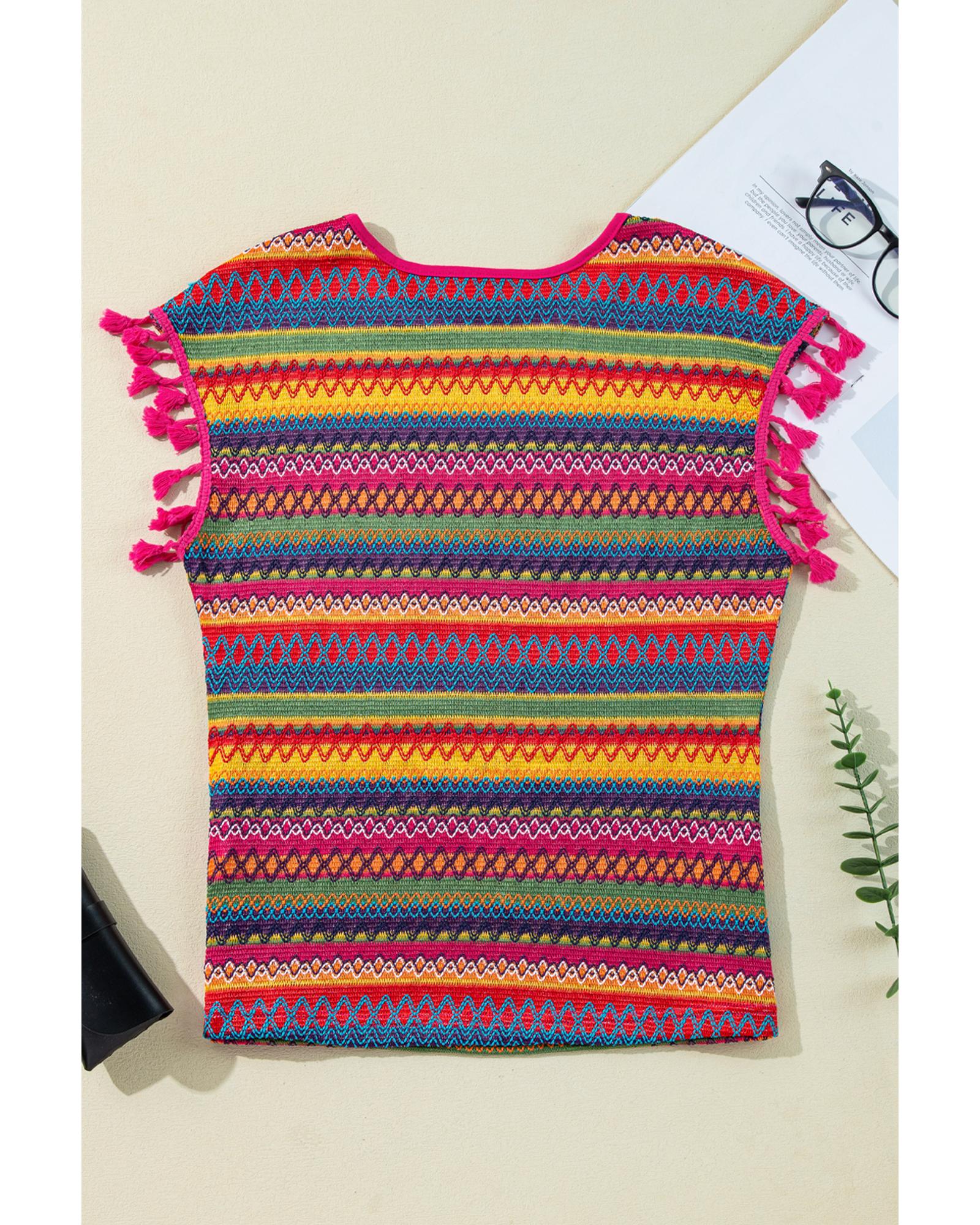 Rose Red Jacquard Textured Tasseled Cap Sleeve Top – S