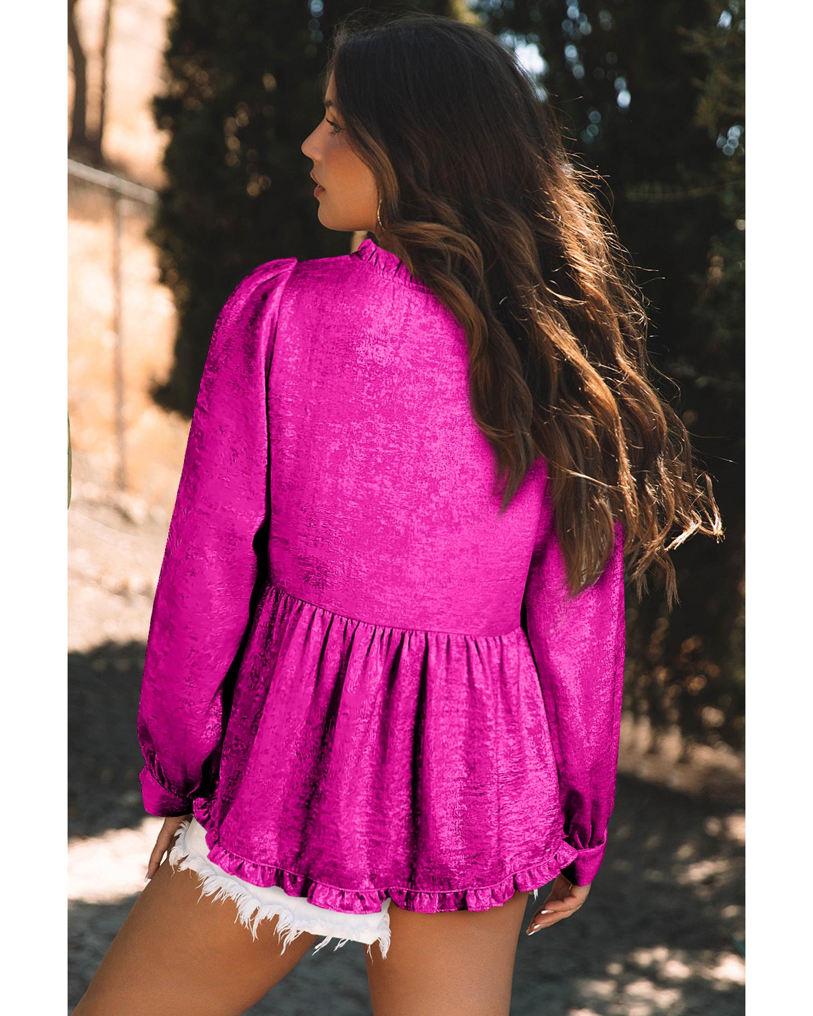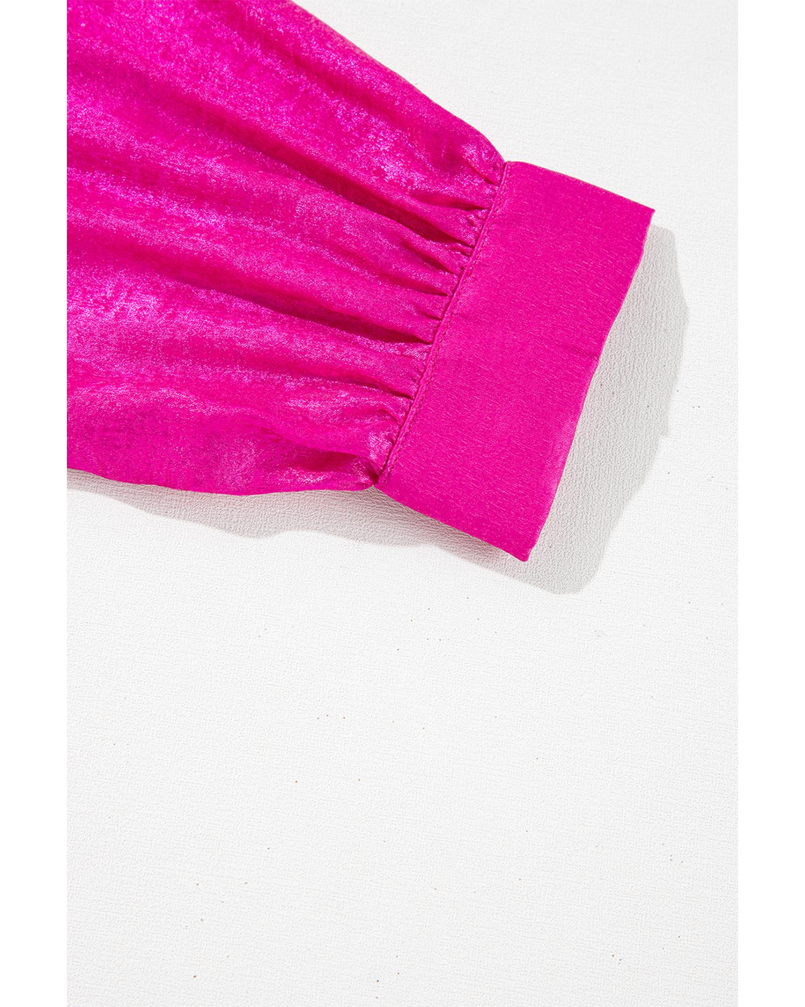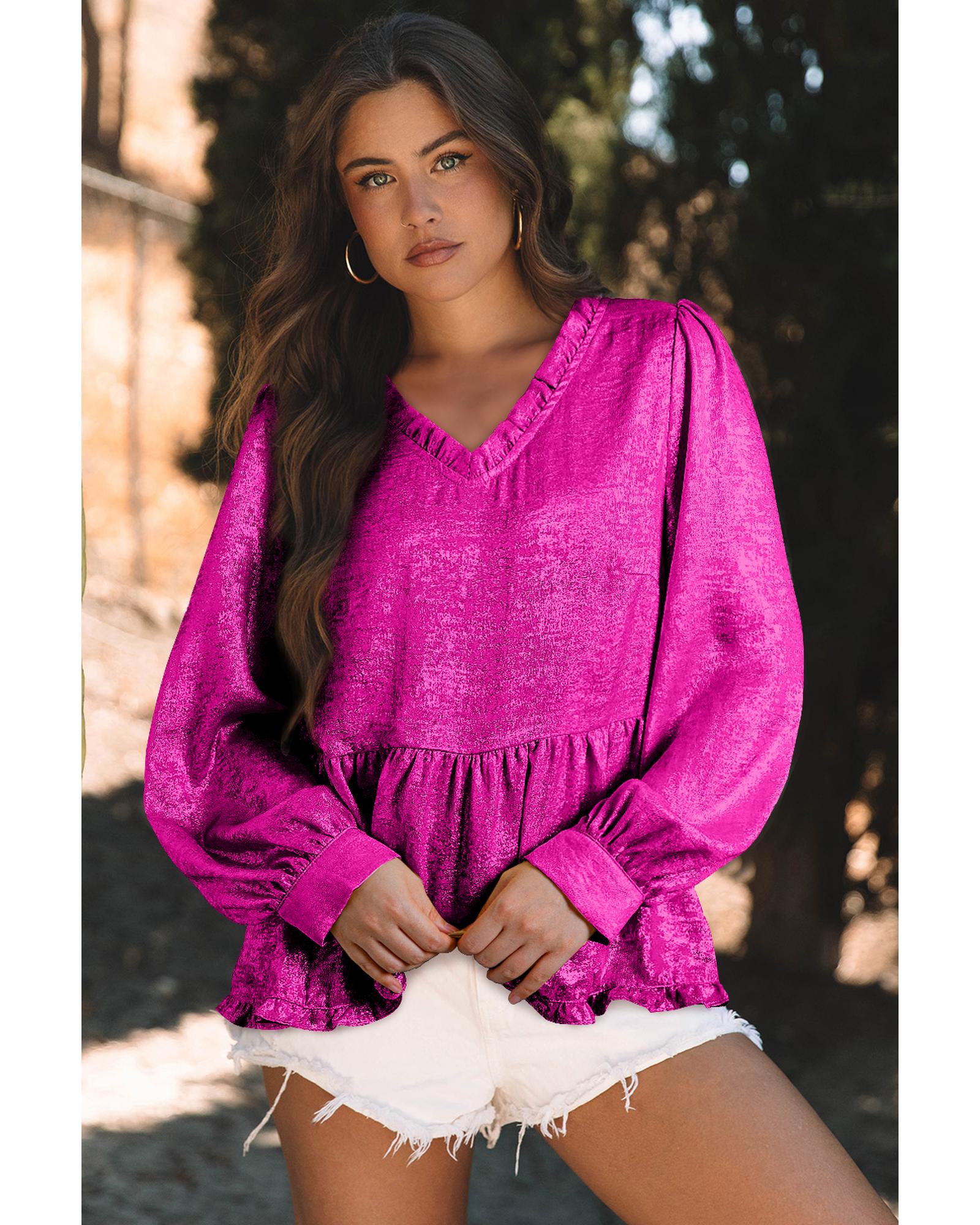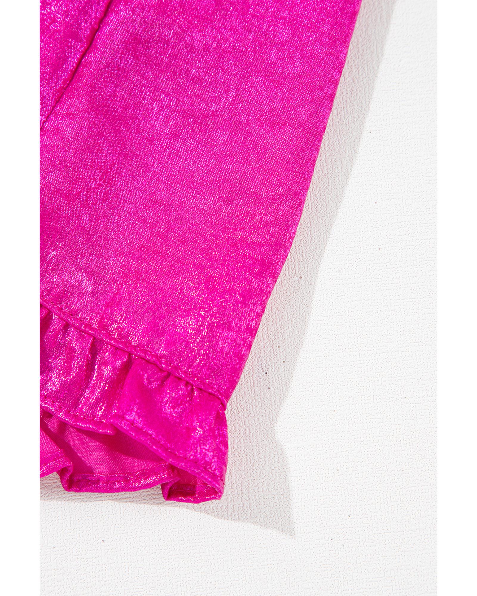 Rose Red Metallic Frilled V Neck Puff Sleeve Babydoll Blouse – XL
