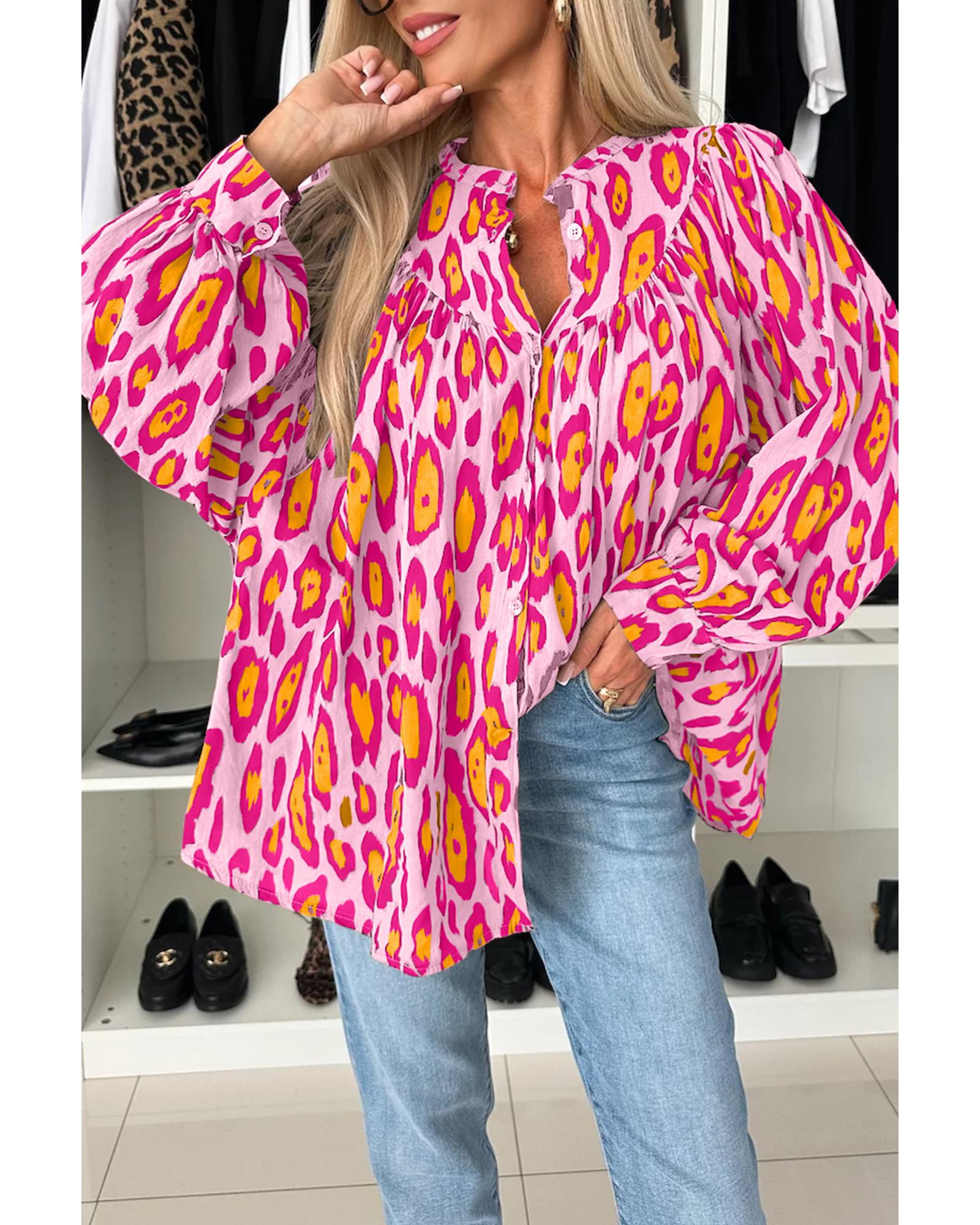 Rose Red Oversized Leopard Print Balloon Sleeve Casual Shirt – S