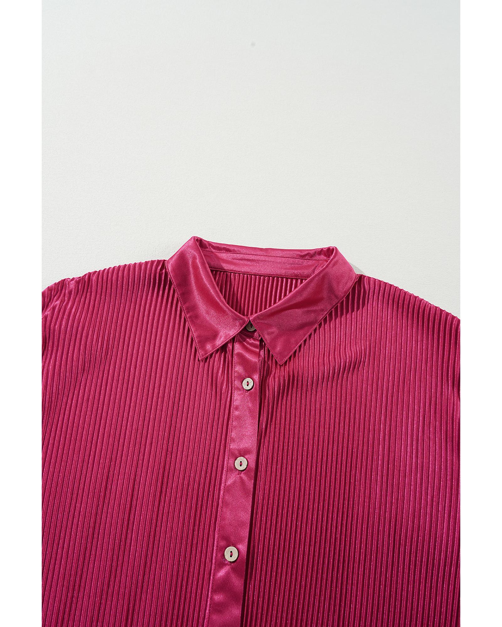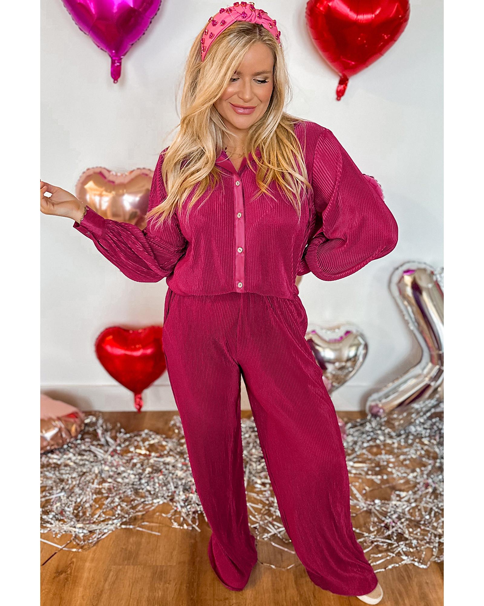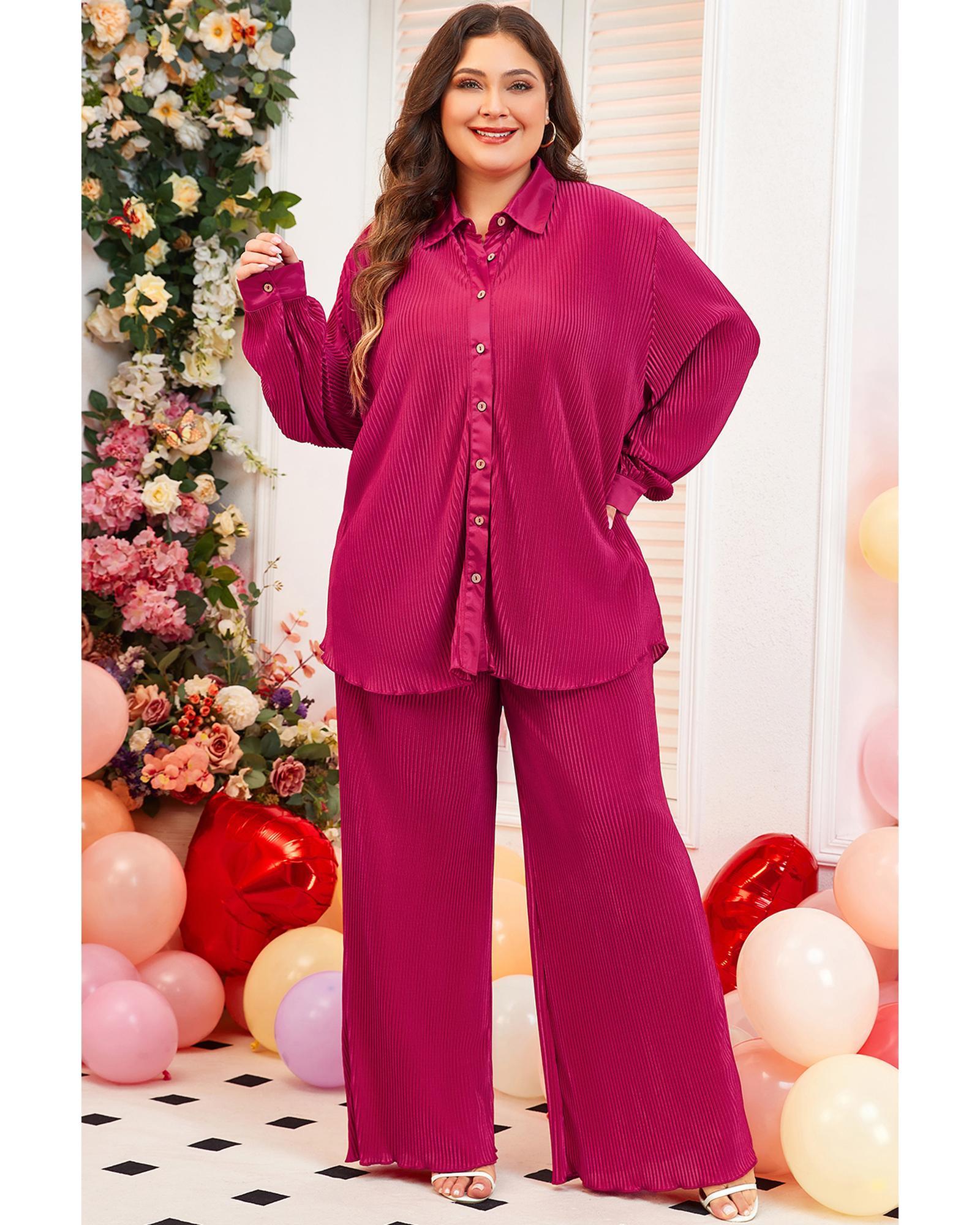 Rose Red Plus Size Ribbed Long Sleeve Shirt and Pants Pajama Set – 2X