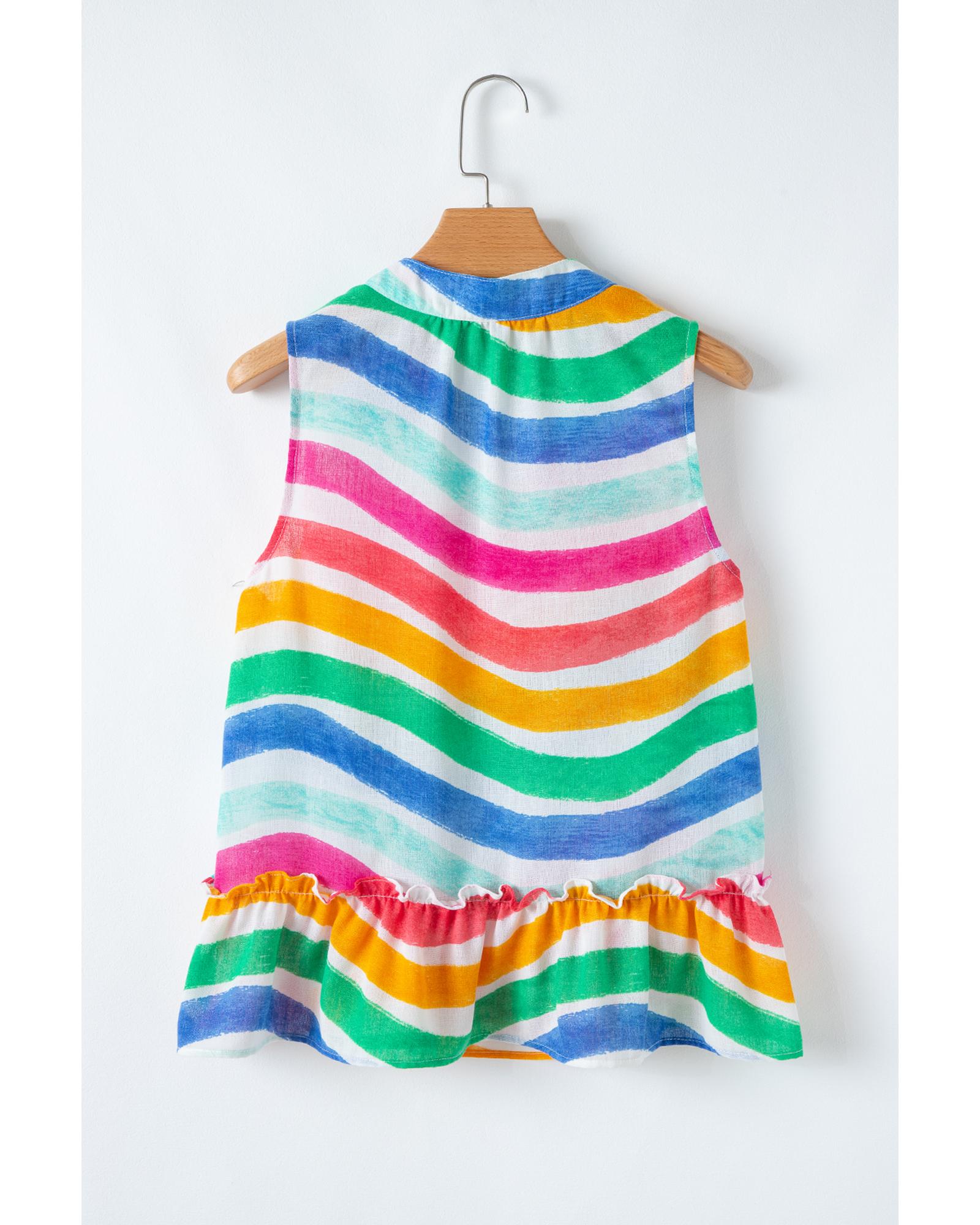- Rose Red Rainbow Stripes Ruffled Hem Drawstring V Neck Tank Top