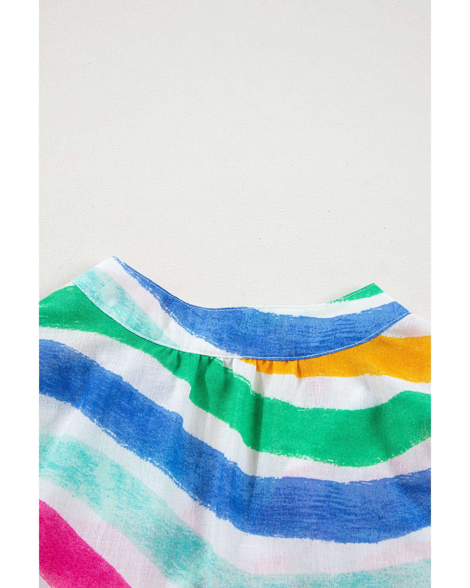 - Rose Red Rainbow Stripes Ruffled Hem Drawstring V Neck Tank Top