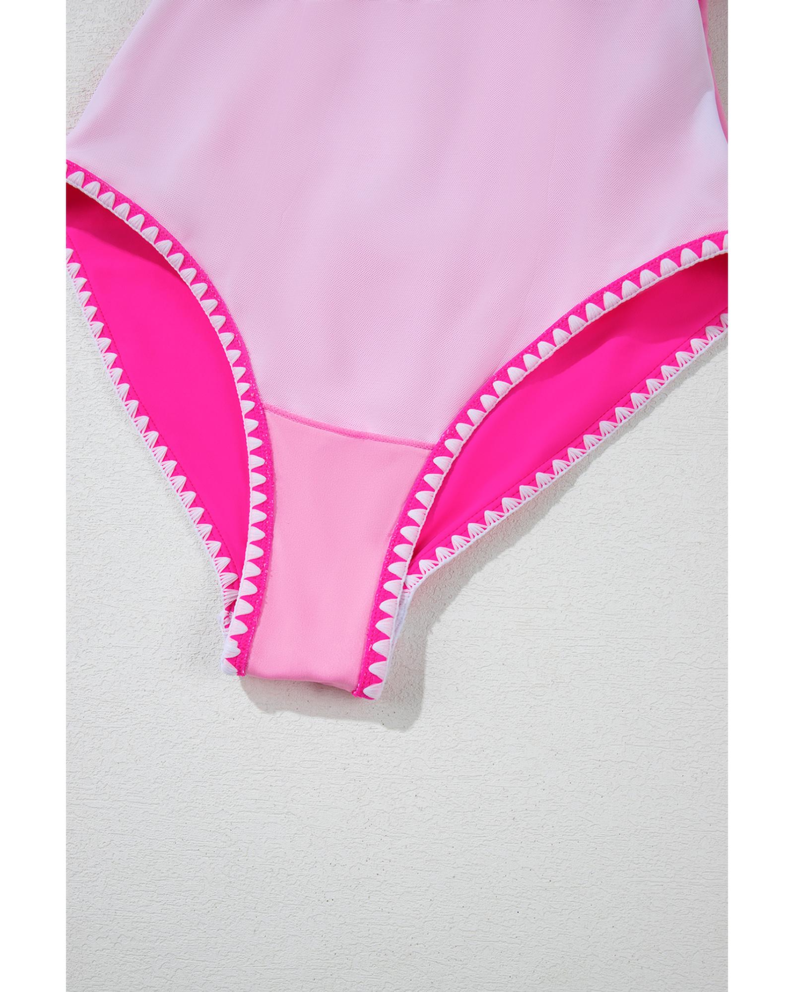Rose Red Ric Rac Trim Contrasted Patchwork Cutout One Piece Swimsuit – L