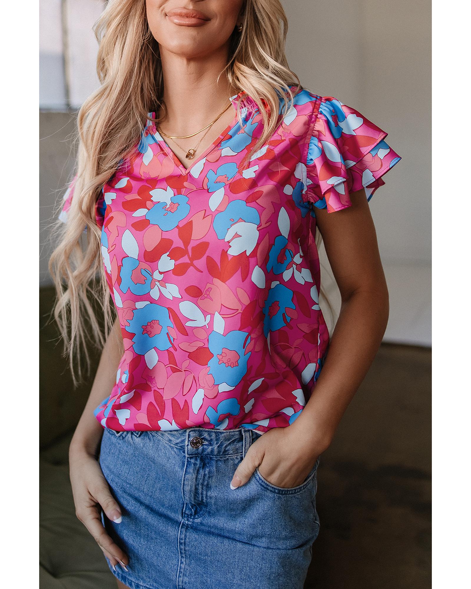 Rose Red Ruffled Sleeve Floral Blouse – M