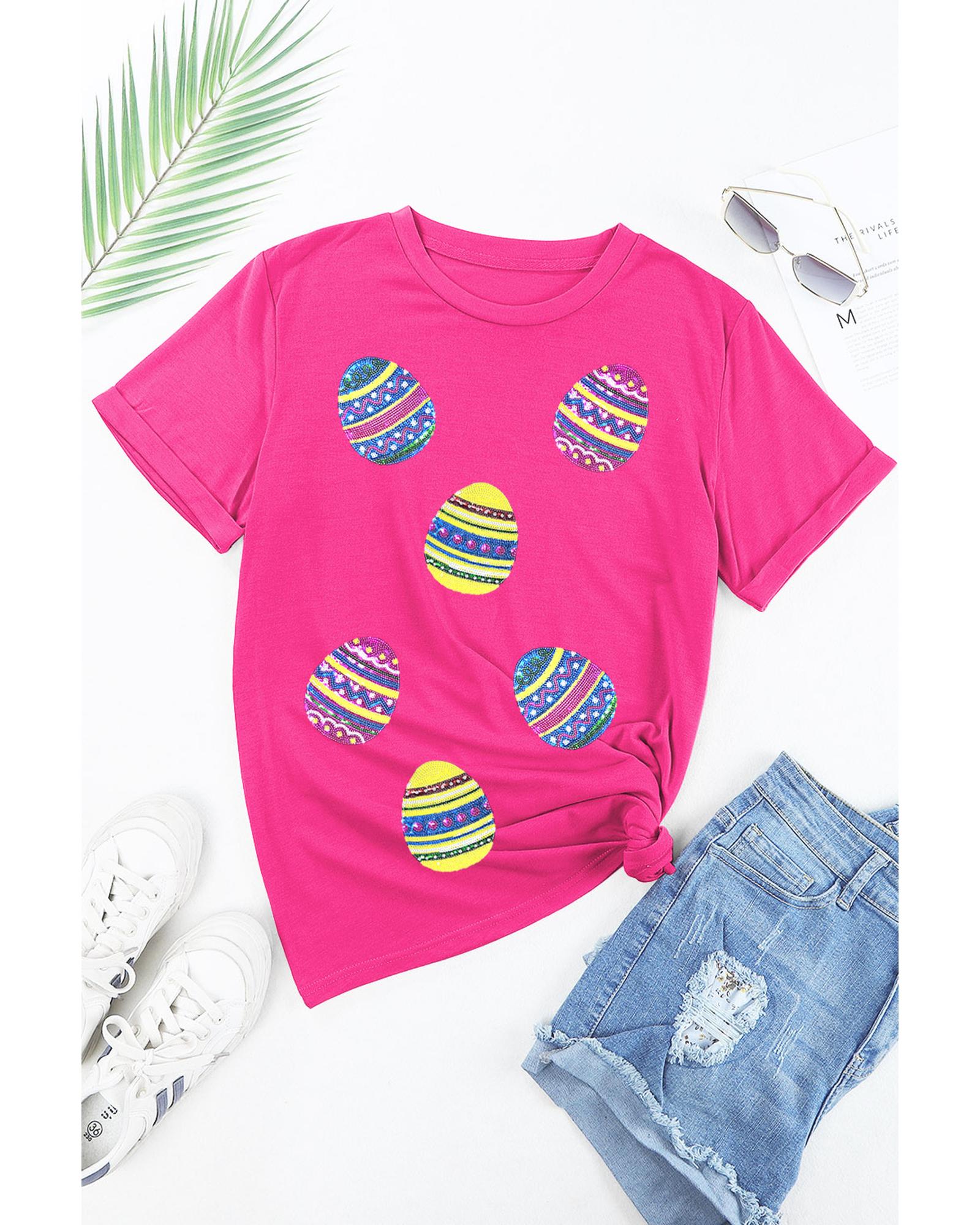 Rose Red Sequin Easter Egg Graphic Casual T Shirt – S