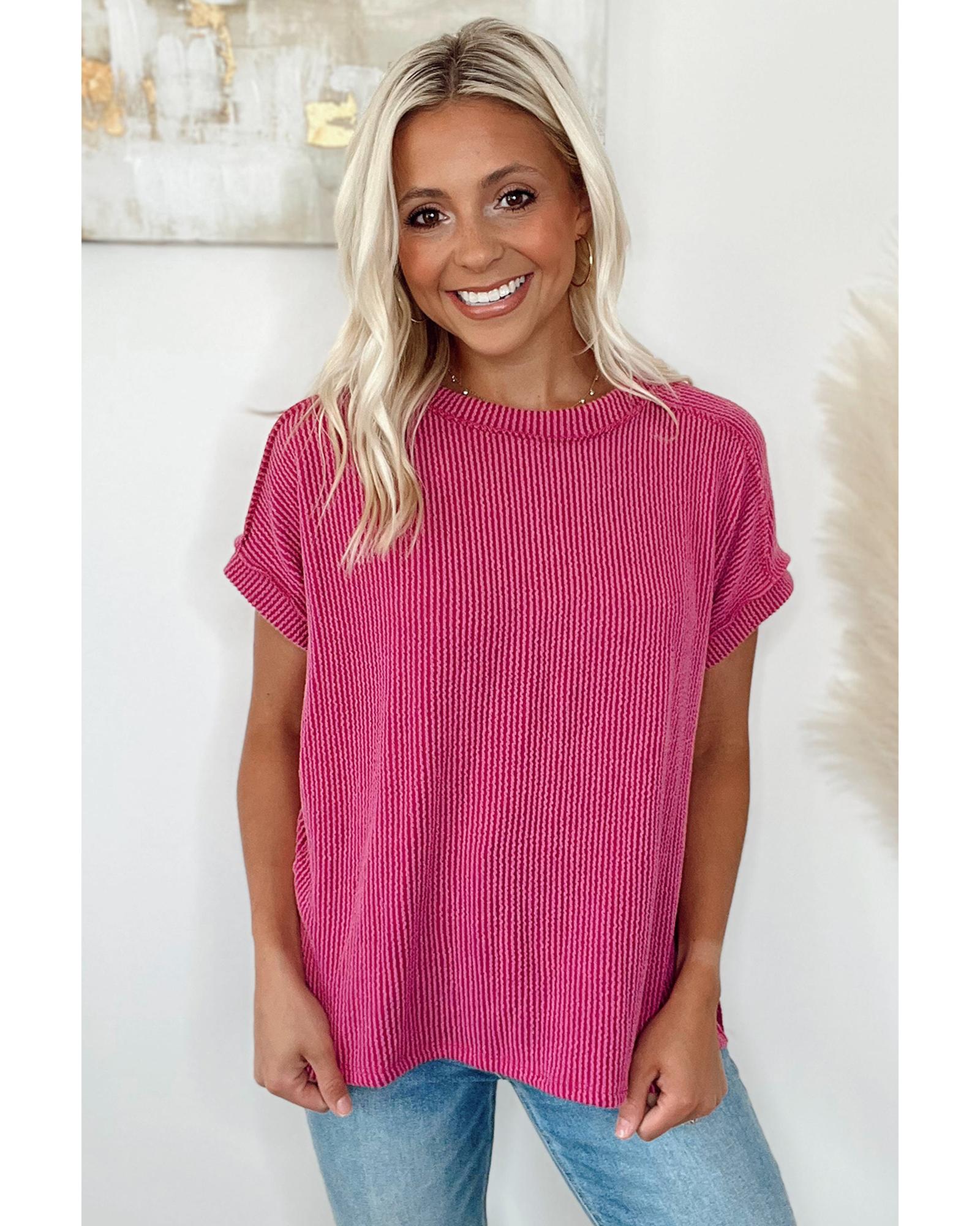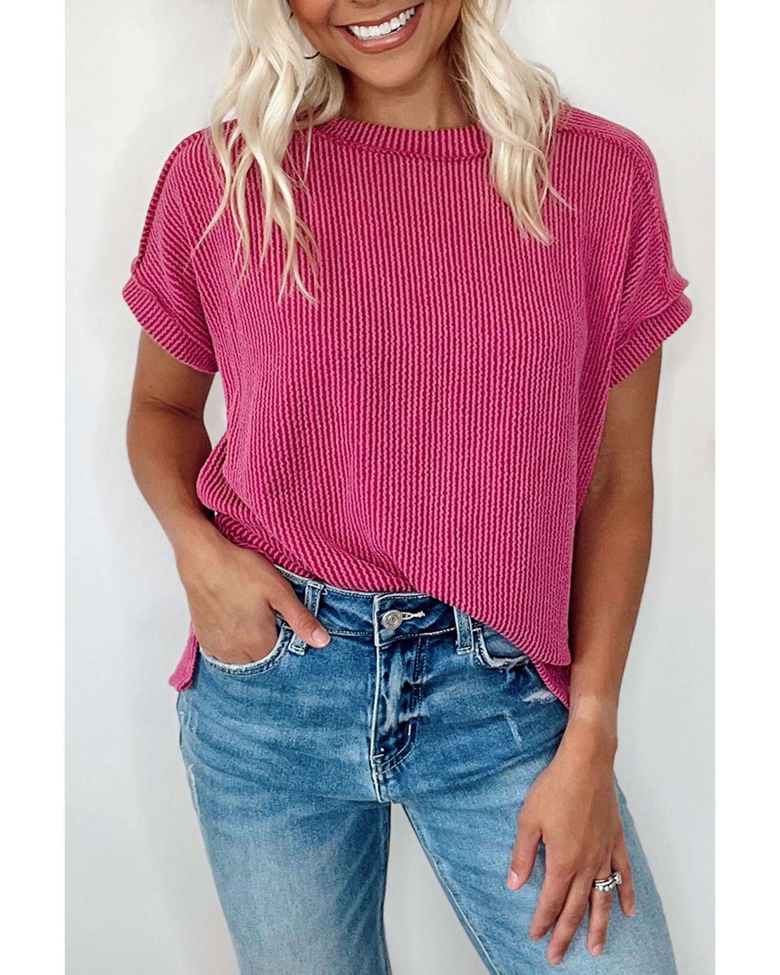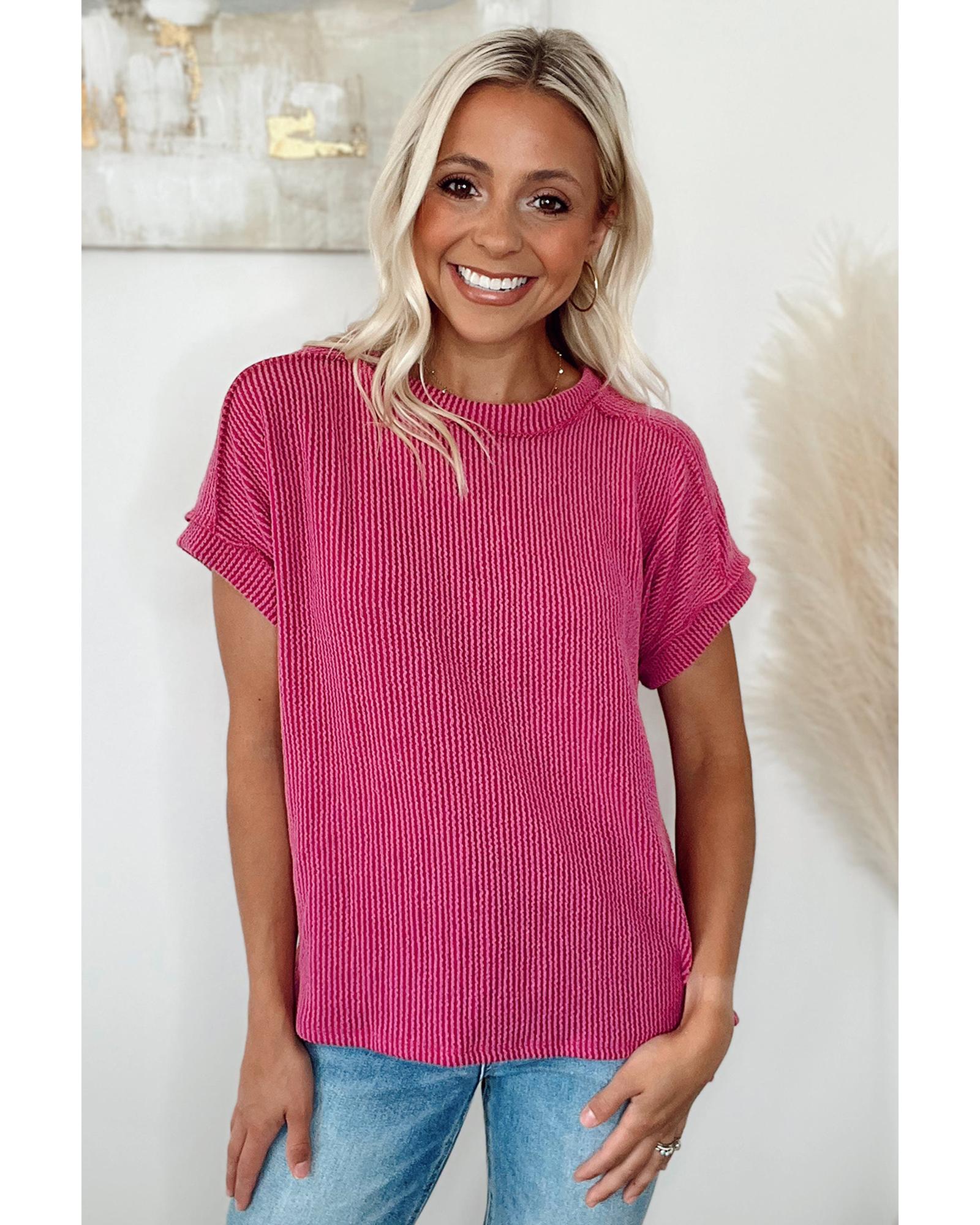 - Rose Red Textured Knit Exposed Stitching T