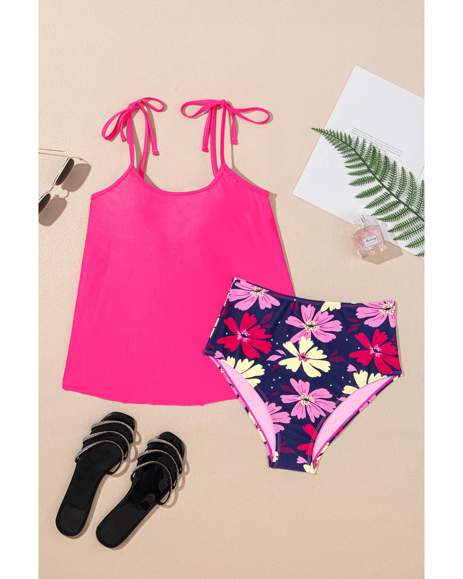 Rose Red Tie Shoulder Floral Print Cute Tankini Set – M