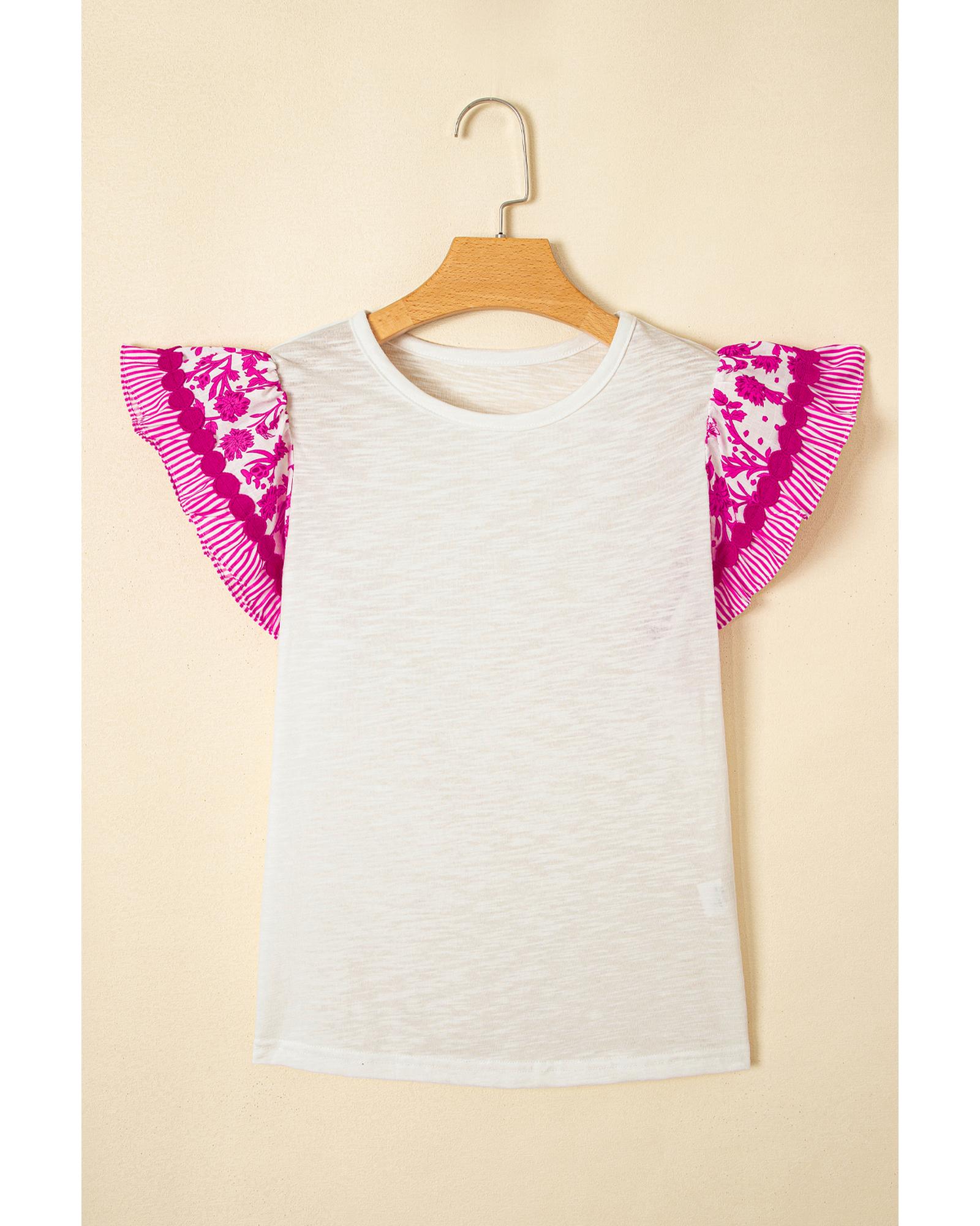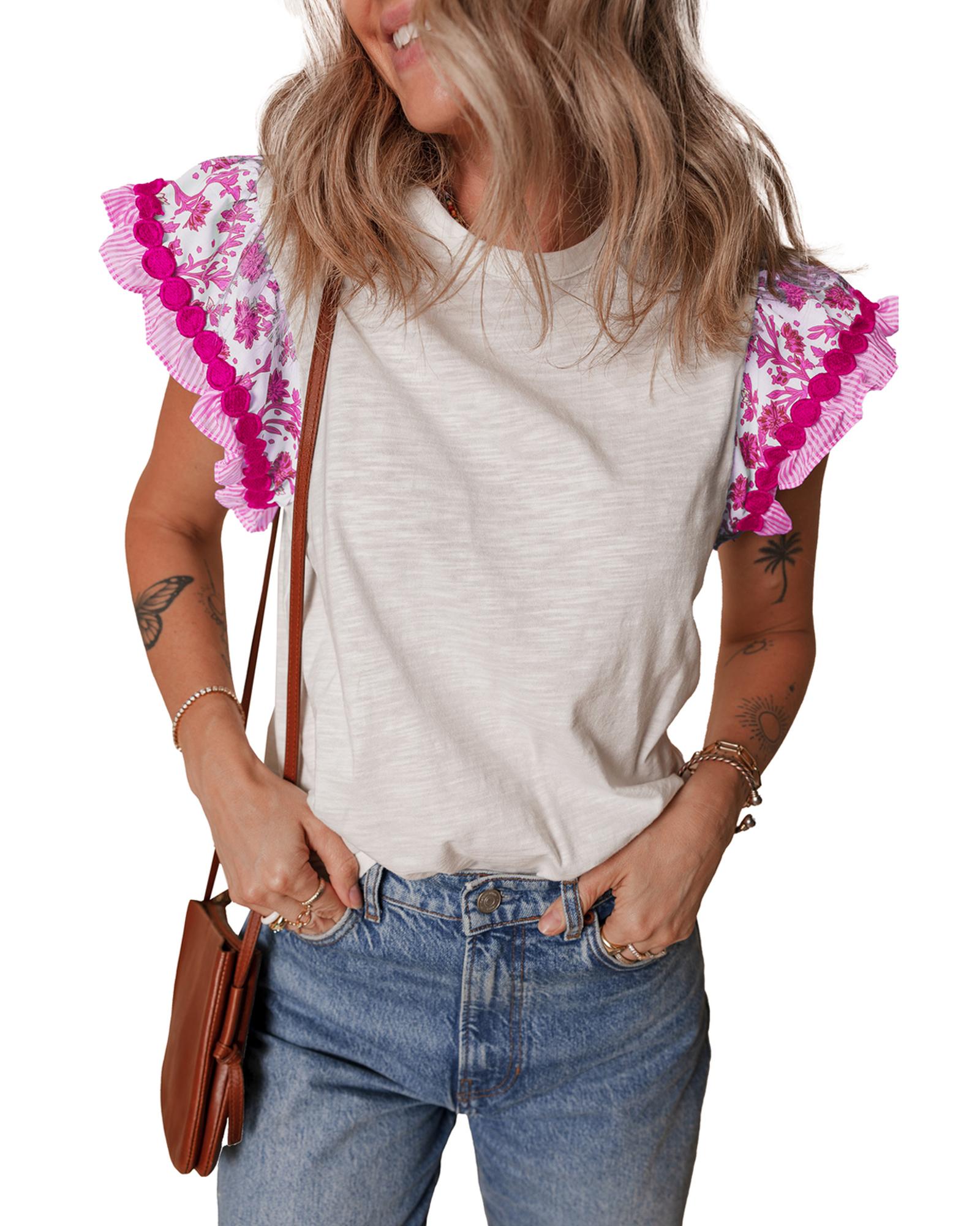 Rose Ricrac Trim Printed Flutter Sleeve Contrast Patchwork Blouse – S