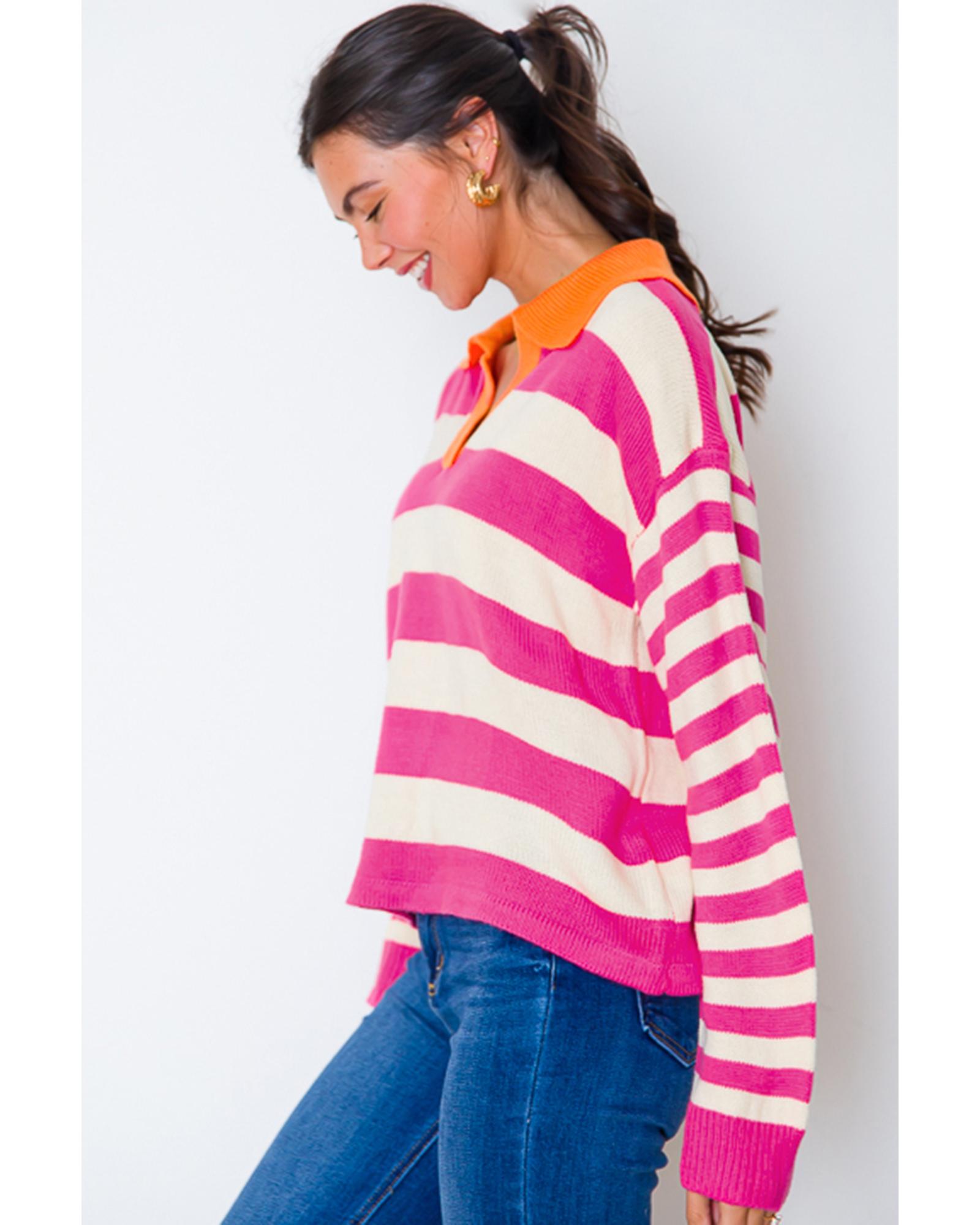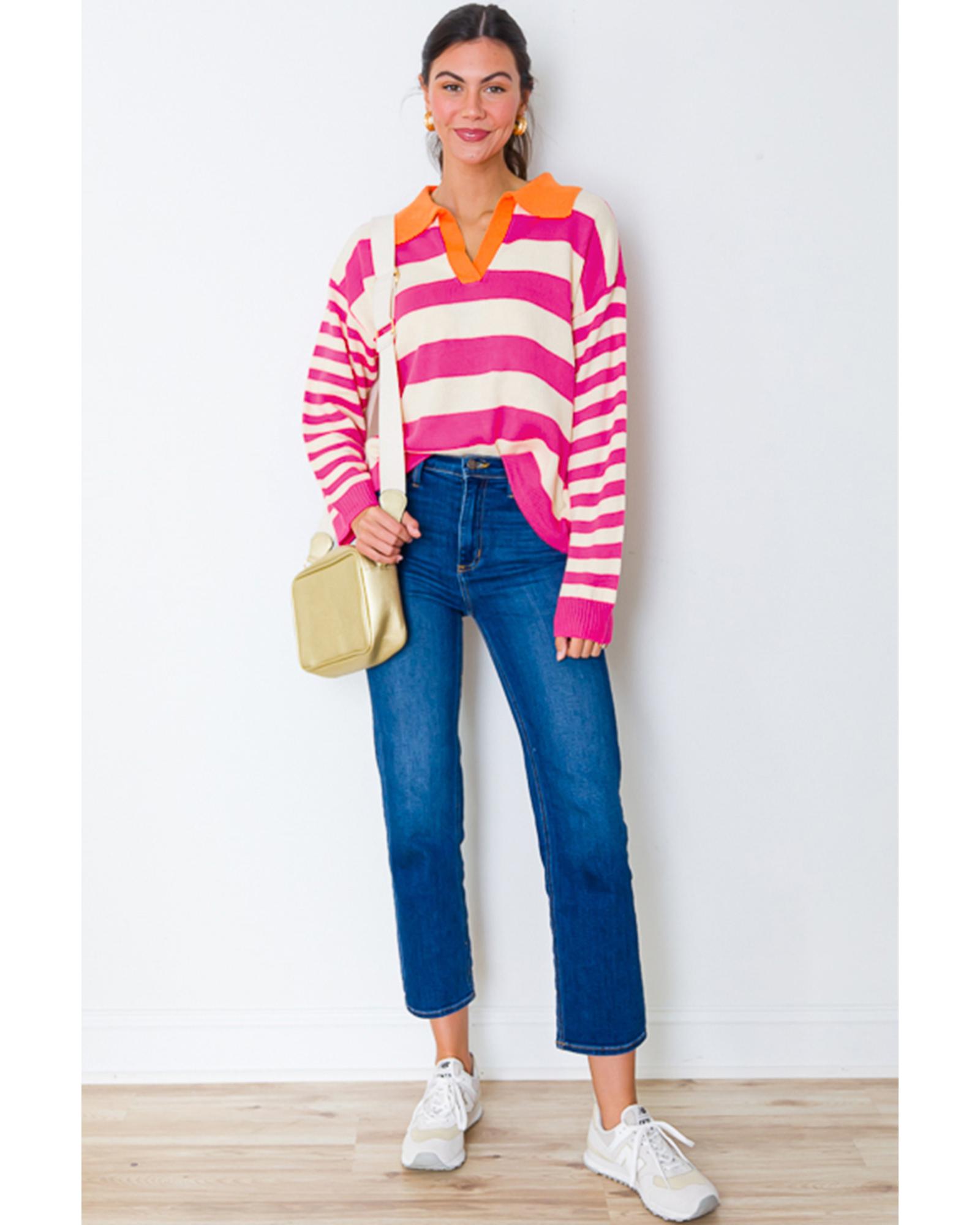 Rose Stripe Color Block Collared V Neck Drop Shoulder Sweater – L