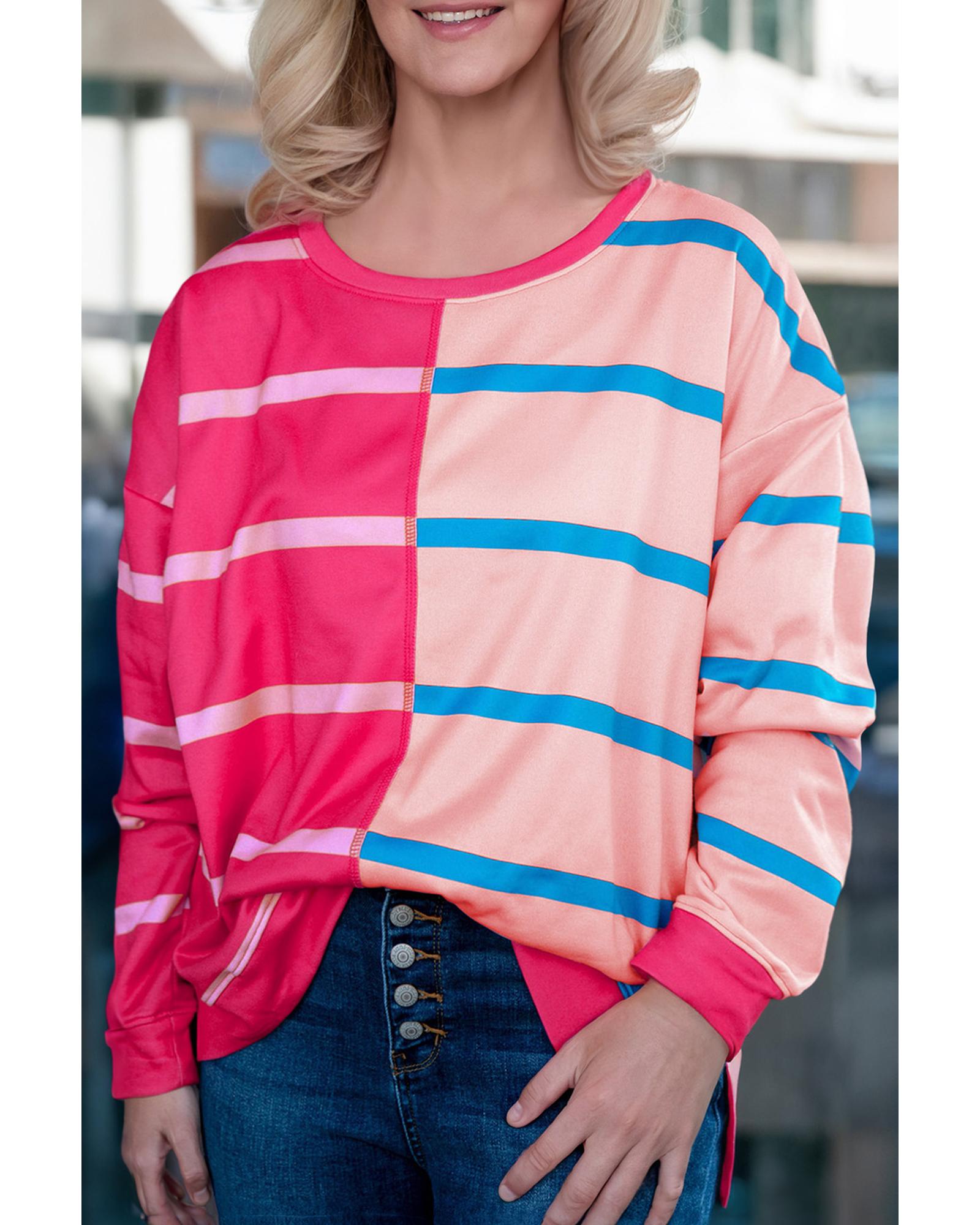 Rose Stripe Color Block Crewneck Long Sleeve Plus Size T Shirt – 3X