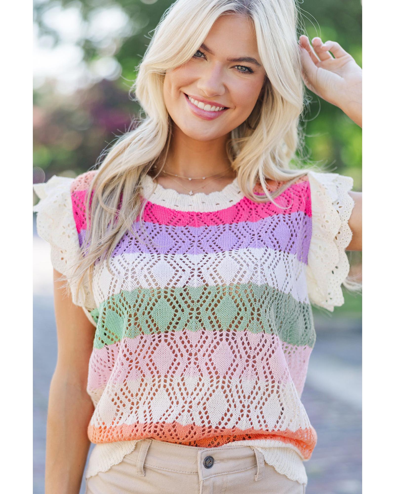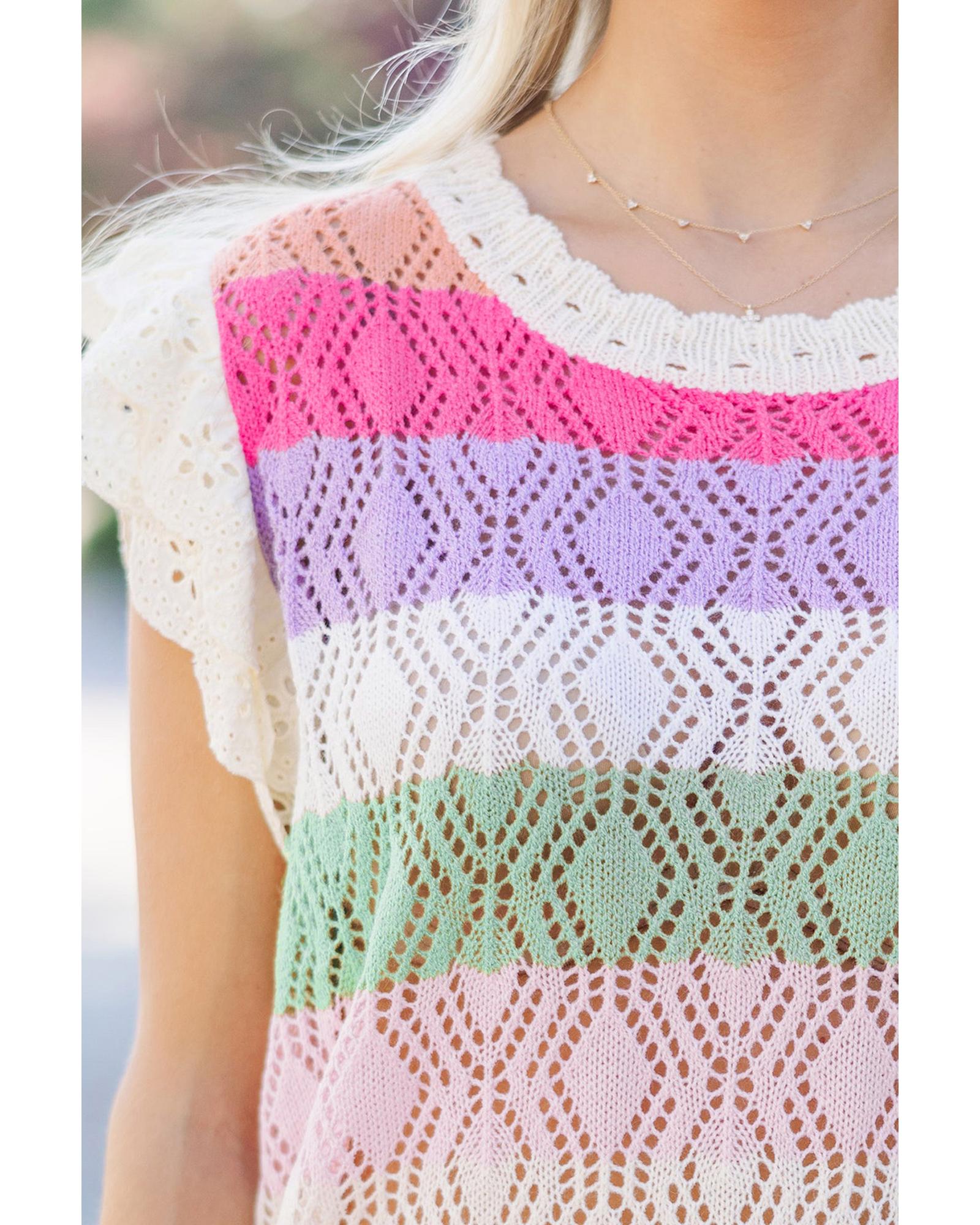 Rose Stripe Colorblock Hollowed Knit Scallop Edge Sweater Vest – L