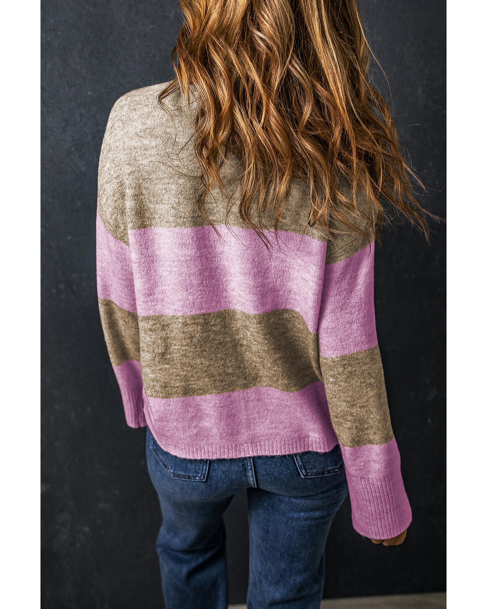 - Luxurious Rose Stripe Crew Neck Wide Sleeve Colorblock Sweater