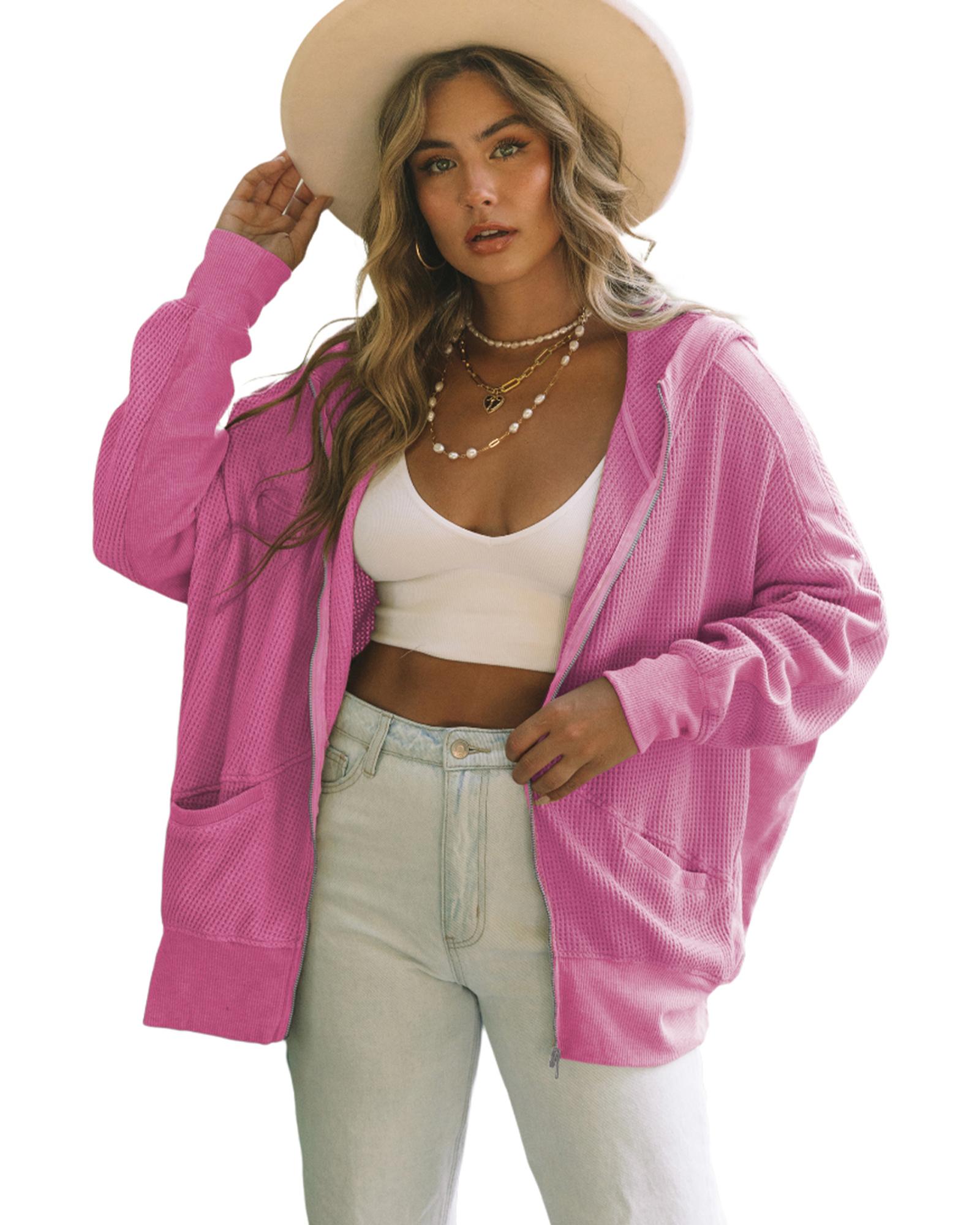 - Cozy and fashionable Rose Thermal Waffle Knit Full Zipper Hooded Jacket